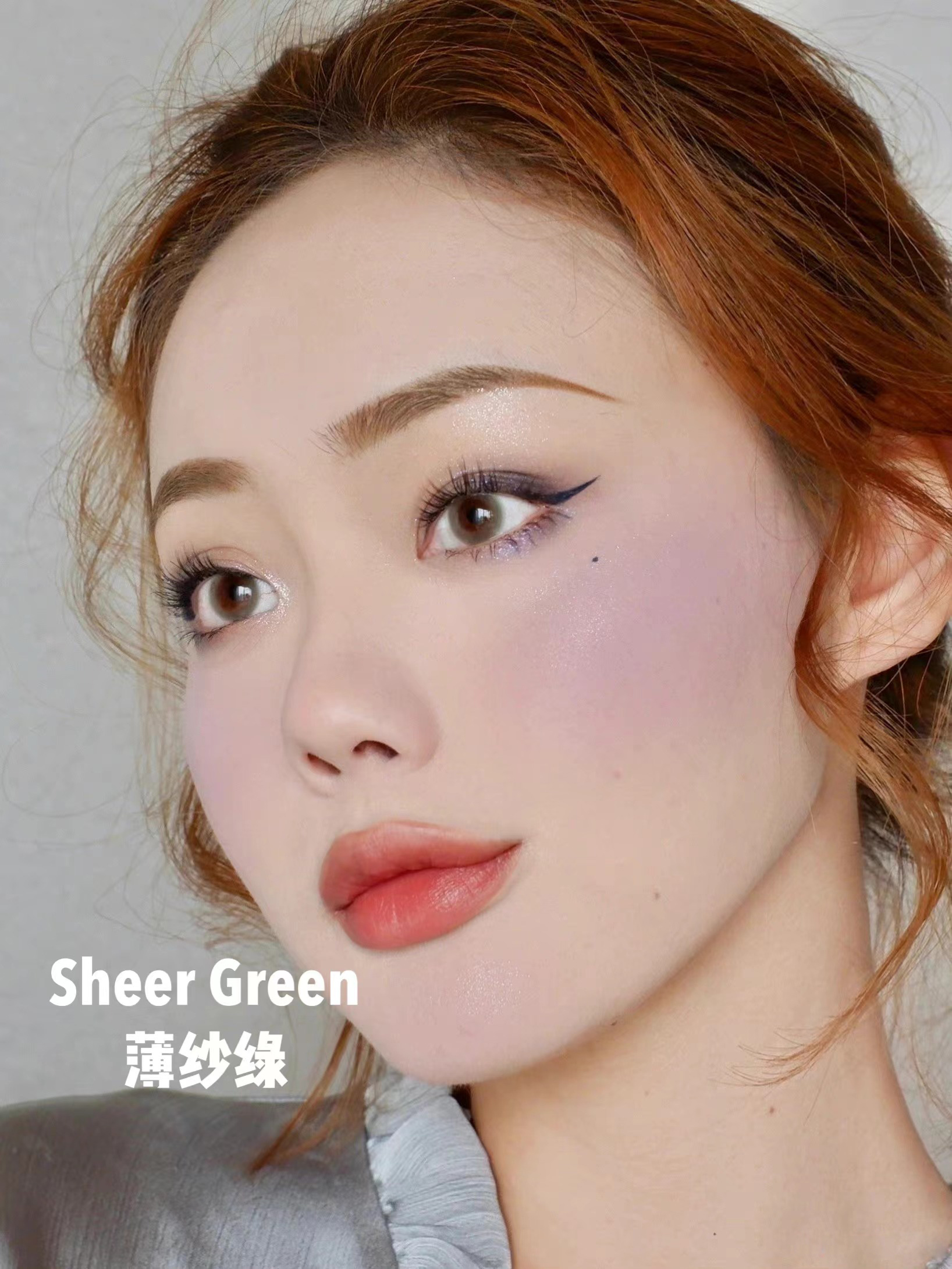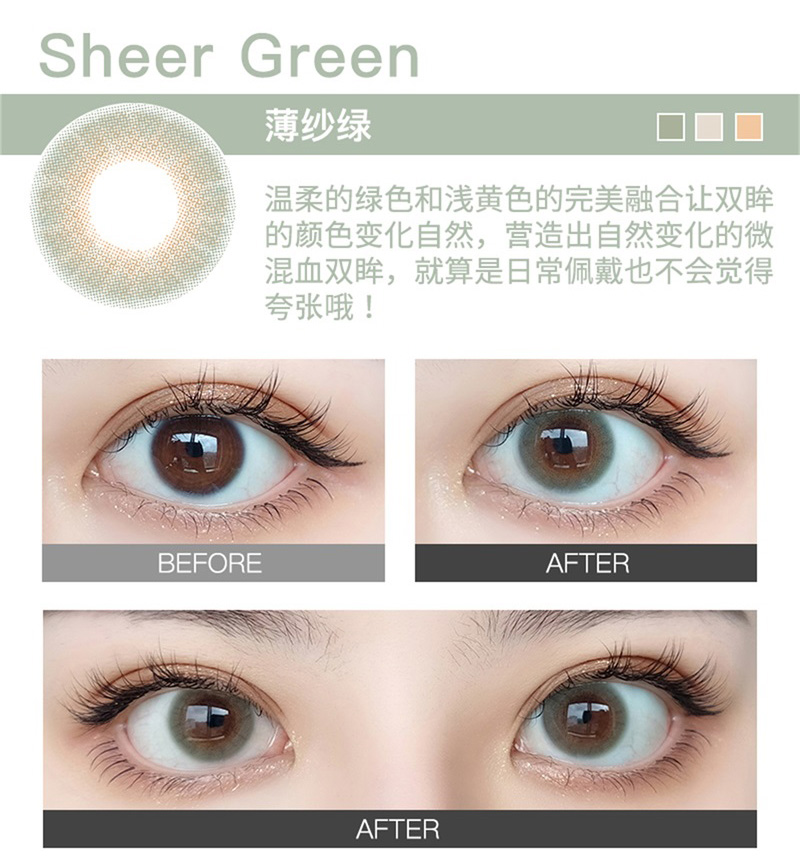 Sheer Green薄纱绿,是这系列美瞳里相对特别色,我很喜欢!是比较清透的墨绿,搭配橘棕,能和瞳色很融合地重叠在一起,有点低调的异域风情哦!
