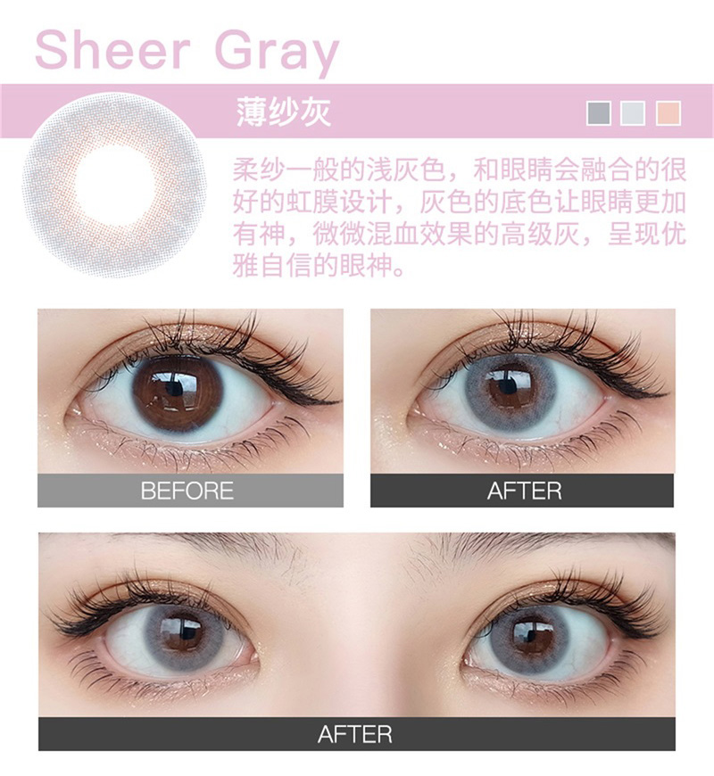 Sheer Gray薄纱灰,敲好看!浅浅的灰色跟原本深邃的瞳色结合,能过度出亮眼效果,自然扩瞳,深瞳变浅瞳!