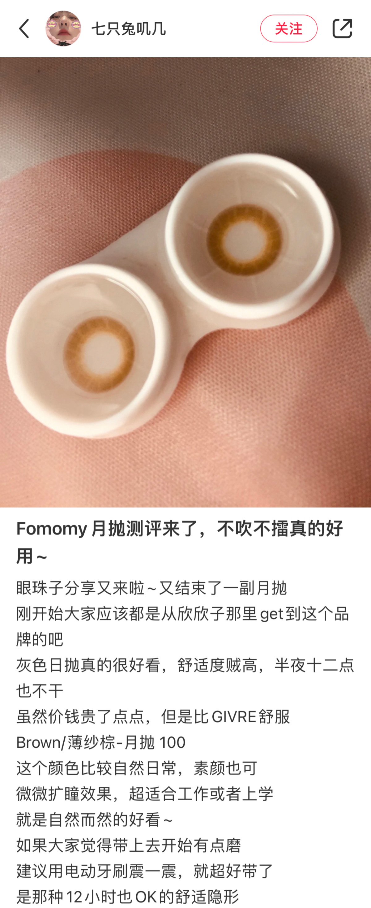 作为一个戴隐形眼镜超20年的1200度大近视,我还是很有发言权的。之前上过的几款年抛美瞳也算是年抛里的佼佼者了,但是要说舒适度,那确实日抛坠优,月抛次之。相比每天都要更换的日抛,月抛从性价比上来说会更好一些,含水量又比年抛高,镜片厚度又比较薄,非常舒适,适合每天都戴!日本FOMOMY在2020年火到ins的TOP3,更因为欣欣子自称囤货100盒而全网断货……所以,真的,推荐!