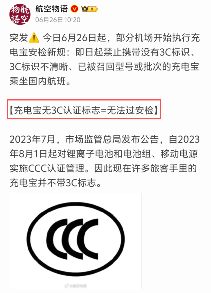 这个规定开始实施后,好多旅客因为充电宝没有3C认证过不了安检!!