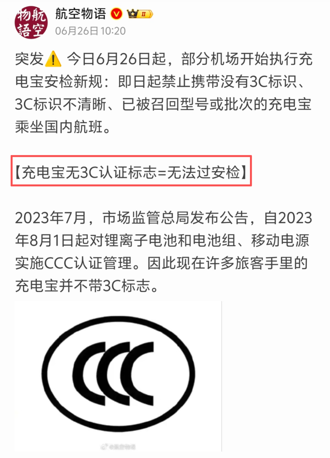 ⚠️自6月28日起禁止旅客携带没有3C标识、3C标识不清晰乘坐境内航班!