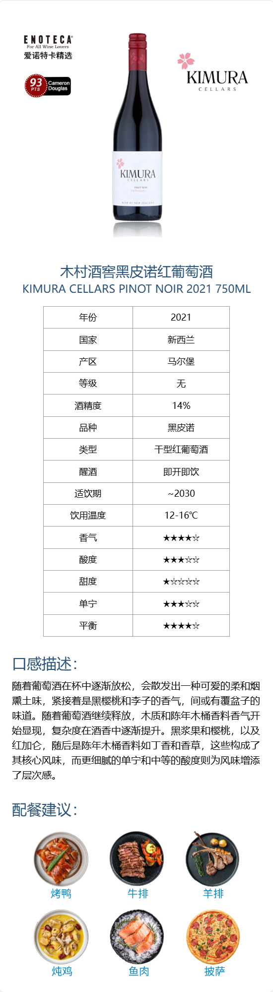 木村酒窖黑皮诺红葡萄酒 2021 750ml