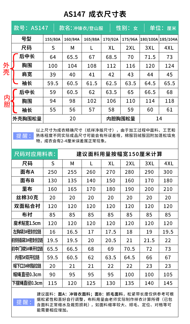裁缝学苑AS147冲锋衣纸样女装三合一抓绒内胆外套登山服打版裁剪样板