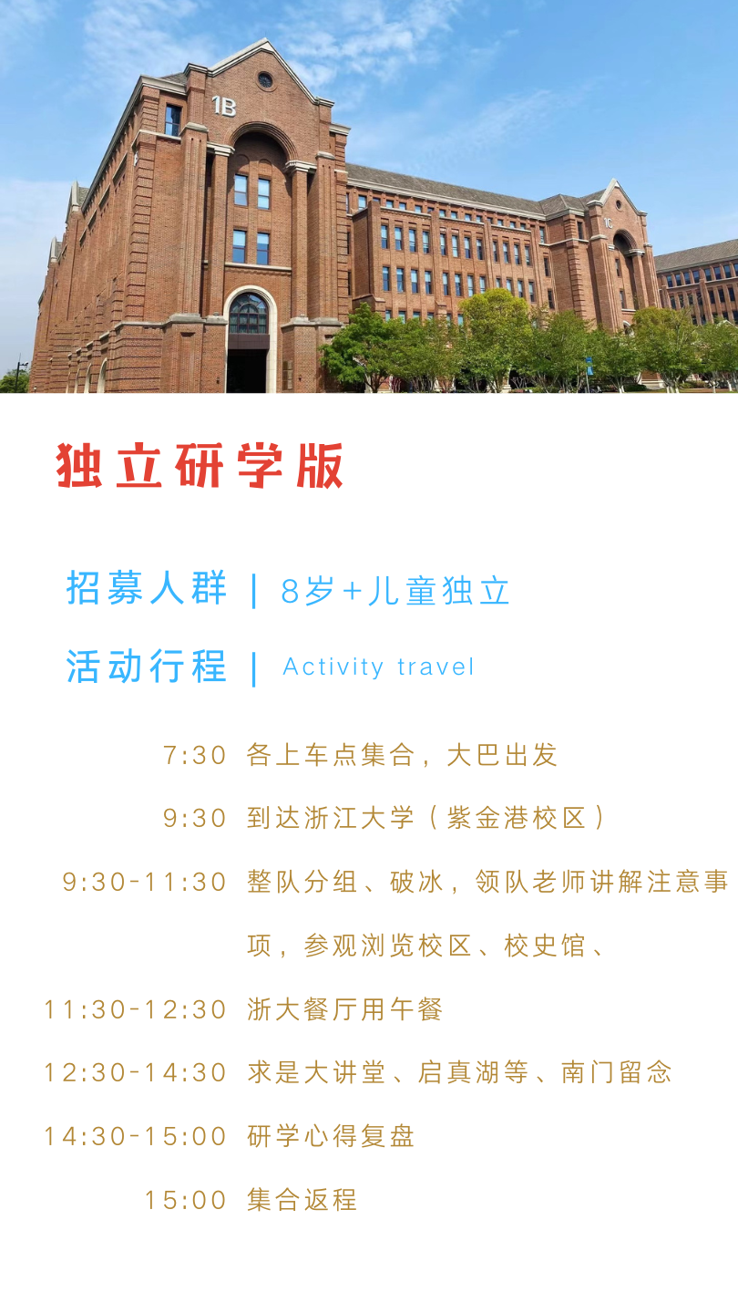 孩子志 | 浙江大学 研学独立营【VIP优惠】10/3、10/7,8岁+儿童独立,领队1:6全程陪护,感受名校气息、参观校园、文化博物馆..(6人可自组队,到家接送)