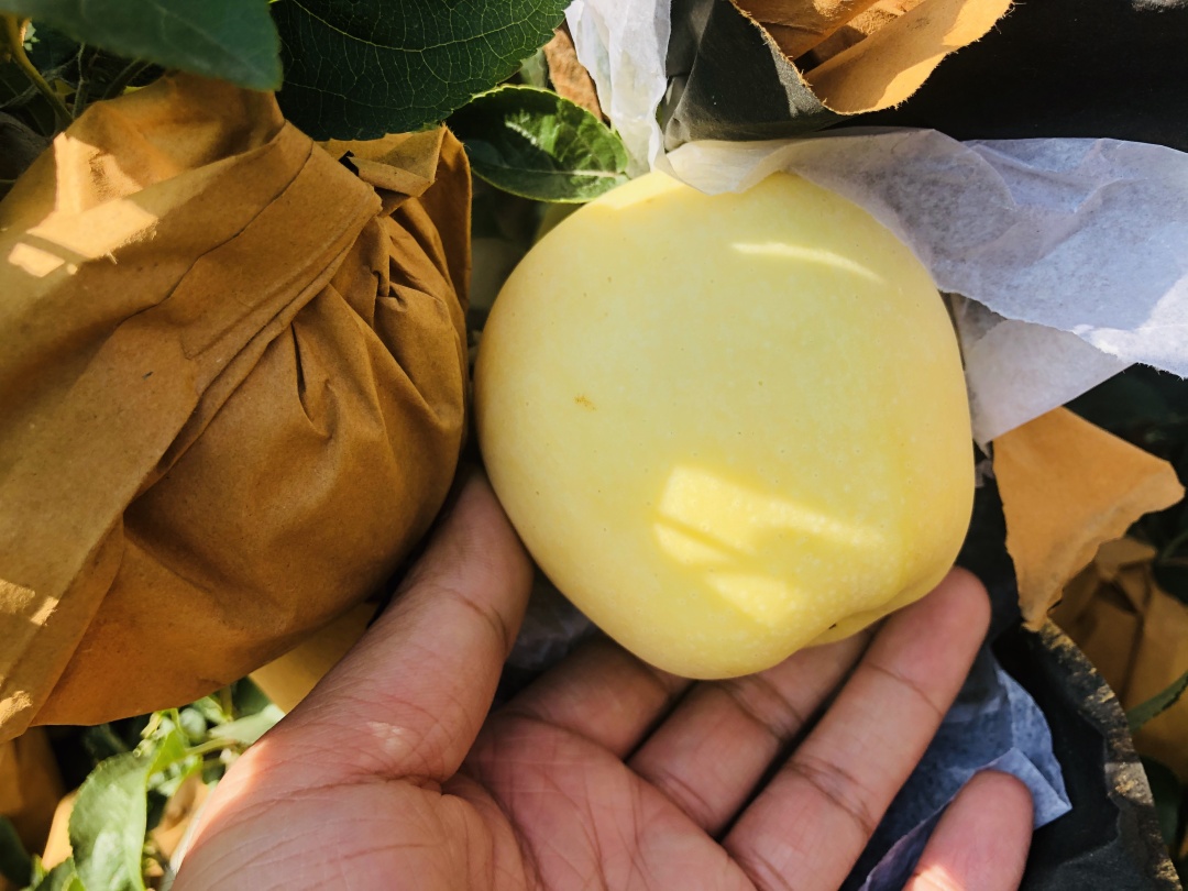 我们第一年上市开卖的时候,由于几乎没人吃过甚至都没见过,很多人将它误认成另一个老品种——金帅(也叫黄香蕉、黄元帅等等名字),这也难怪,因为它就是以这个盘踞中国市场长达半个世纪的老品种为母本培育的。
