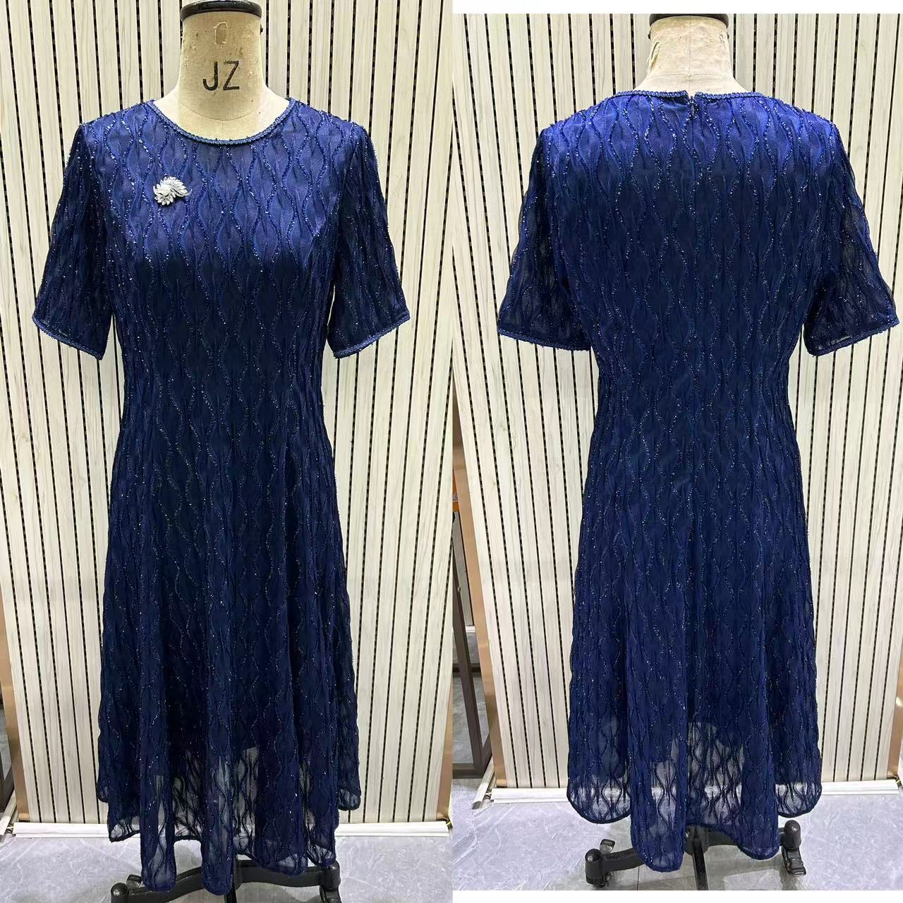 HJ1S68_帝释青色_轻奢连衣裙_四季_名媛风圆领短袖水波纹网纱收腰显瘦胸针装饰气质_高级女装_BERNIEELEN 伯妮斯茵