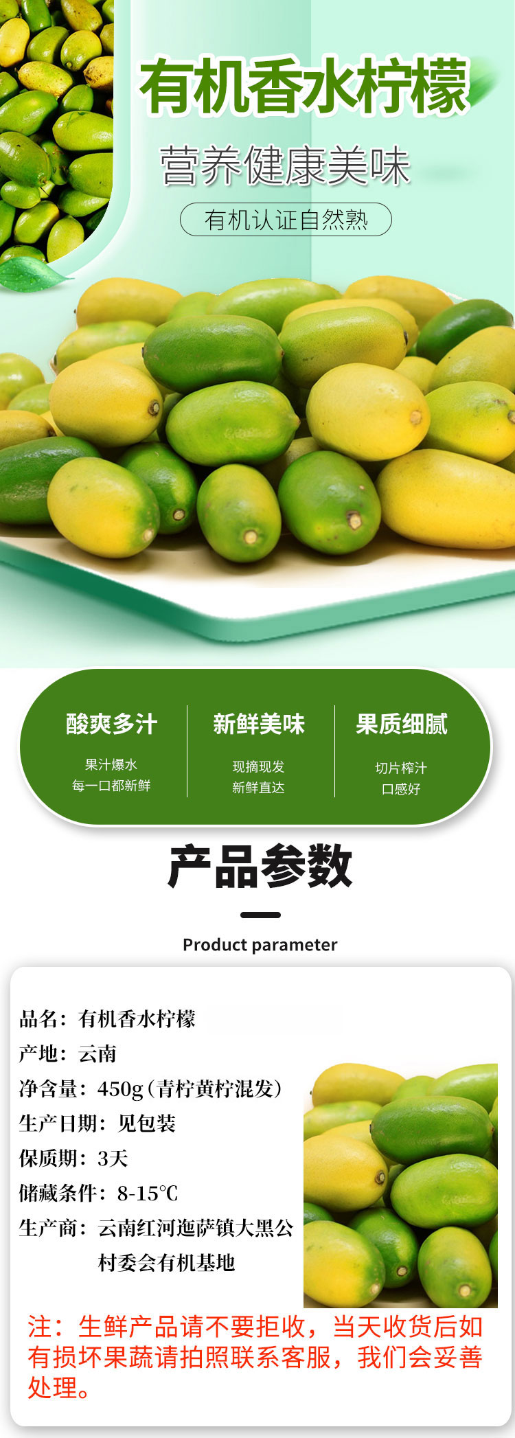 无籽有机香水柠檬450g 青柠黄柠随机发京津冀满额包邮