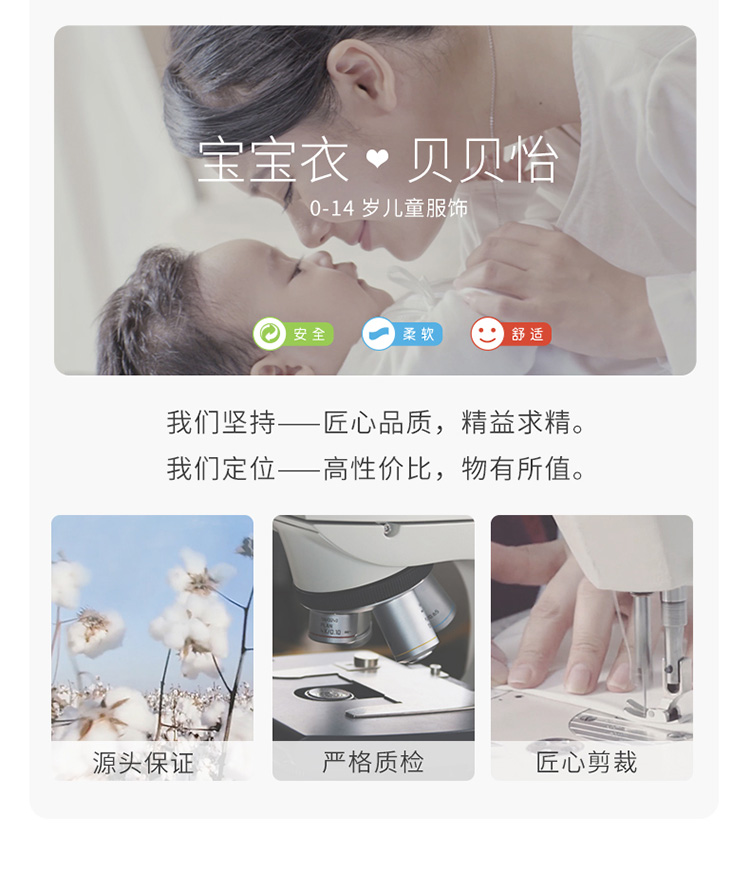 - 贝贝怡专注0-6岁婴幼儿服饰,坚持安全、柔软、舒适的产品理念,为千万中国家庭提供超高品质、安全可靠的婴幼儿服饰产品,妈妈放心,宝宝开心!