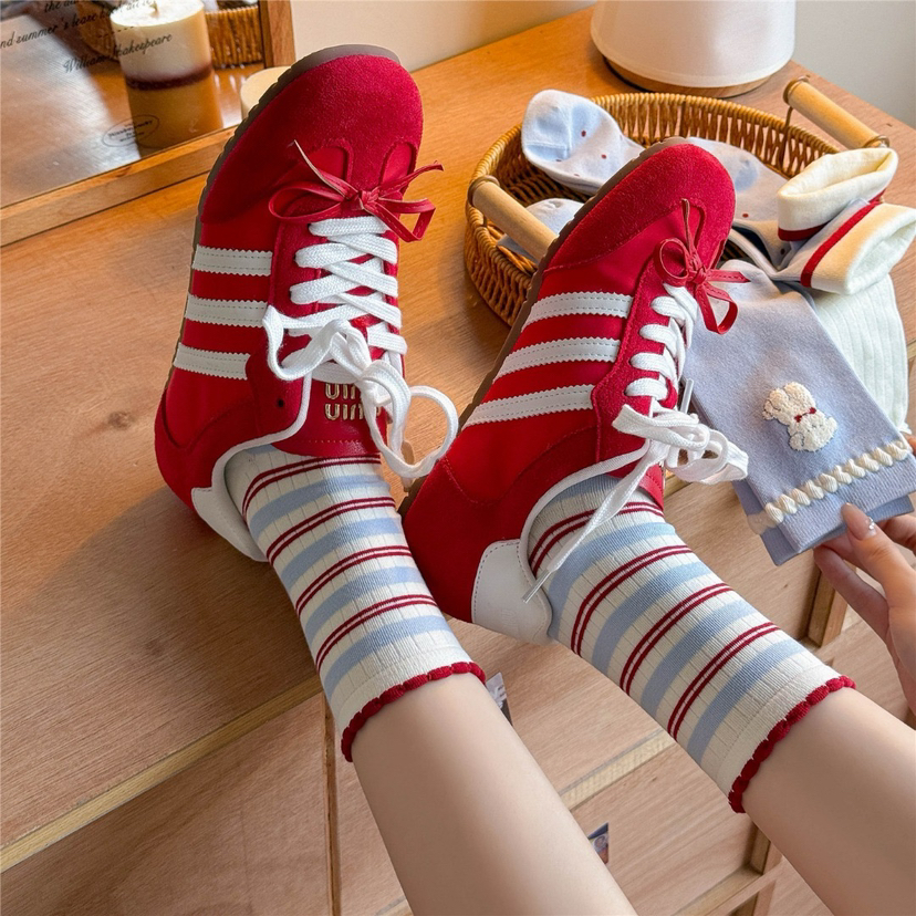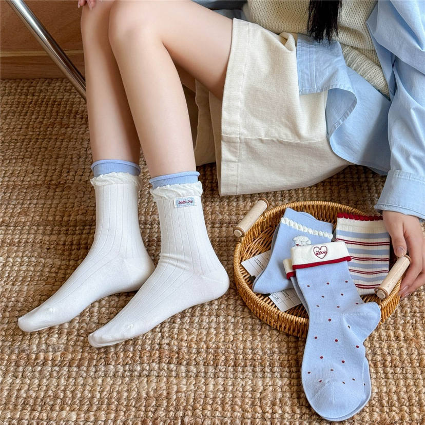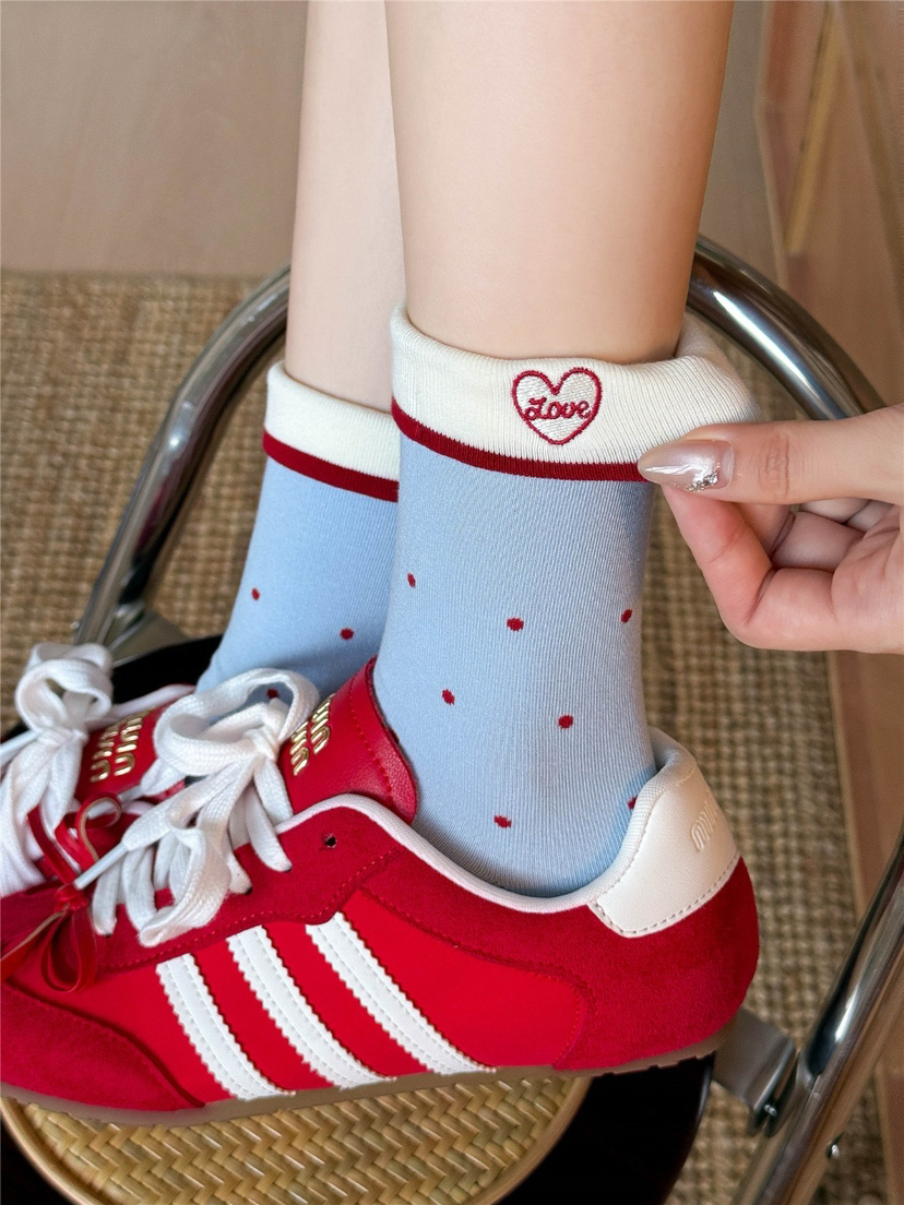 4双一组!2025秋冬无骨袜棉袜 毛茸卡通狗、翻边小爱心设计 浅蓝色和新年红的经典色系搭配 洋气中筒袜