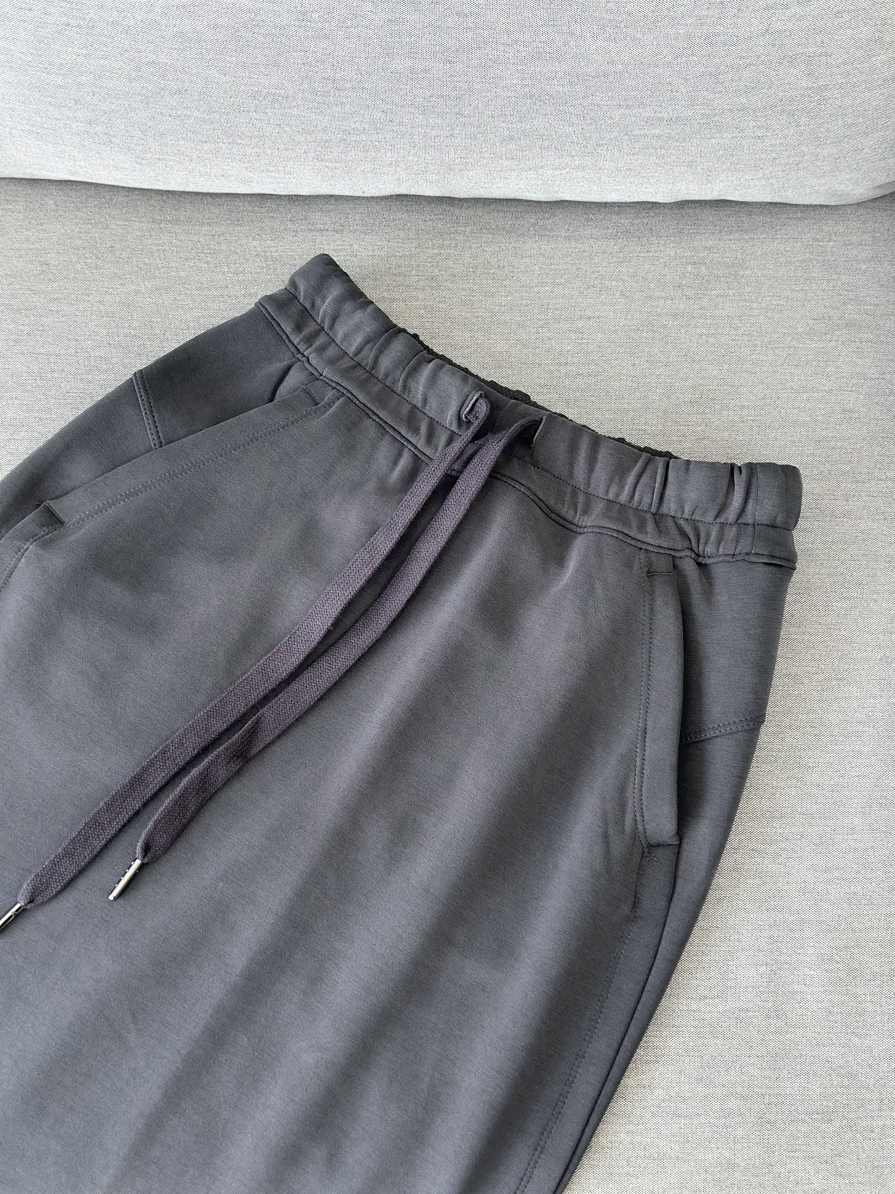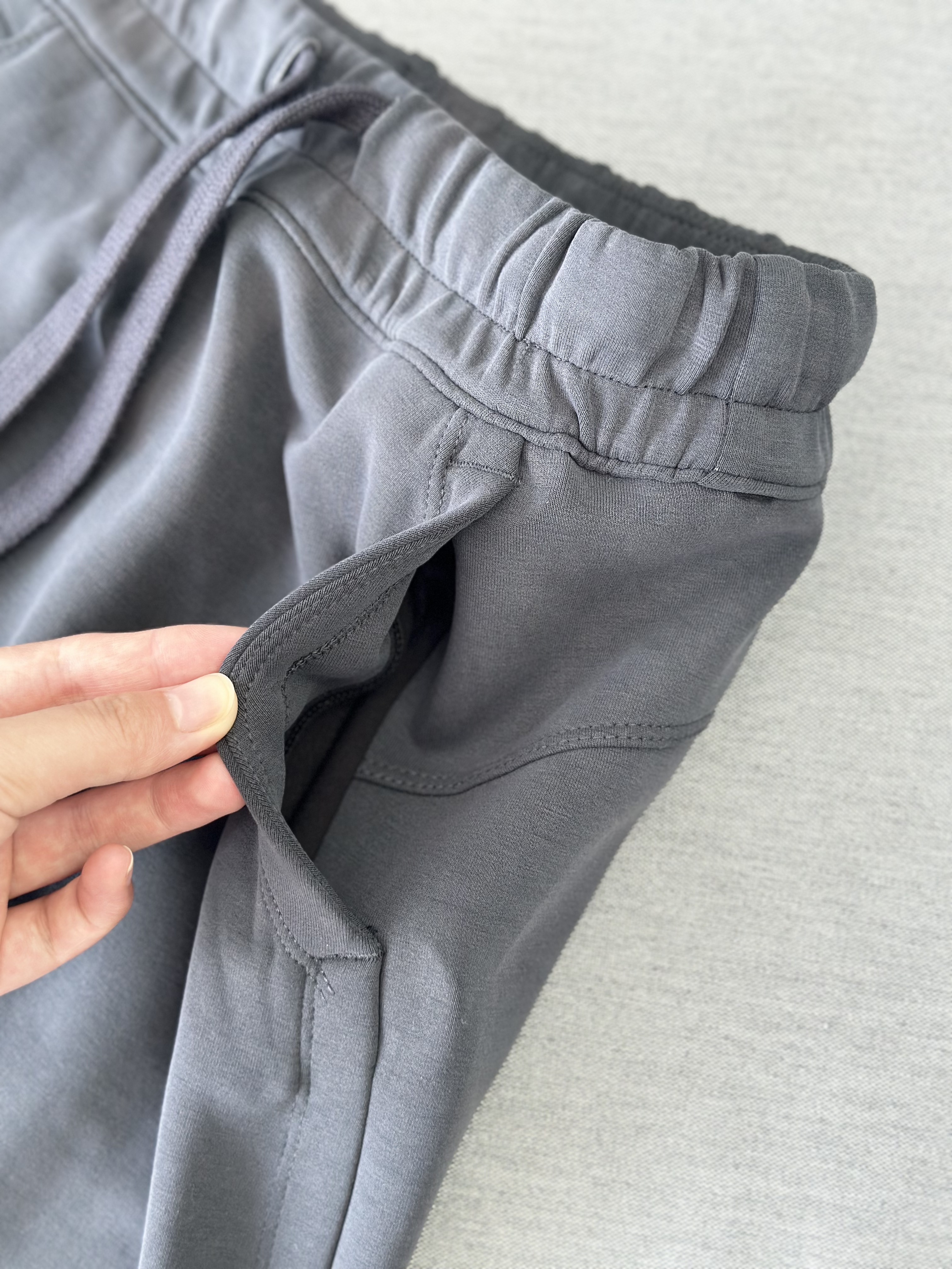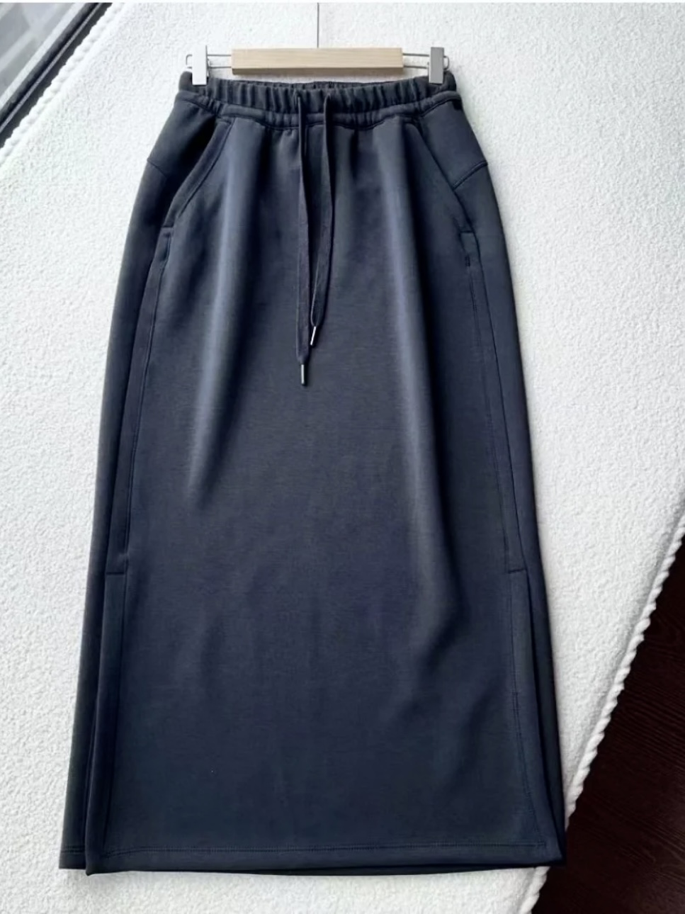 裙摆裁片是前片窄于后片的设计,这样会更显瘦一些5cm弹力宽腰+抽绳调节,收腹不勒斜插口袋内布是连接一体的