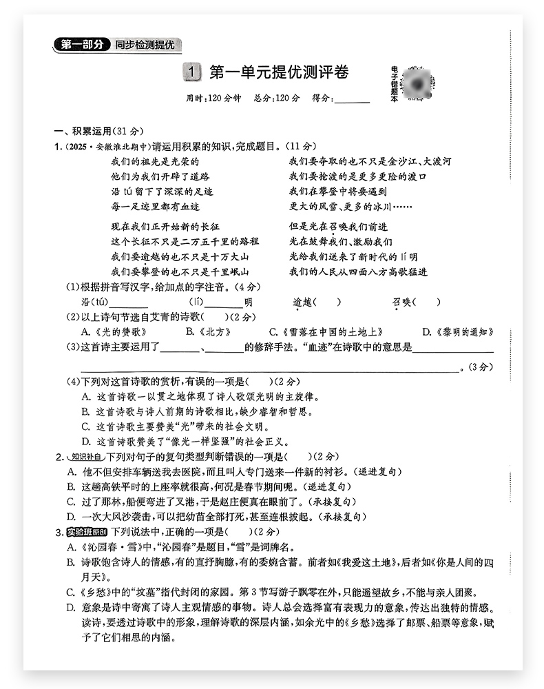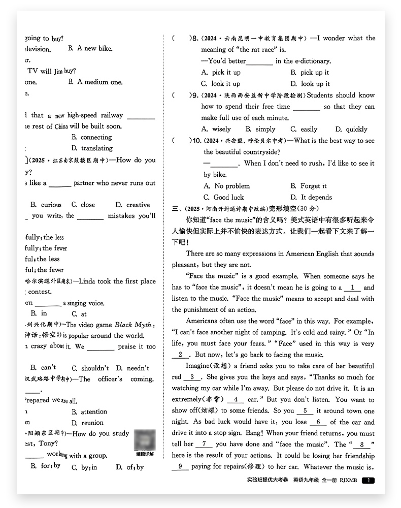 2025秋版实验班提优大考卷上册七八九年级同步训练单元卷期中期末达标提优真题复习