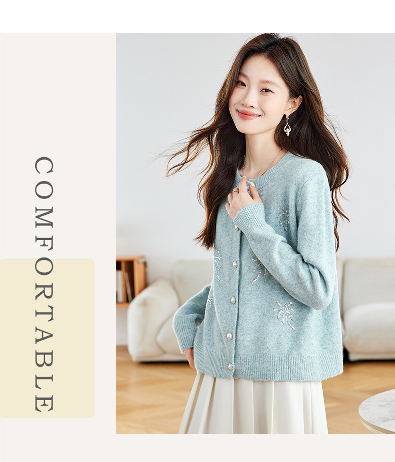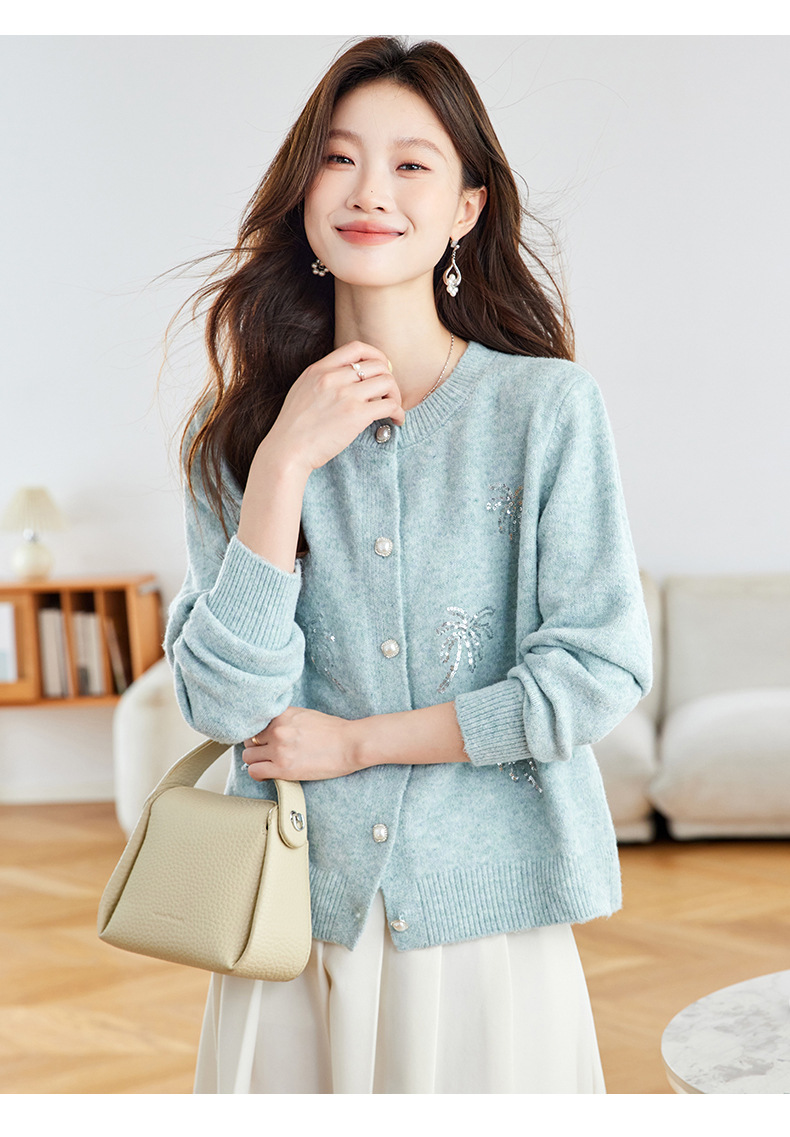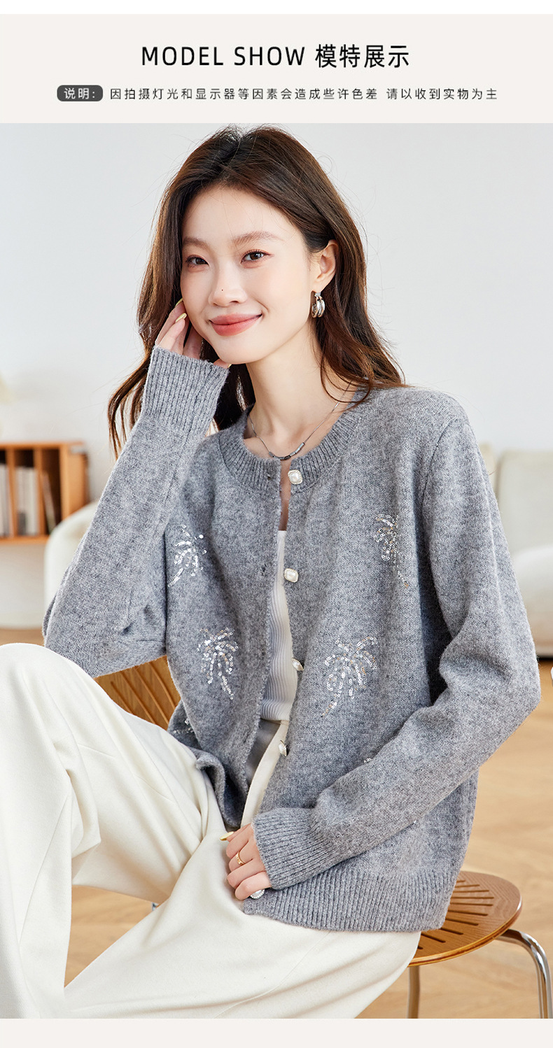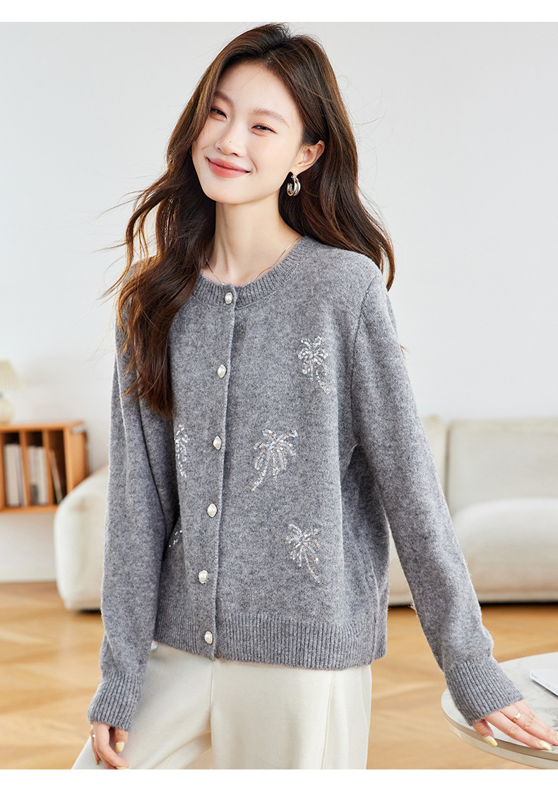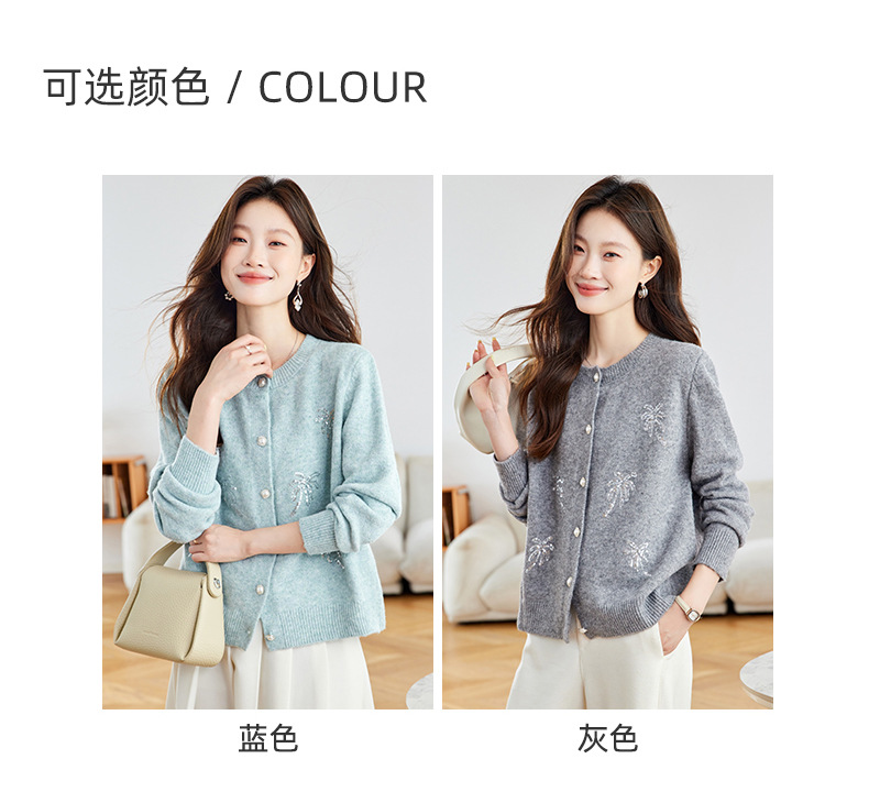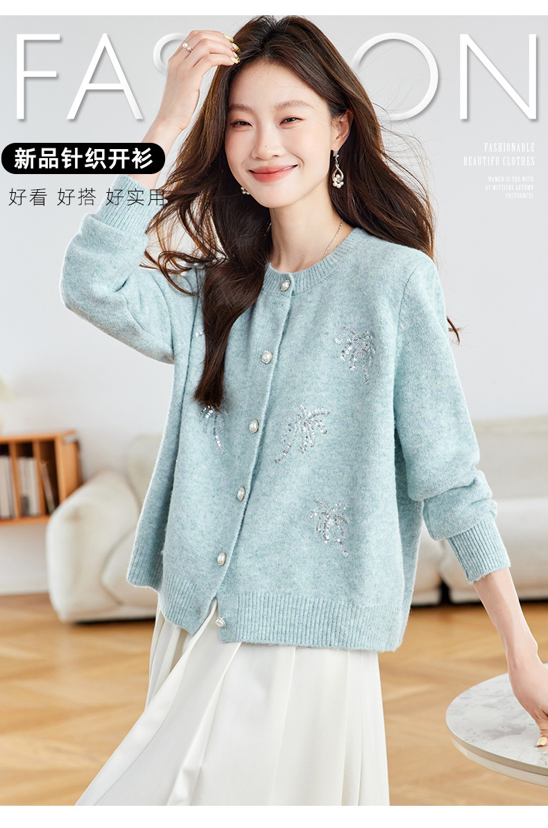 CC2025春秋新款圆领针织开衫女宽松刺绣钉珠毛衣外套上衣薄早秋外搭
