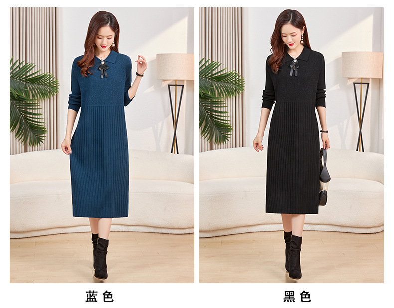 秋季娃娃领中长款针织连衣裙,女秋冬配大衣内搭洋气翻领打底毛衣裙CC-E82315