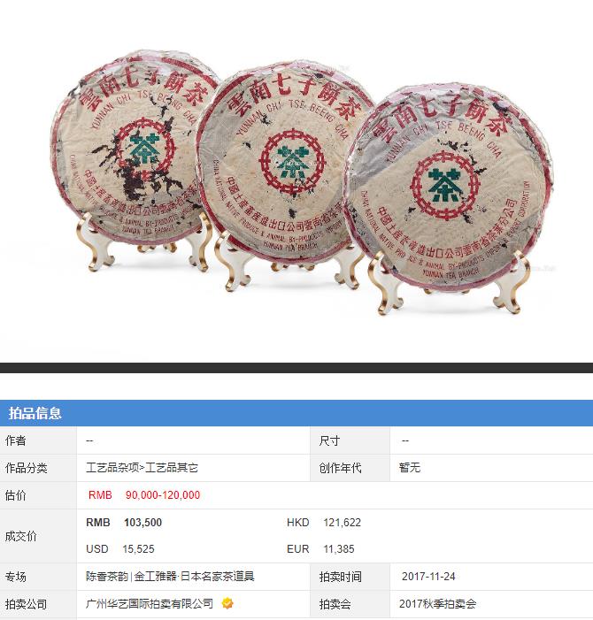 更让行家难忘的是2017年的秋季拍卖会,一款7572熟茶以103500元3饼的天价成交,刷新当年普洱熟茶的成交纪录!