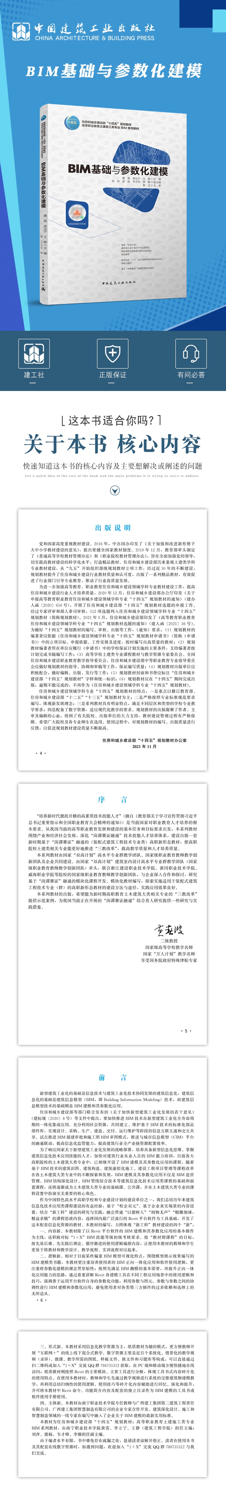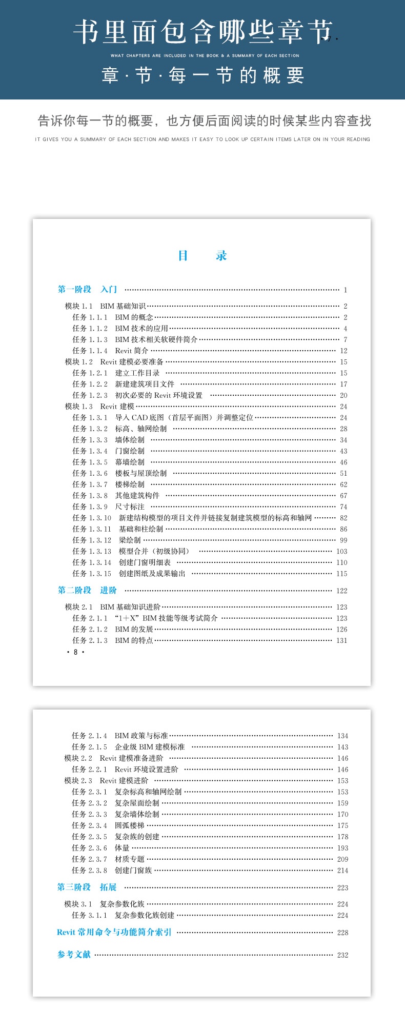 教材内容分为三个阶段共7个模块,可灵活选择,适合不同情况的读者。 (1)第一阶段3个模块的教学内容,通过一个体量适中的建筑物建模任务令初学者快速地初步了解BIM理论知识,初步掌握Revit建模方法以及熟悉Revit这个软件的使用逻辑,以便在后续的学习中做到举一反三。该阶段涵盖“1+X”BIM技能初级的基础知识点和技能点,对没有用到的命令、功能及操作技巧不作过多介绍,以免过多的信息扰乱初学者的思路,以至于偏离了“注重软件使用逻辑的培养”这一重点。 (2)第二阶段3个模块的教学内容按照“1+X”BIM技能初级考评大纲的要求,以经典案例(BIM等级考试真题)的方式介绍进阶的建模方法、命令及操作技巧,适合活页式教材出版形式,方便随时更新最新的案例或修订已有的案例。 (3)拓展阶段的内容主要是强化复杂的参数化建模方法,同样以经典案例的方式呈现,同样适合活页式教材出版形式。 (4)初学者适合从第一阶段开始学习,学完第二阶段即可满足“1+X”BIM技能初级的考核要求,学完拓展阶段可满足“1+X”BIM技能中级对建模的考核要求。若已经学习过Revit软件的使用方法,可直接学习第二阶段的内容,以满足“1+X”BIM技能初级的考核要求。