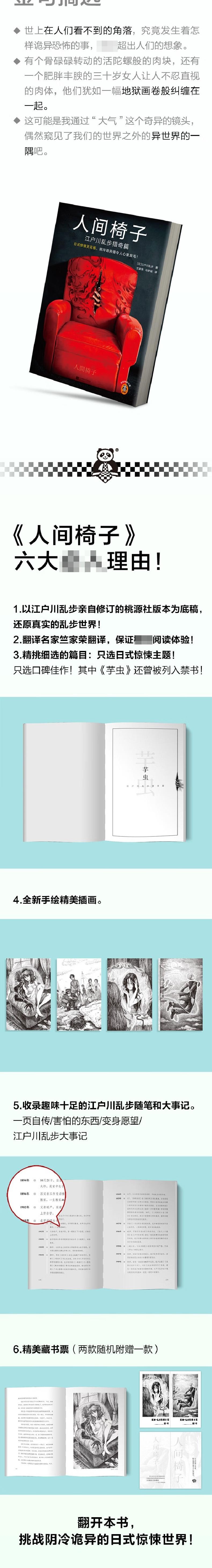 ◆ 日式惊悚天花板,阴冷诡异得令人心里发毛! ◆ 江户川乱步是日本推理小说之父,东野圭吾、岛田庄司也深受他影响! ◆ 通读江户川乱步全部作品,筛选出8篇好看的惊悚杰作!其中《芋虫》还被列入禁书! ◆ 当怪人藏身你家椅中,当丈夫失去四肢,当推理作家亲手实施犯罪……8个精选名篇,带你直窥人心隐秘的角落! ◆ 江户川乱步亲自修订的底稿+趣味随笔+大事记,还原鲜活真实的乱步世界! ◆ 再现内文情节的手绘插画+赠送精美藏书票+竺家荣翻译的生动内文,打造强乱步作品! ◆ 日本推理史上有如此高成就的,只有乱步一人。——岛田庄司(推理作家) ◆ 翻开本书,挑战阴冷诡异的日式惊悚世界!