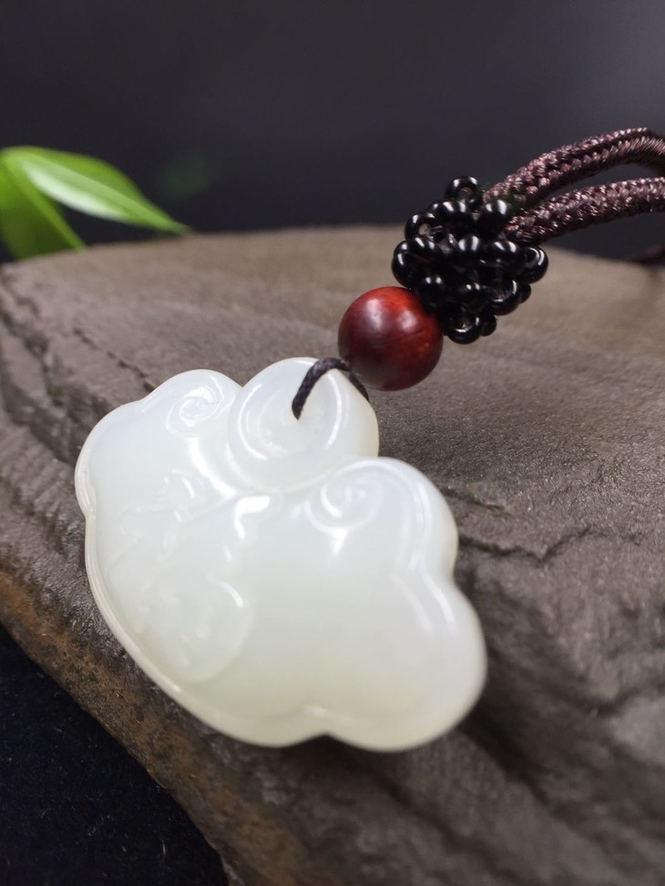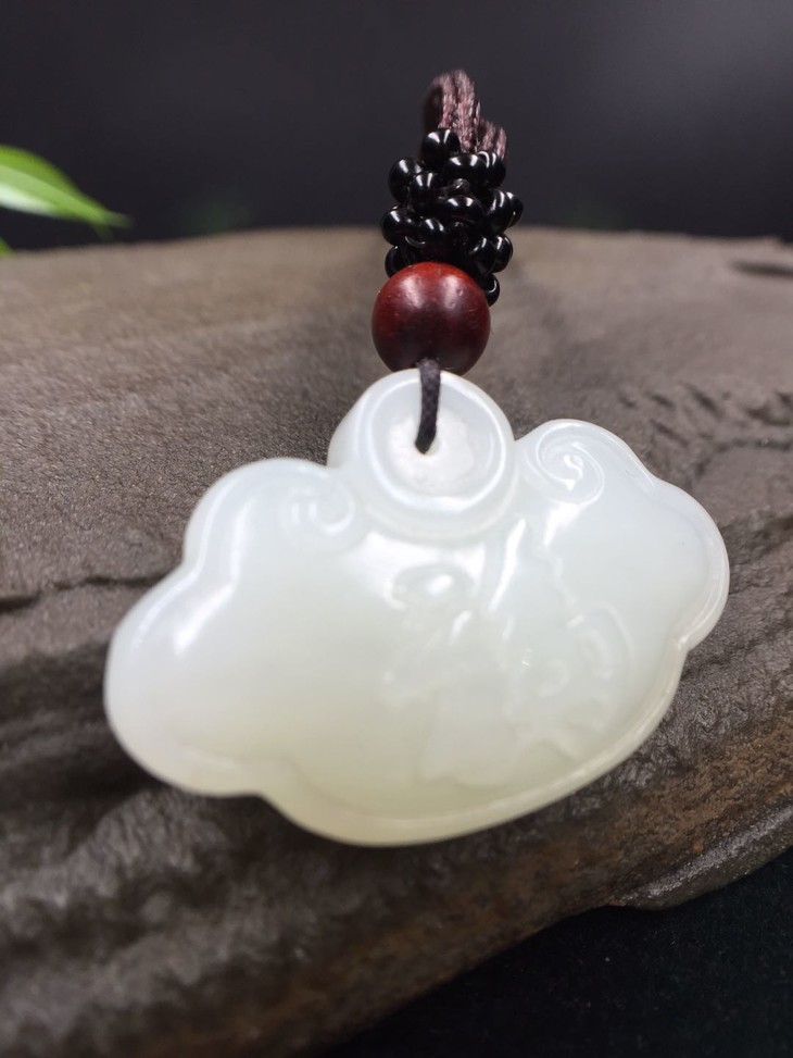 玉质细腻油润,精巧细致,形似锁状,作品浮雕福字,刻画细致,生动形象,灵巧自然,寓意守护安康,吉祥如意。