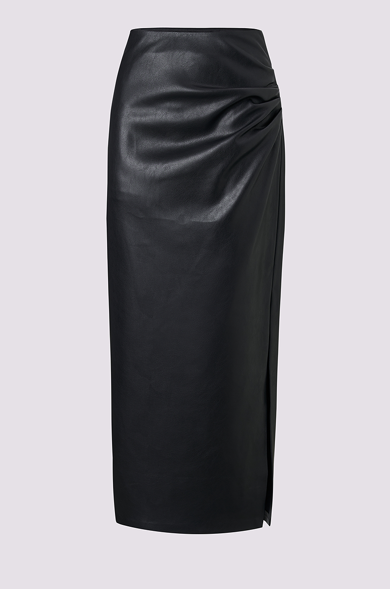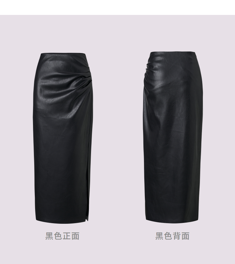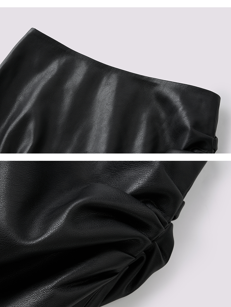 MAXRIENY黑色h型开叉包臀裙25秋款不对称小众设计压褶PU皮半裙(货号:MF86SK509)