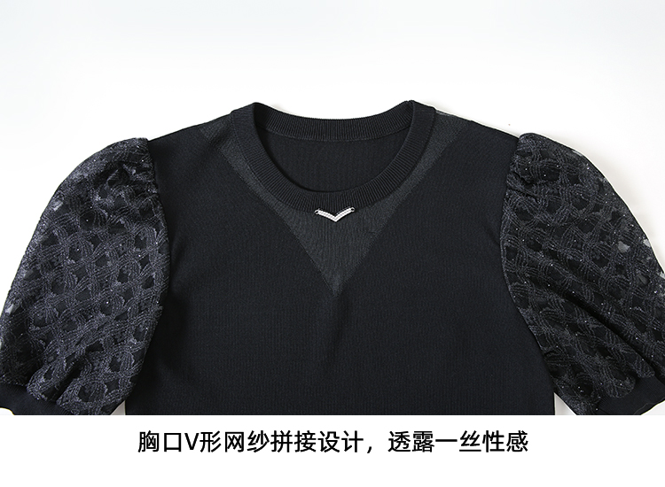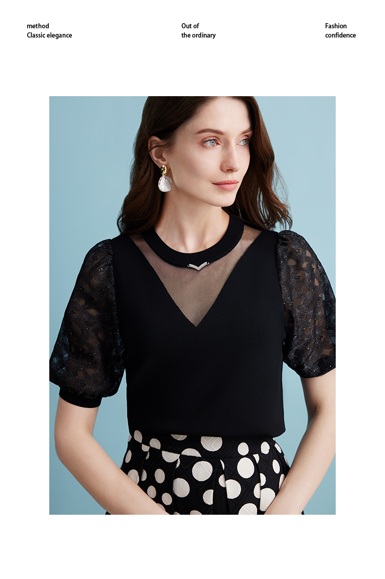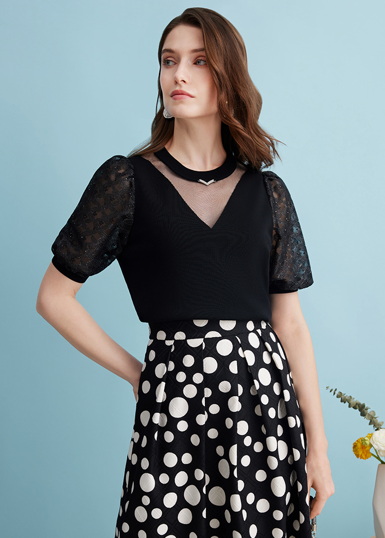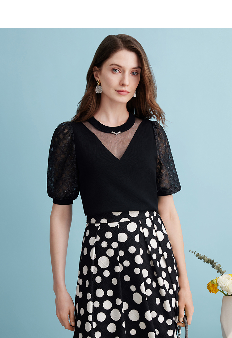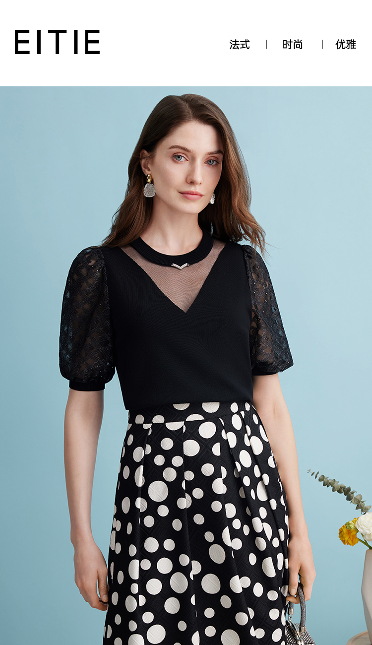 EITIE爱特爱夏季新款镂空网纱气质圆领黑色莱赛尔针织衫上衣B2401318