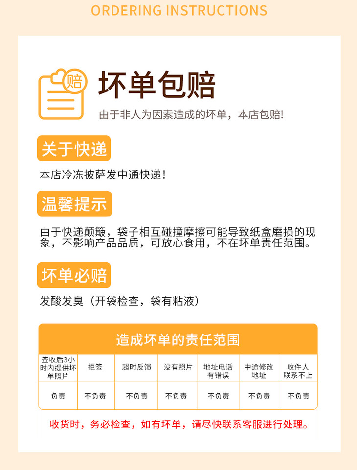 品名:芝士披萨组合 规格1:福气满堂套餐170~190g/盒*6盒(牛肉*1+肉香满溢*1+培根*1+香肠狂欢*1+芝士多多*1+蓝莓*1) 规格2:阖家团圆套餐170~190g/盒*8盒(牛肉*2+培根*2+肉香满溢*1+香肠狂欢*1+芝士多多*1+蓝莓*1) 规格3:经典五片套餐170~190g/盒*6盒(孜然烤鸡*1+肉香满溢*1+芝士多多*1+香肠狂欢*1+黑椒烤肉*1+随机1个口味) 规格4:儿童套餐套餐170~190g/盒*6盒(肉香满溢*1+芝士多多*1+紫薯披萨*1+蓝莓披萨*1+香芋披萨*1+随机1个口味);拍几份发几个包裹,不一定能同时到达,请耐心等待 发货地/产地:湖北 包装方式:盒装 物流信息:默认京东快递,不支持指定快递 发货区域:新疆、西藏、海南、内蒙、青海、甘肃、宁夏、黑龙江、吉林不发; 物流详情:周六、周日及节假日除外,正常48小时内发货,到货时间约为2~5天,请耐心等待 售后说明:收到货后有质量问题,在24小时内都可以拍照(坏果+快递单面箱子一起拍)上传,申请按坏果比例理赔或联系客服,生鲜性质特殊,因地址错误,手机号联系不上,拒收等造成的损失无法售后,请理解; |