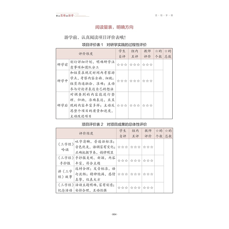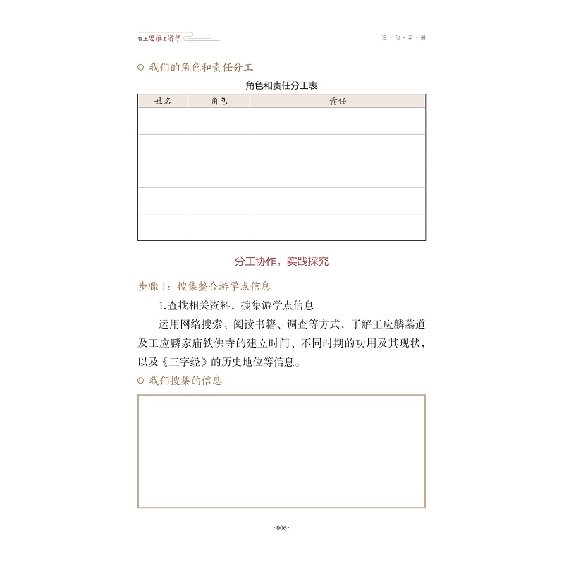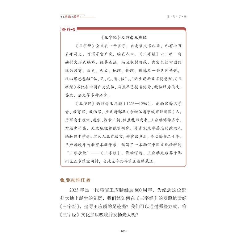 《我爱吾乡——带上思维去游学活动手册》是一本旨在引导学生通过实地游学深入认识家乡,培养学生热爱家乡、思考家乡发展的学生活动指导书。本书以“我爱吾乡”为主题,以驱动性任务为载体,引导学生用科学的方法进行研究性学习。为了方便同学们了解游学点,每个游学点都配有内容丰富的游学点打卡视频,供同学们在游学前做好知识的储备。本书是一本极具实践指导价值的活动手册,它不仅适用于学校教育中的课外活动,也适合家庭在假期中使用,为学生提供一个既有趣又有益的学习方式。通过这样的活动,学生不仅能够更好地了解和热爱自己的家乡,还能在实践中学会如何将知识应用到现实生活中,为未来的学习和生活奠定坚实的基础。