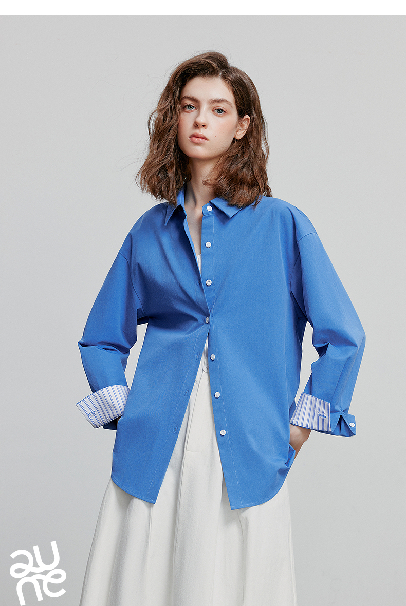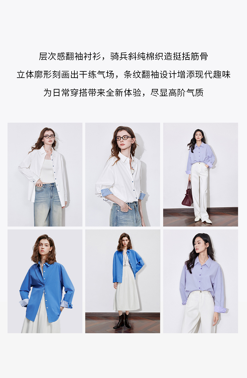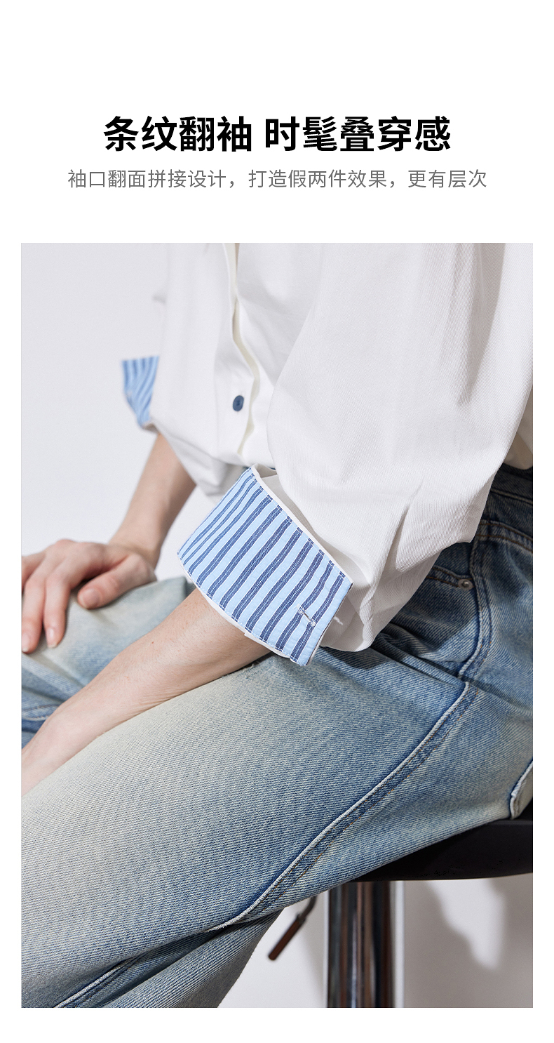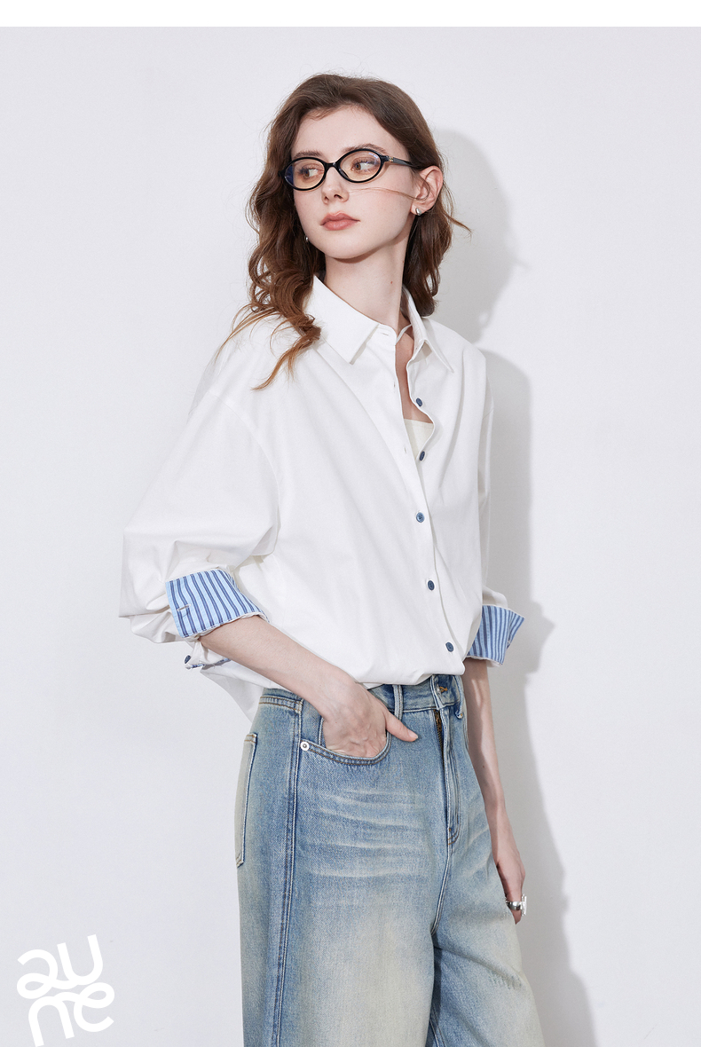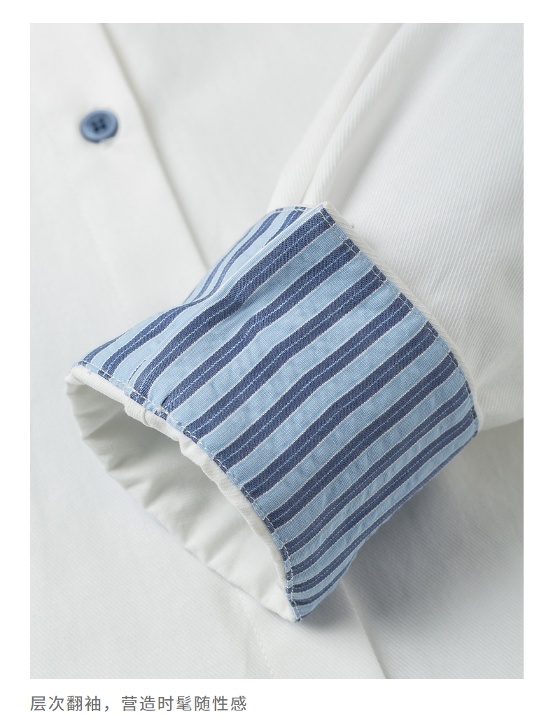 初语条纹翻袖衬衫女时装感上班通勤上衣高级感气质纯棉衬衣
