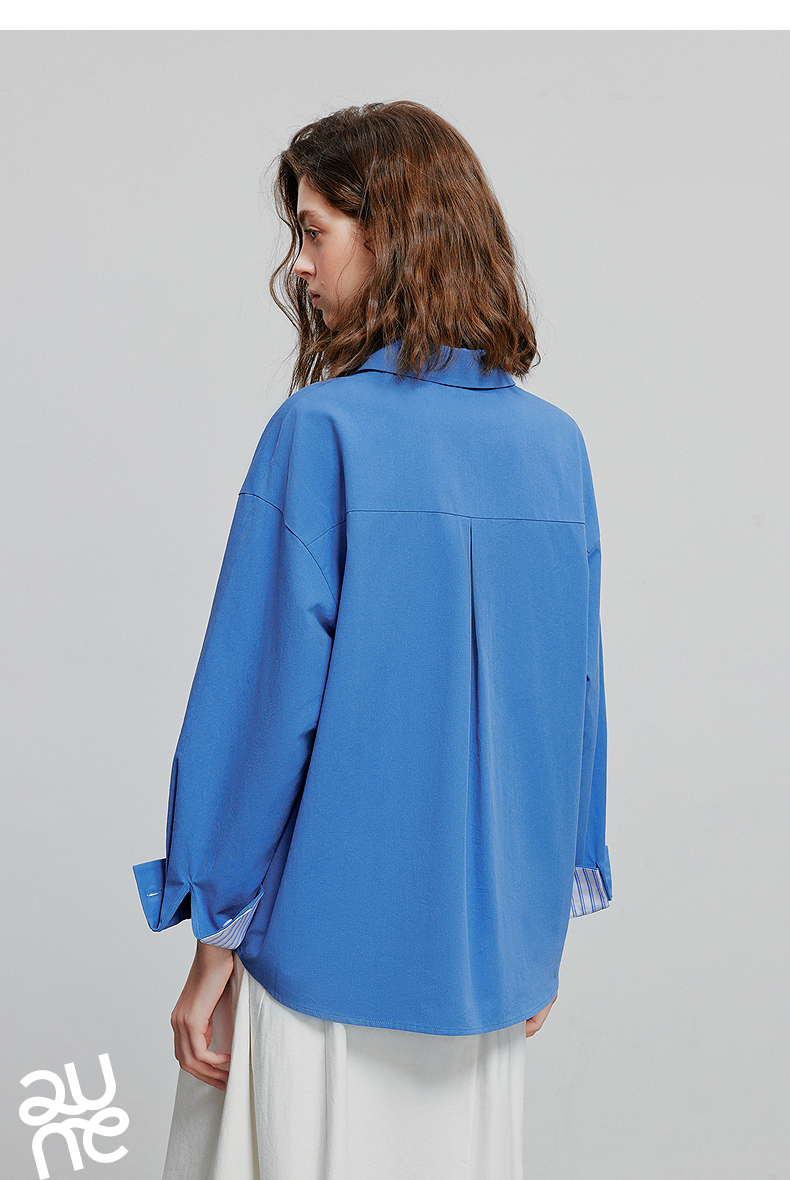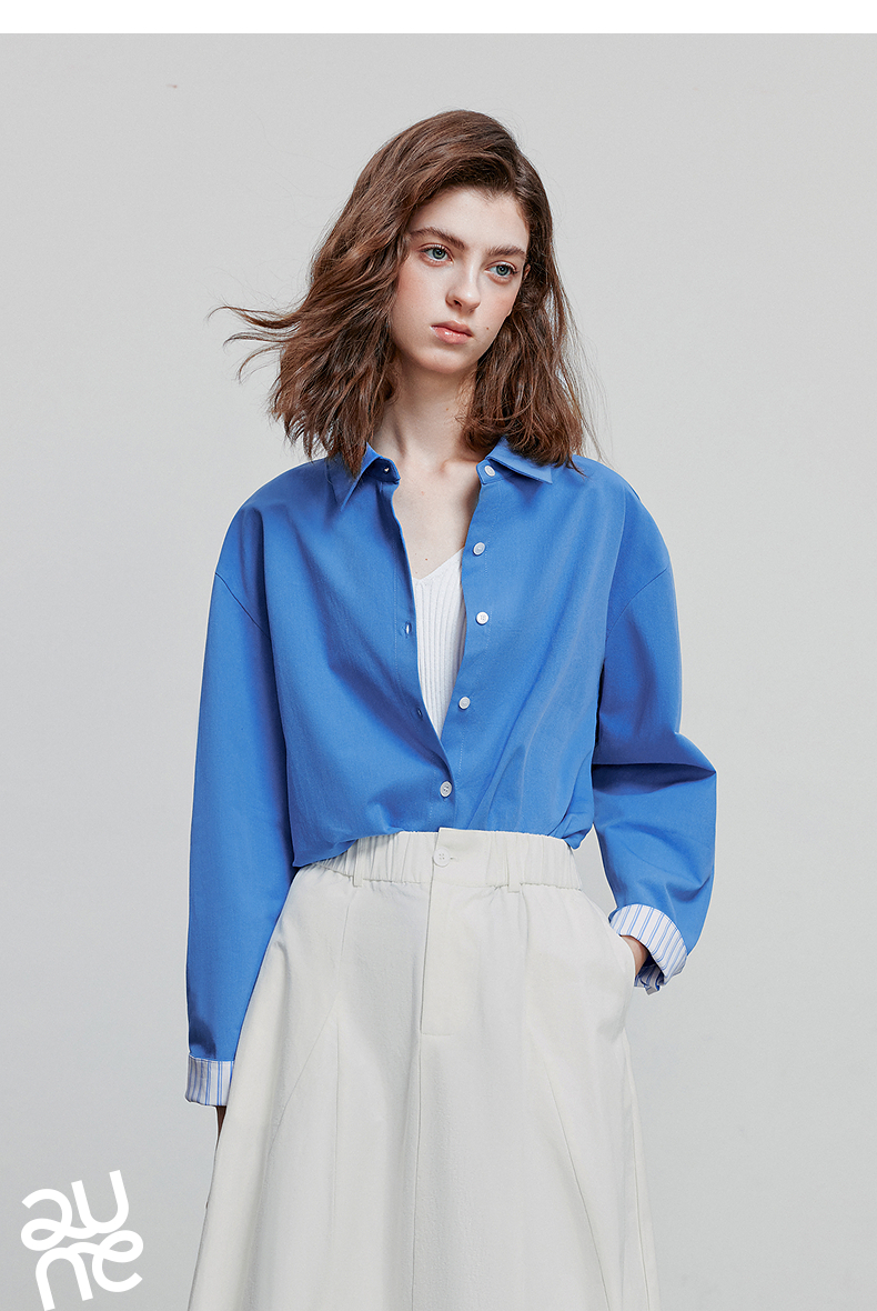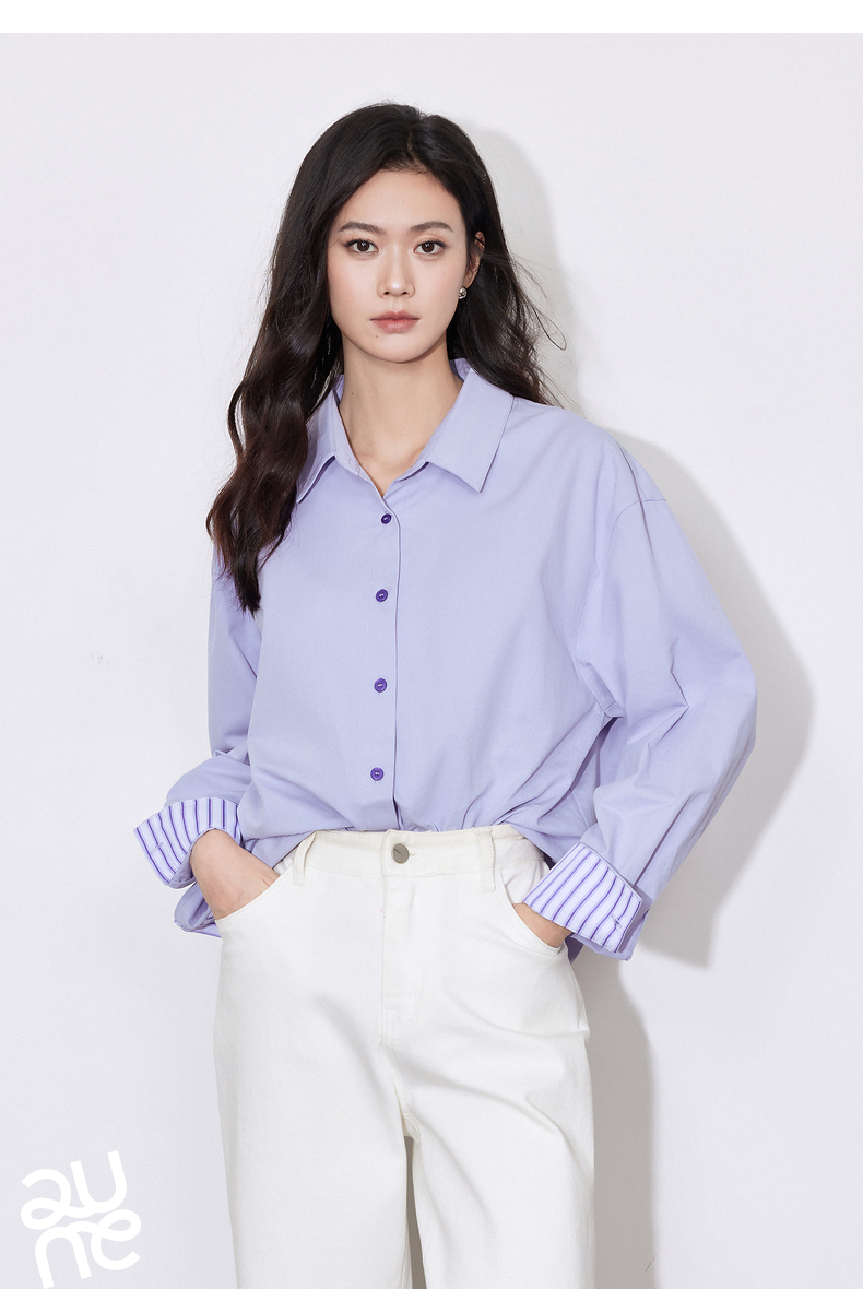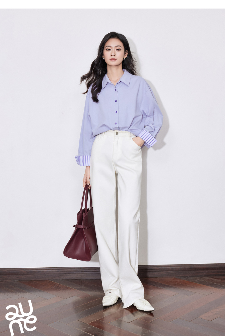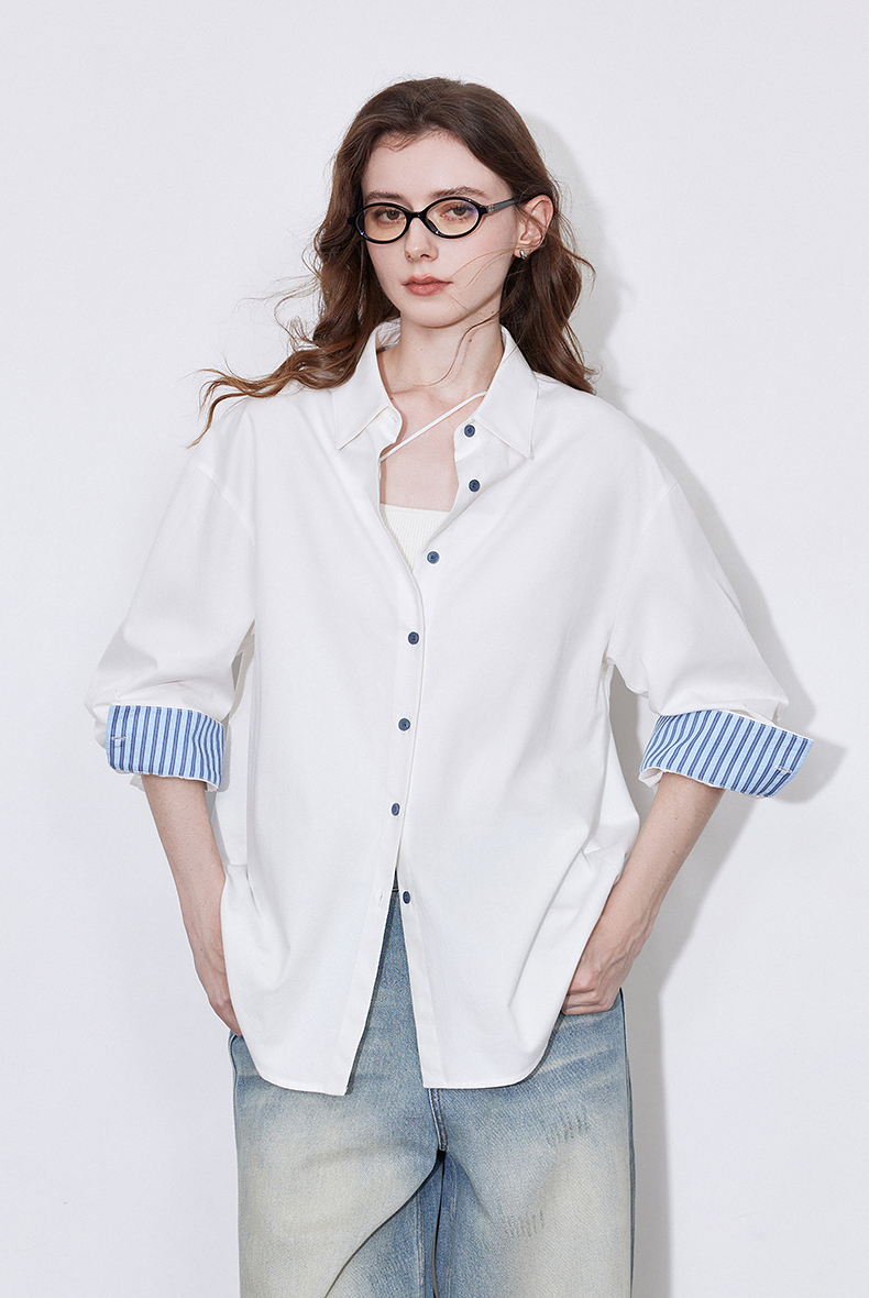 初语条纹翻袖衬衫女时装感上班通勤上衣高级感气质纯棉衬衣