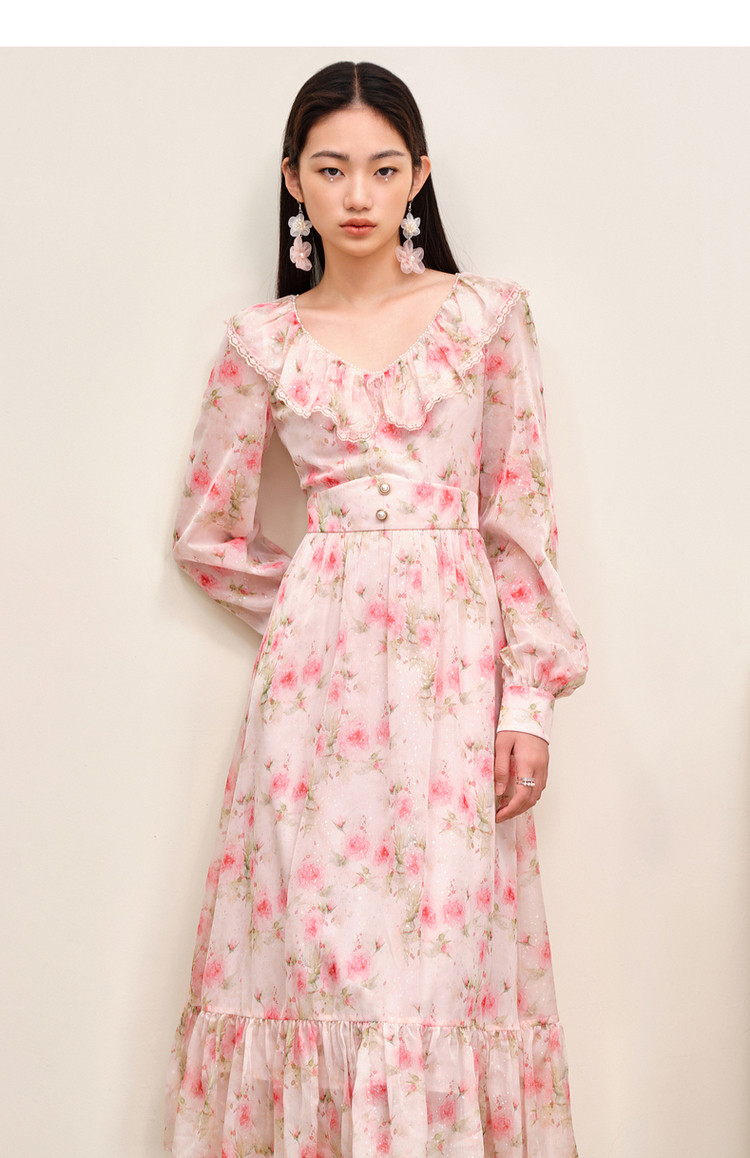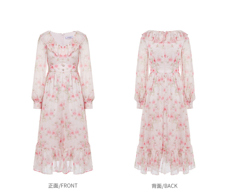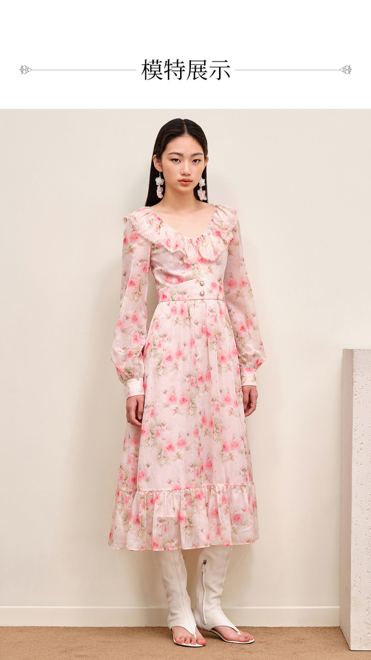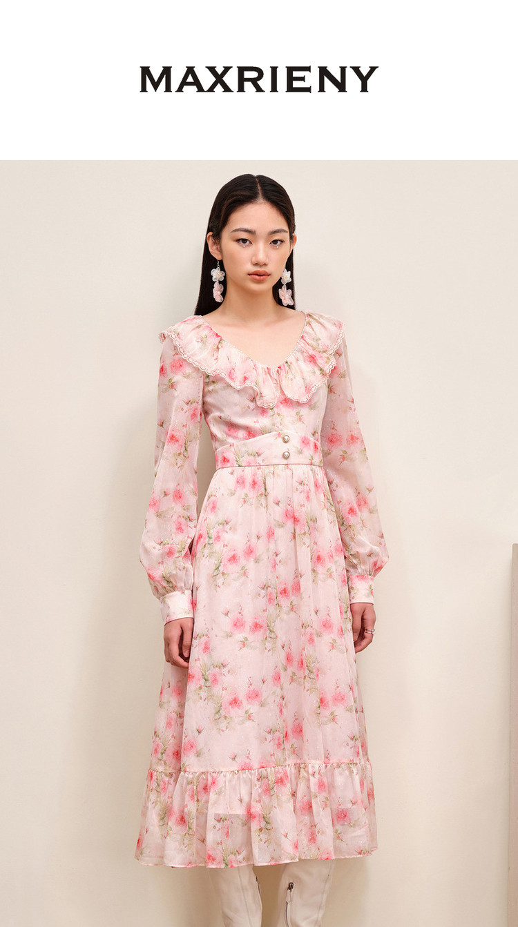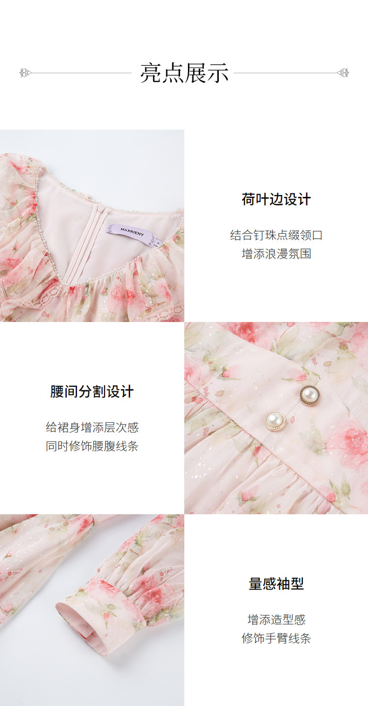 MAXRIENY温柔浪漫氛围感连衣裙长袖秋季粉色晕染印花郁金香裙子MS88DR519F10