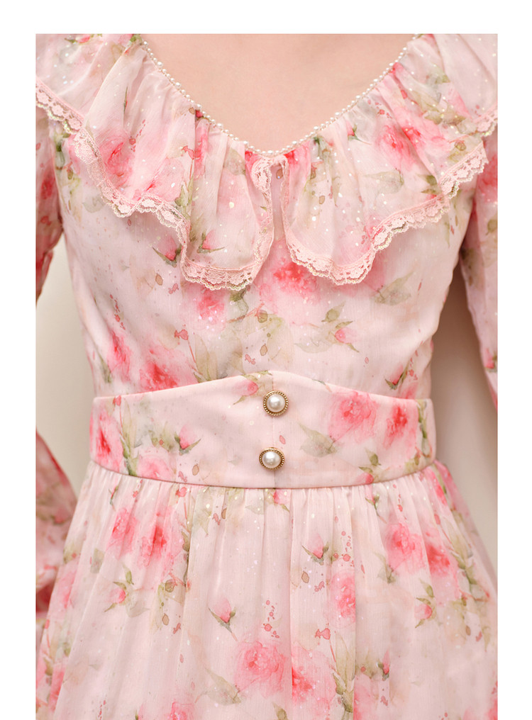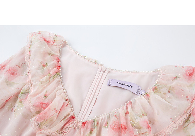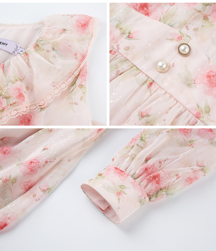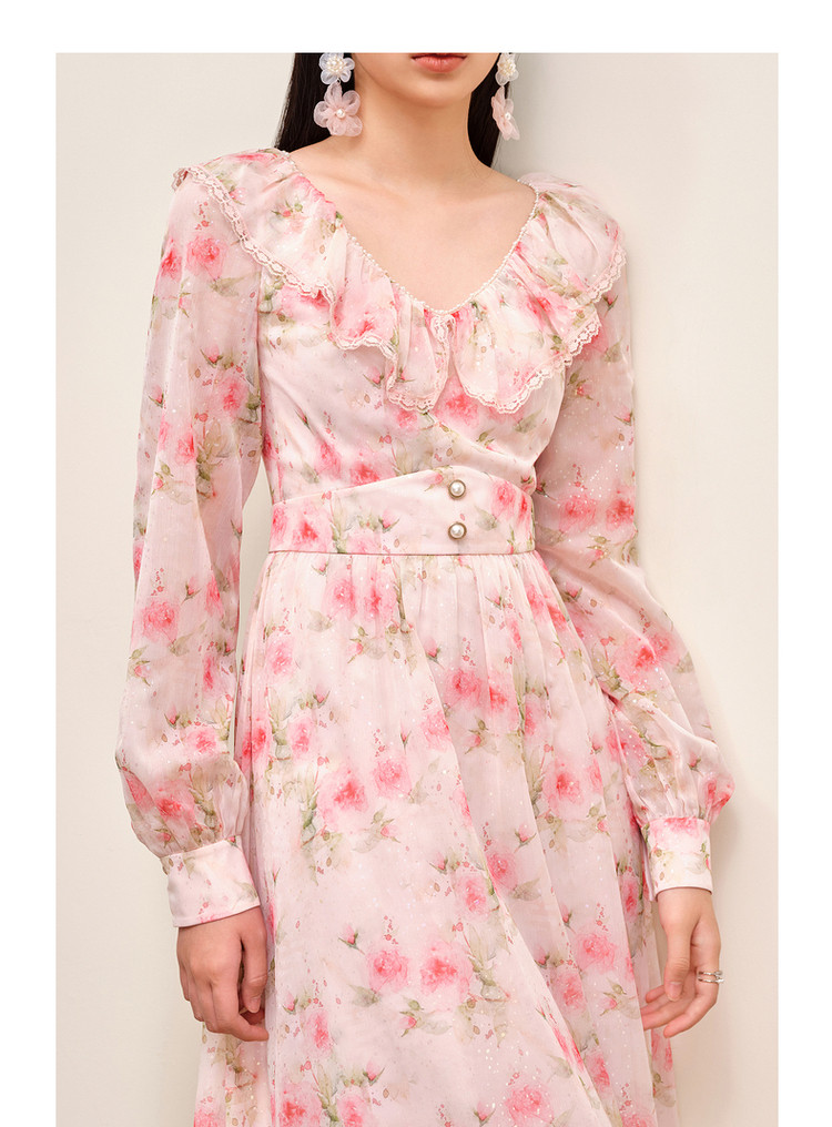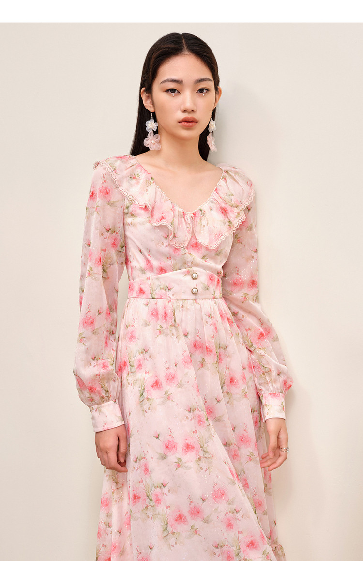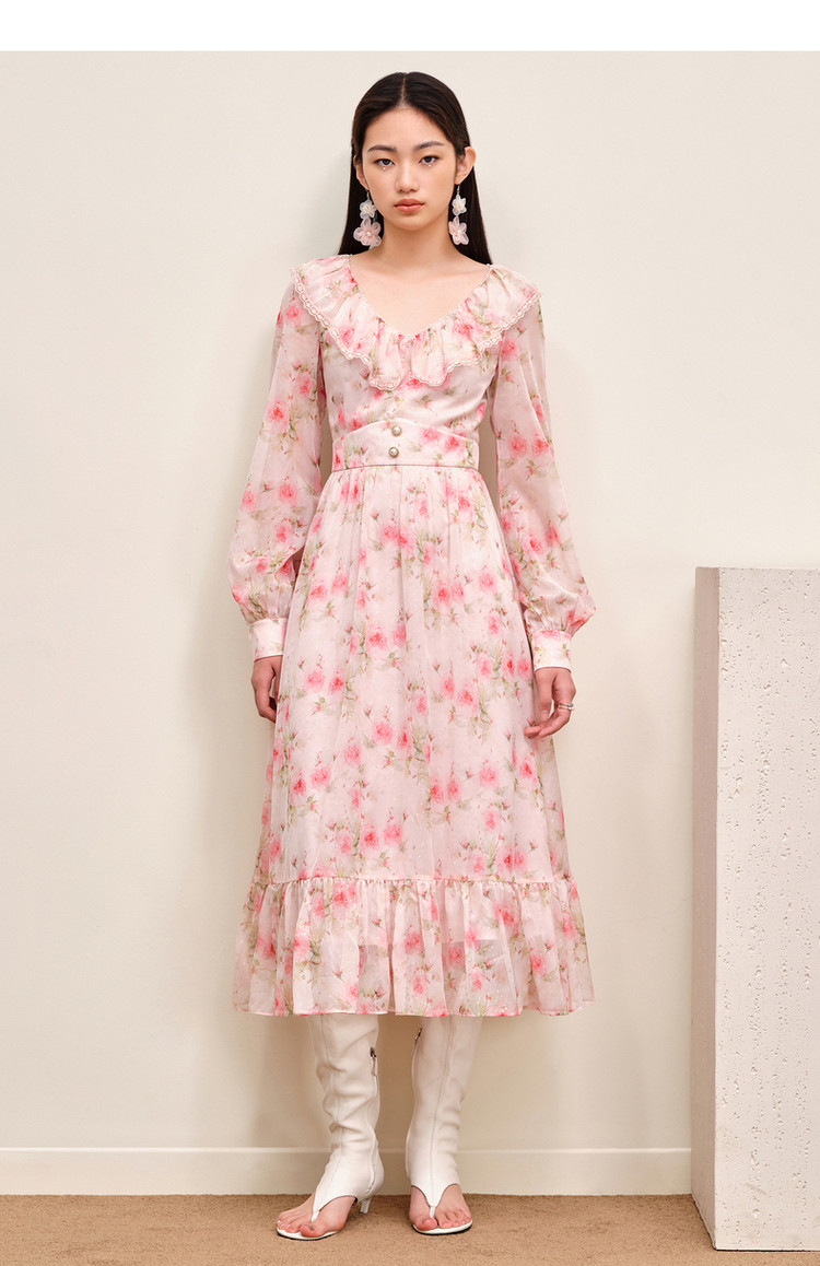 MAXRIENY温柔浪漫氛围感连衣裙长袖秋季粉色晕染印花郁金香裙子MS88DR519F10