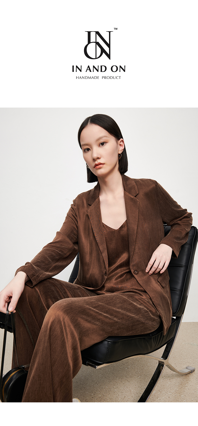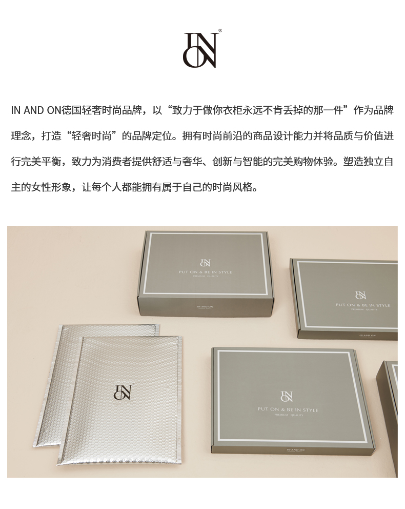 - IN AND ON—轻奢时尚品牌,以“致力于做你衣柜永远不肯丢掉的那一件”作为品牌理念,打造“轻奢时尚”的品牌定位。拥有时尚前沿的商品设计能力并将品质与价值进行完美平衡,致力为消费者提供舒适与奢华、创新与智能的完美购物体验。塑造独立自主的女性形象,让每个人都能拥有属于自己的时尚风格。