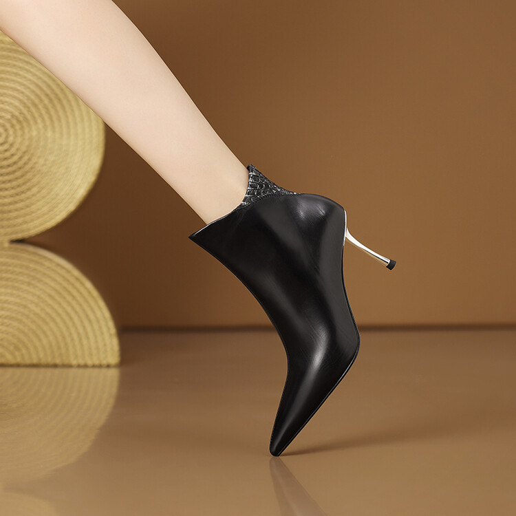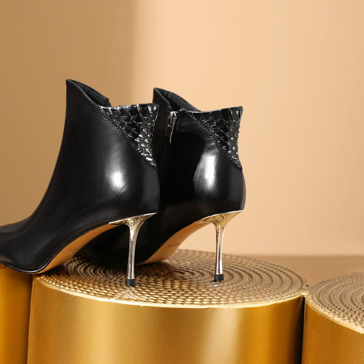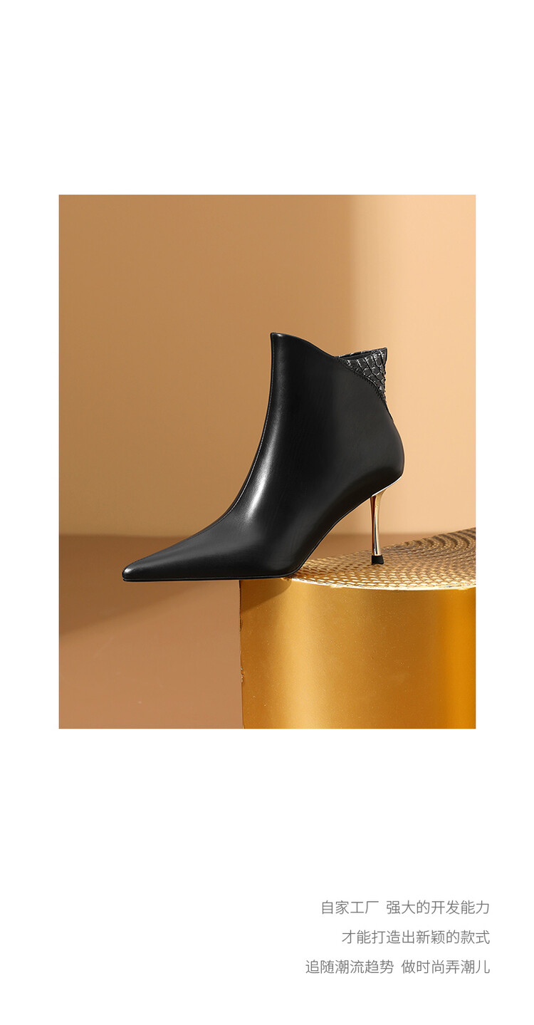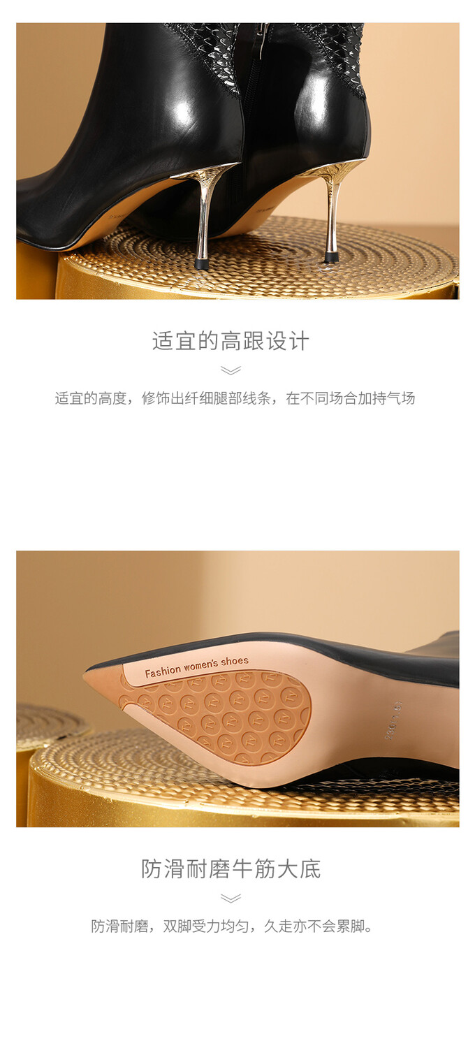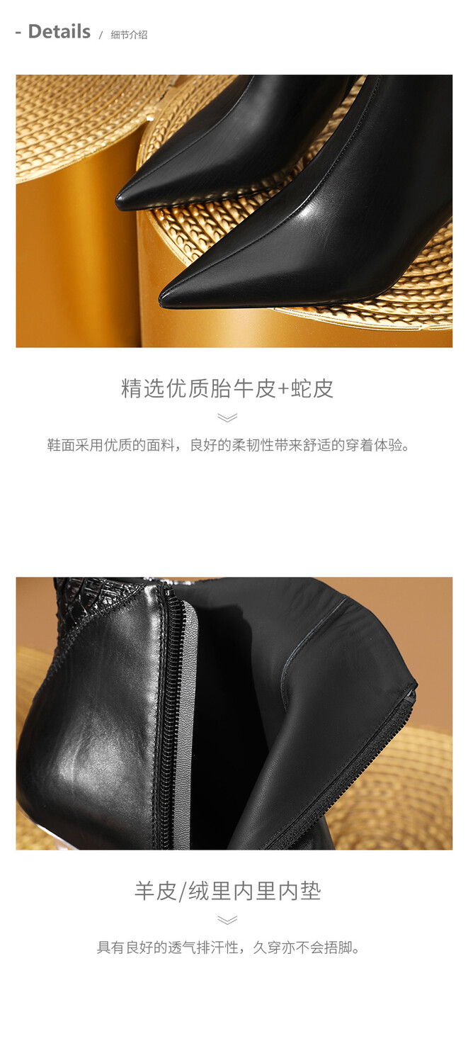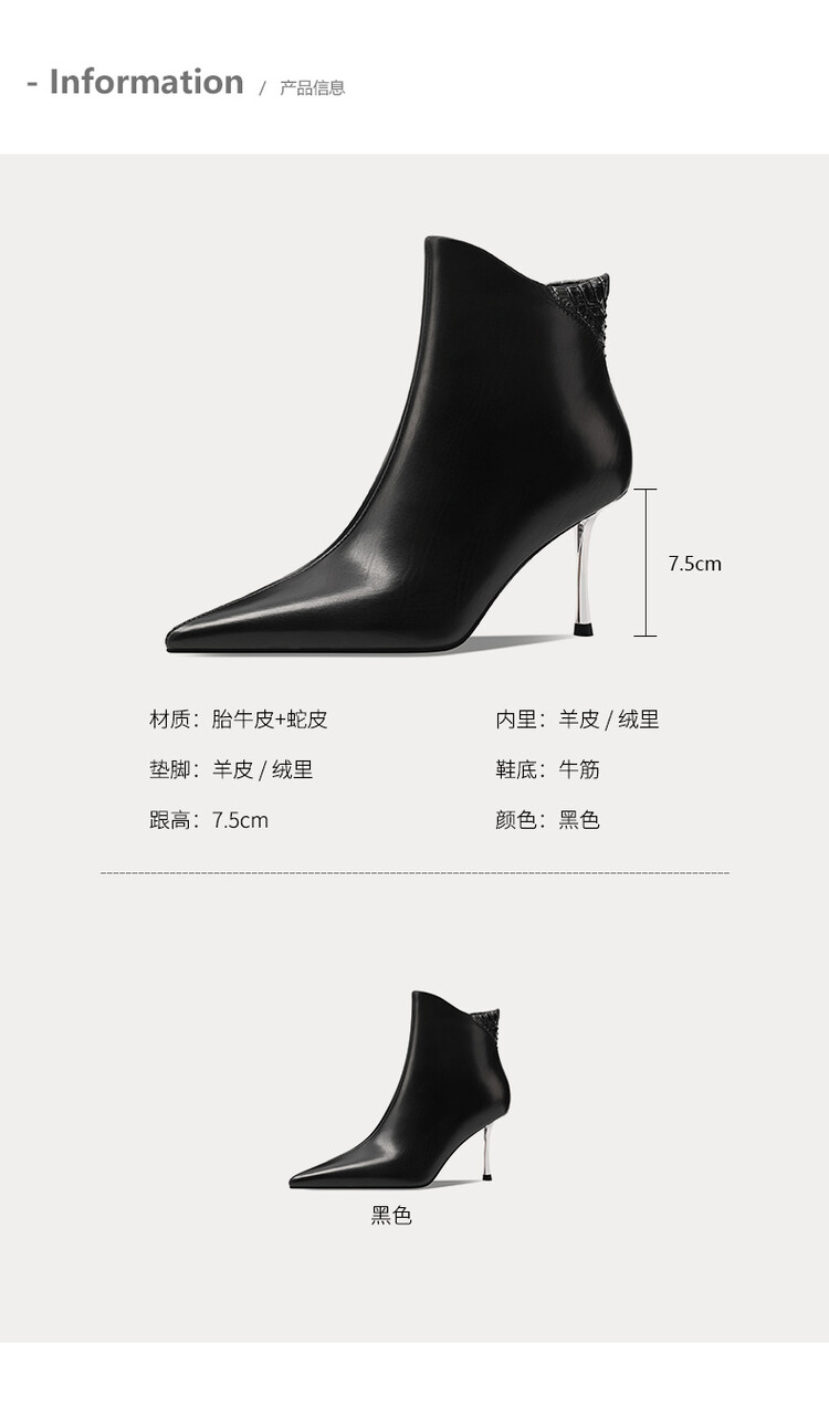 【款式货号】:SR206【面料】:胎牛皮/蛇皮【内里】:羊皮/绒里【垫脚】:羊皮/绒里【颜色】:黑色【跟高】:7.5cm【尺码】:34-39码