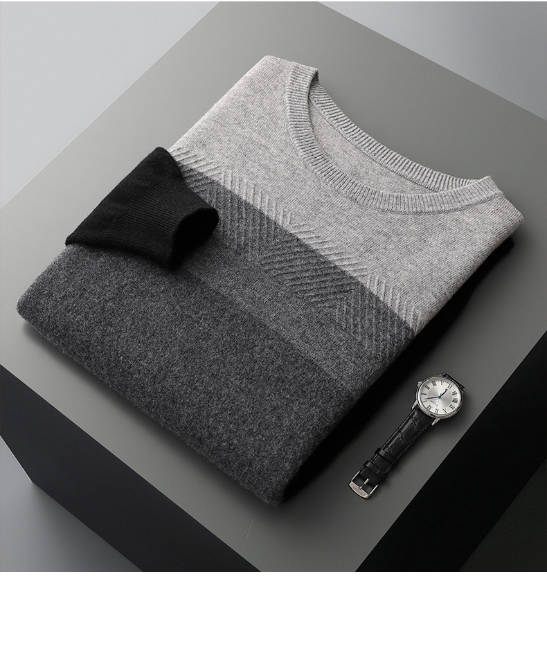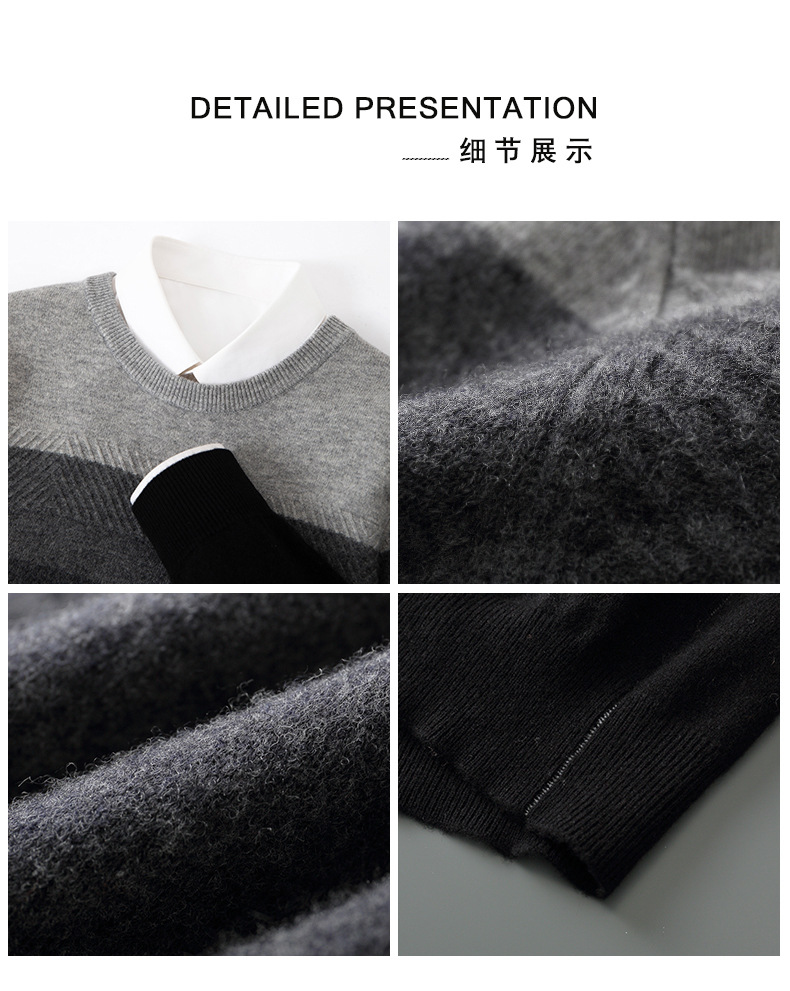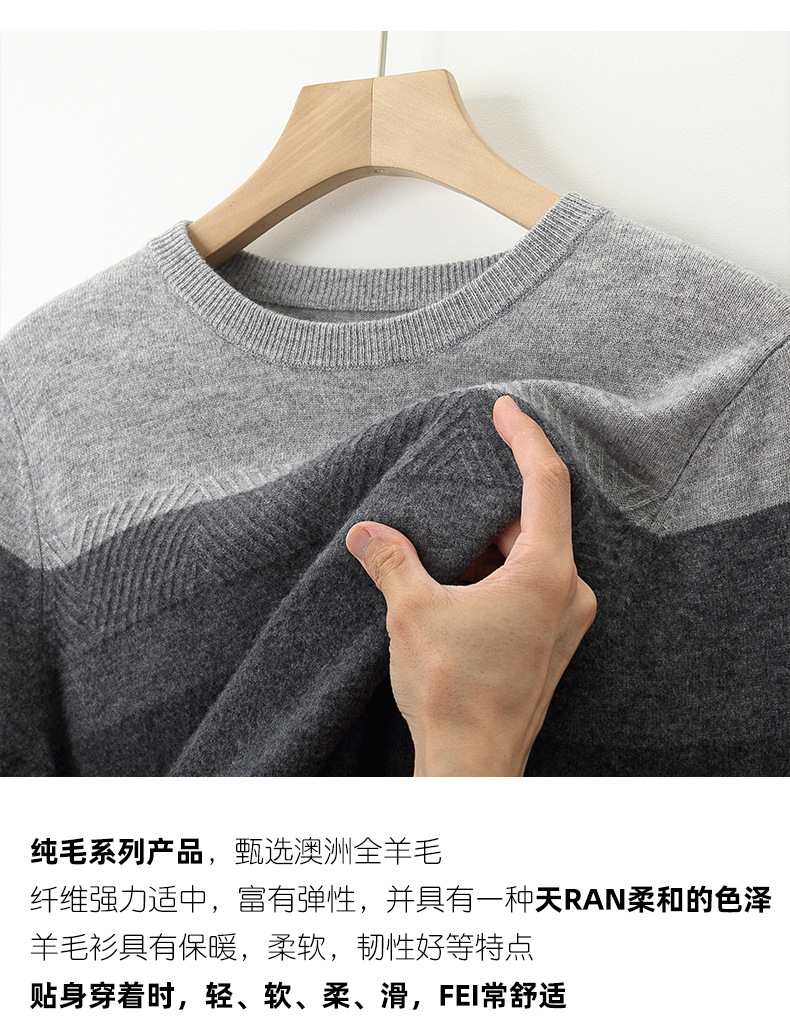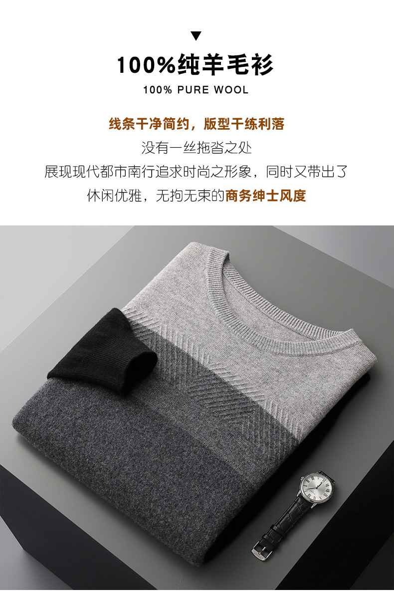 红览 100%纯羊毛衫男圆领拼色加厚提花毛衣宽松休闲针织打底衫2039
