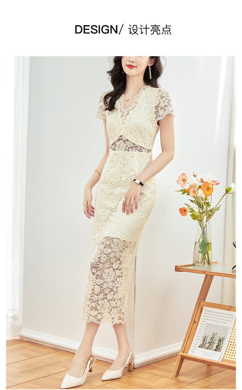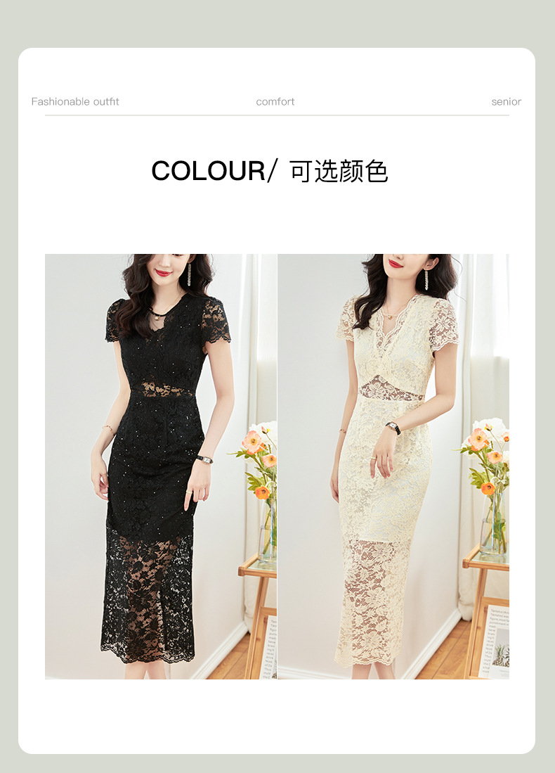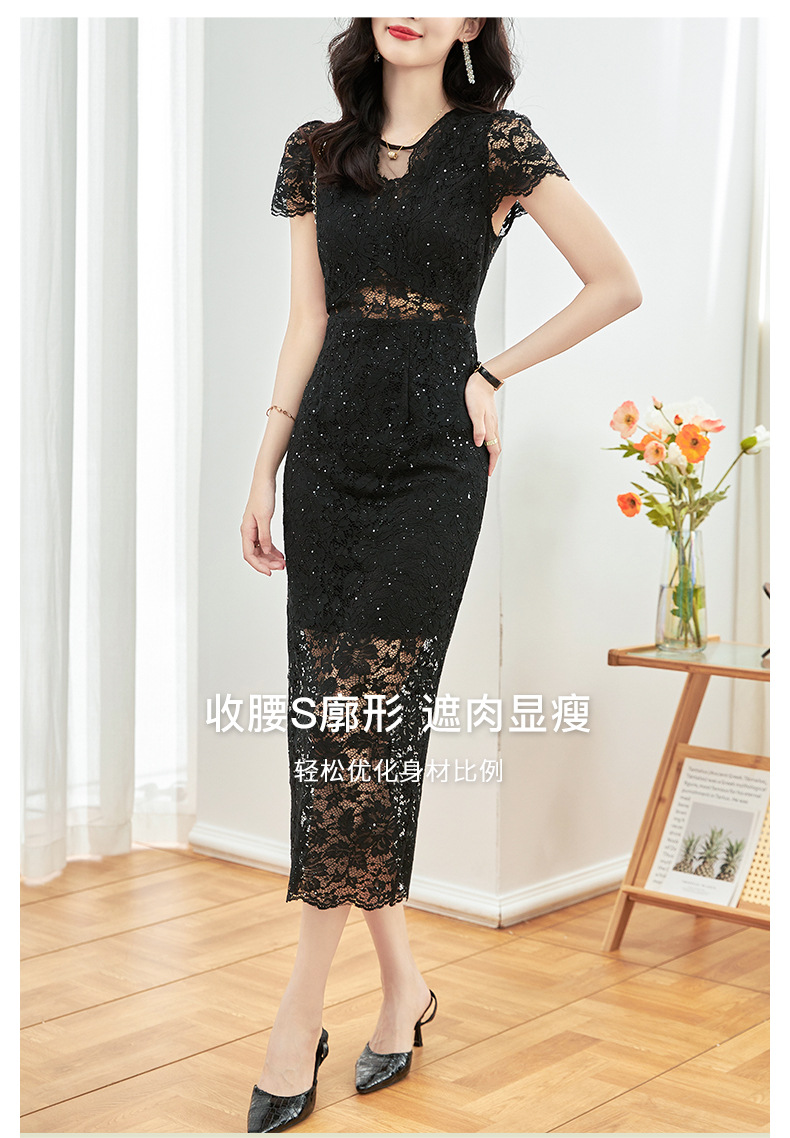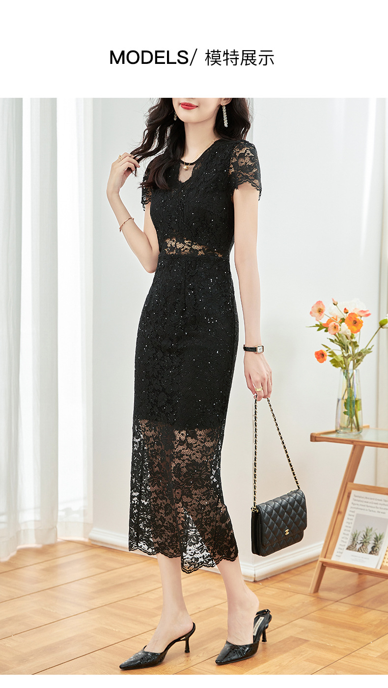 名媛气质感,V领烫钻股线蕾丝微透视小性感包臀连衣裙WLZD-2312303