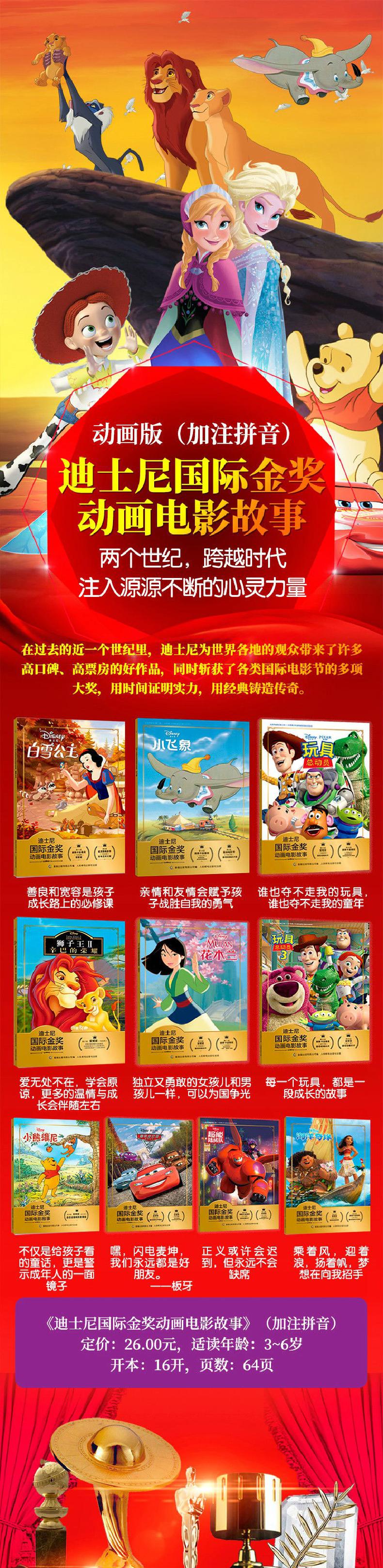本次出版的国际金奖系列共10册。开本为正16开,图片使用剧照图,文字加注拼音。封面与之前国际金奖的设计风格有较大区分,给读者带来焕然一新的感觉。10本的主题分别是《小飞象》《赛车总动员2》《超能陆战队》《玩具总动员》《玩具总动员3》《花木兰》《海洋奇缘》《狮子王II辛巴的荣耀》《小熊维尼》《白雪公主》。