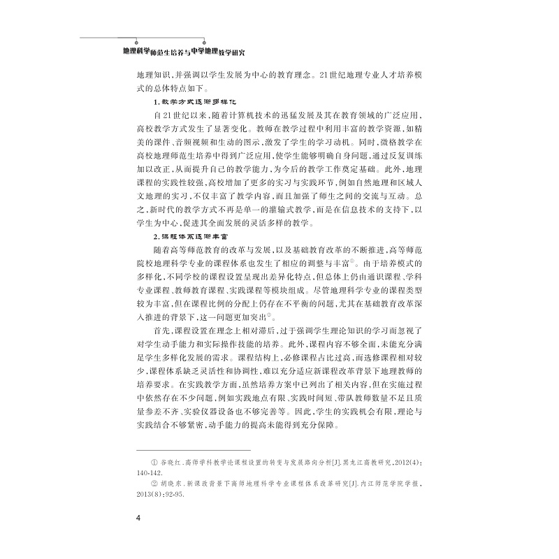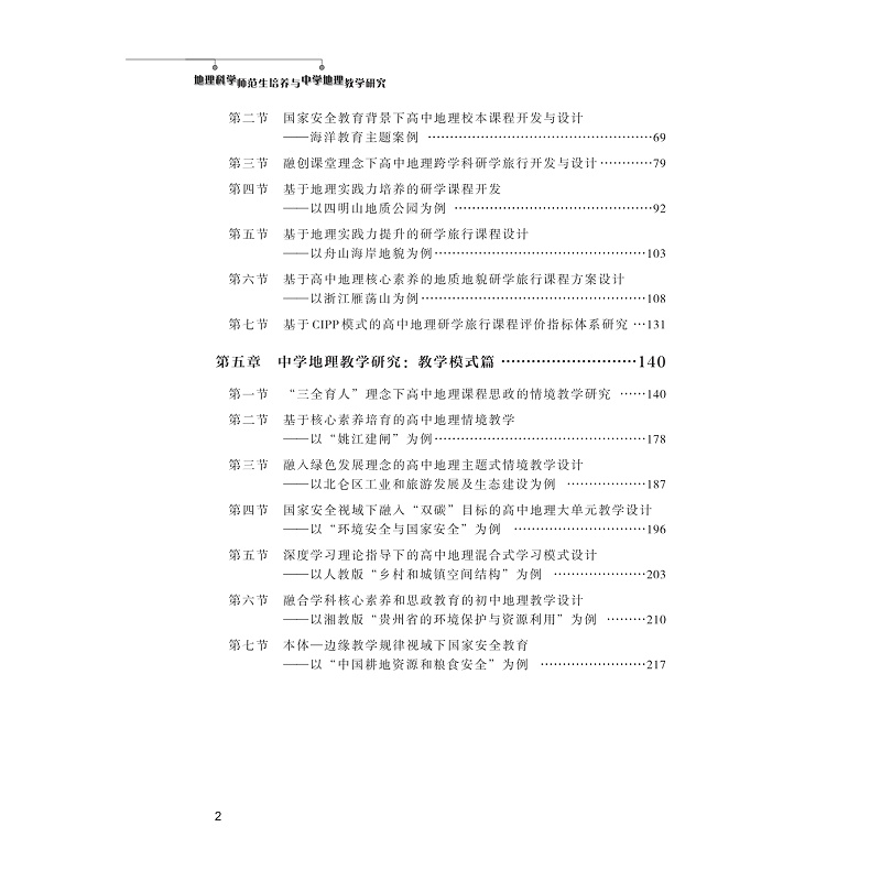 地理科学师范生的培养质量提升及中学教学研究对于高中生的地理核心素养提升具有非常重要的意义。但是,当前师范院校在师范生培养过程中明显存在与中学地理教学实际脱节的问题。高校教师对于中学教学研究涉及较少,相关的研究专著凤毛麟角,难以为中学地理教学质量提升提供理论指导。因此本书在分析探讨地理科学师范生培养基础上,对高中地理校本教材、地理研学课程开发及教学模式改革进行了探讨,以期提升中学地理教学质量,服务基础地理教学。本书可作为高等院校从事中学地理教学师资培养的教学科研人员使用,也可作为地理科学(师范)本科生、学科教学(地理)、课程与教学论(地理)研究生的学习参考资料,同时也可供中学地理老师参考。