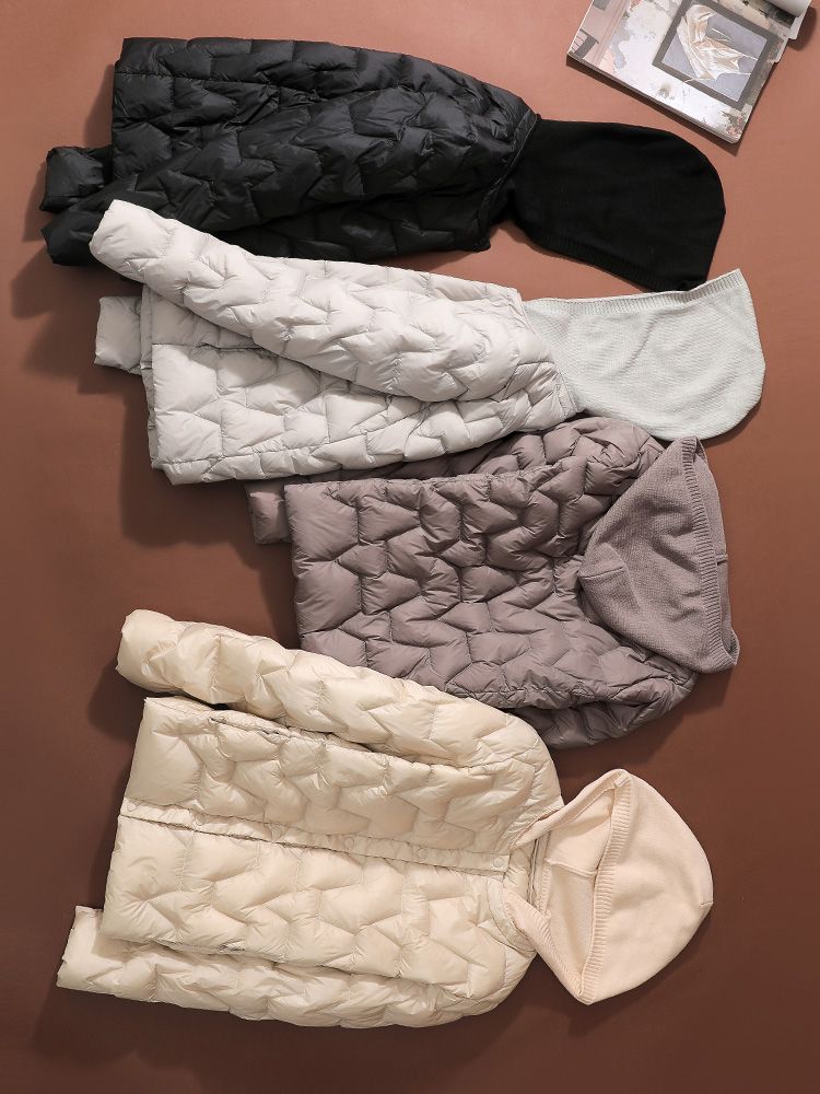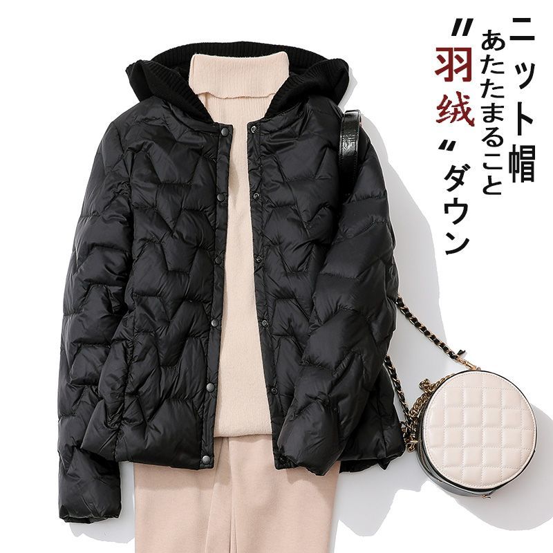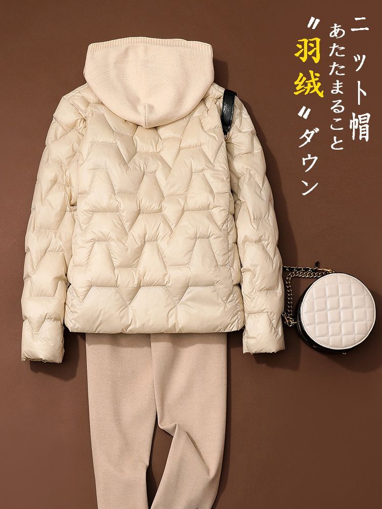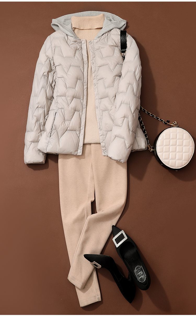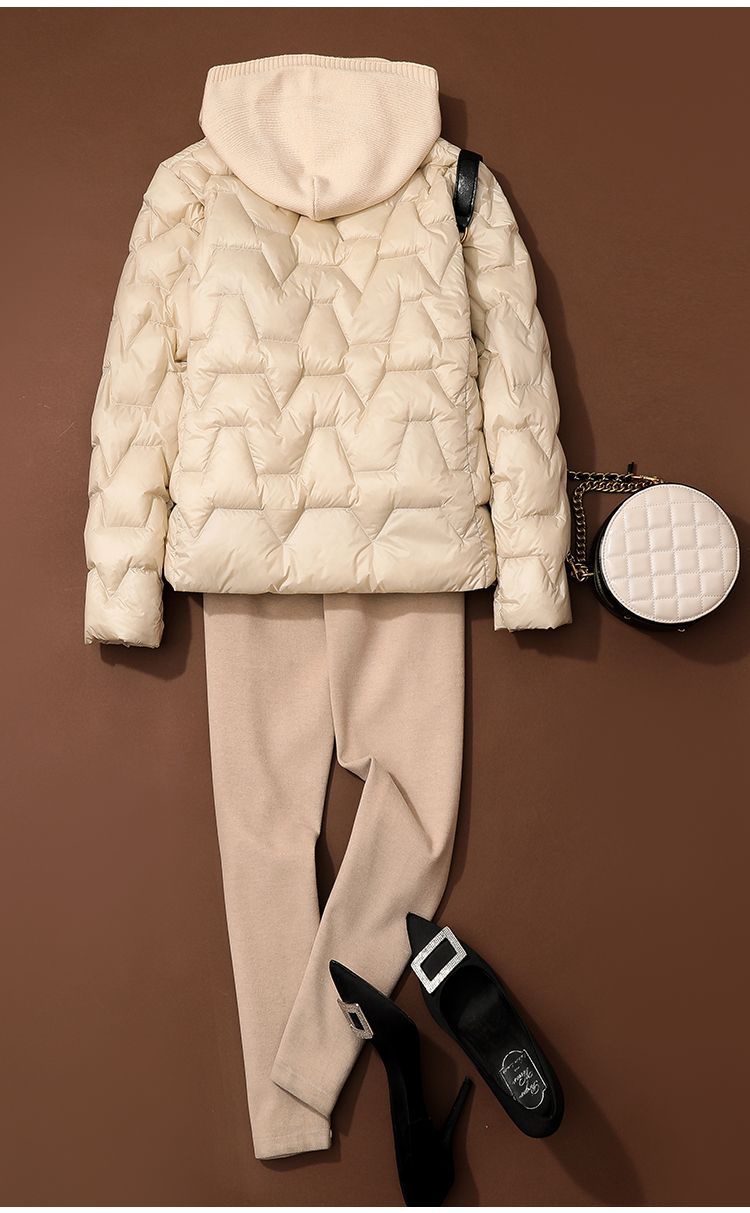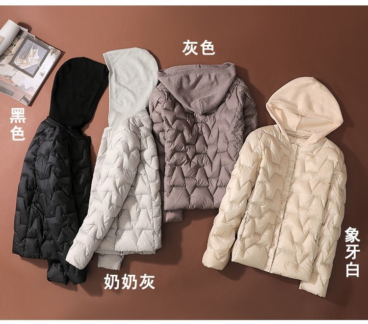 丁摩~秋冬轻薄连帽羽绒服女短款拼接针织帽时尚洋气内搭轻便修身外套VOP