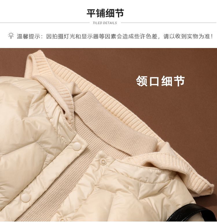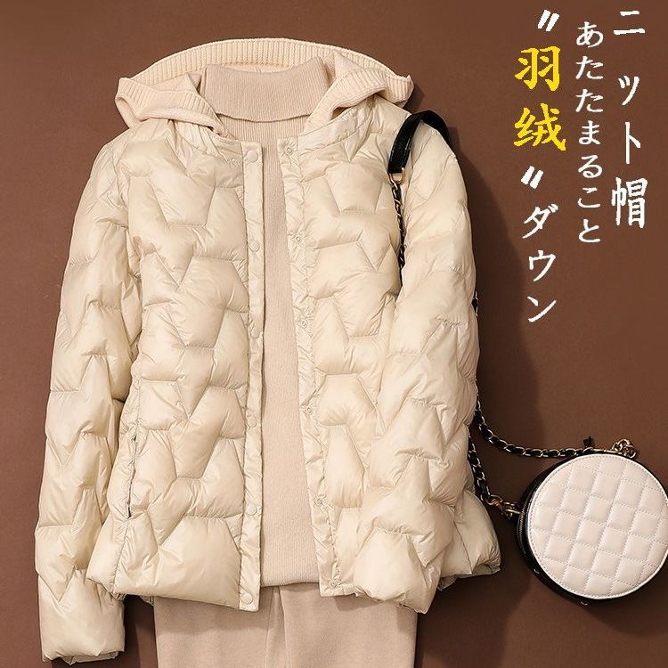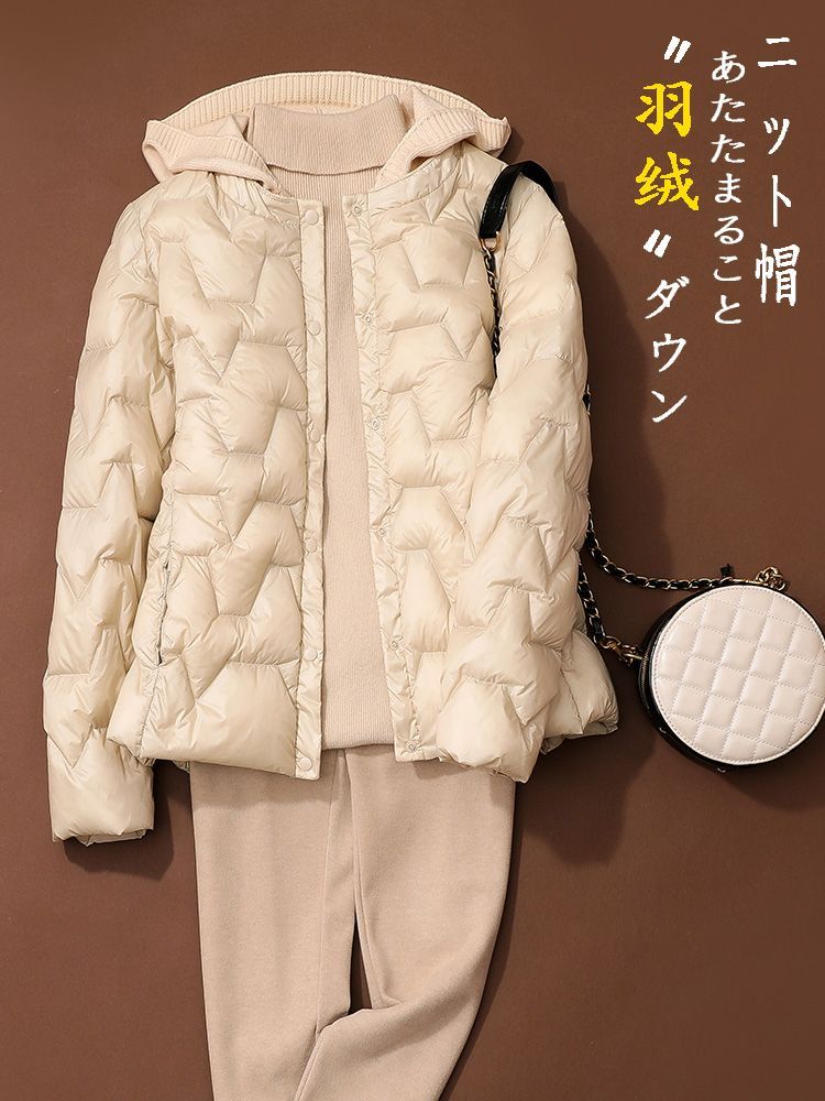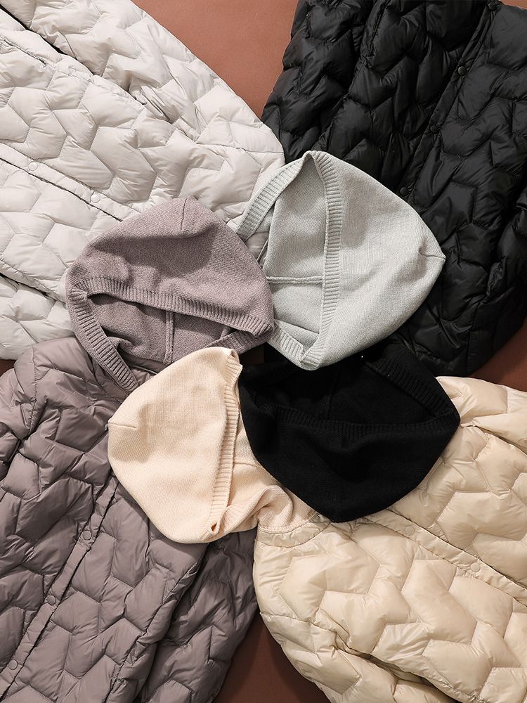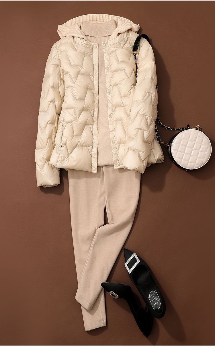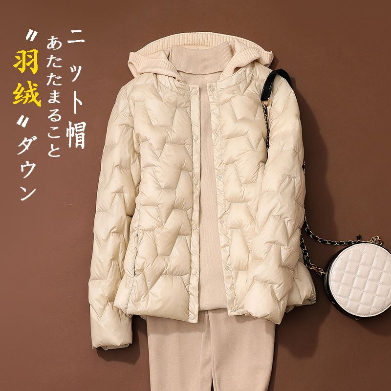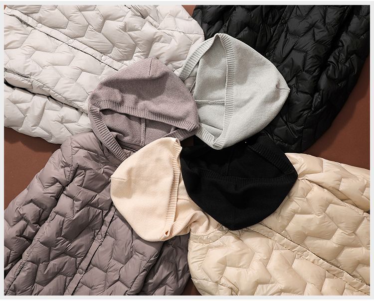 丁摩~秋冬轻薄连帽羽绒服女短款拼接针织帽时尚洋气内搭轻便修身外套VOP