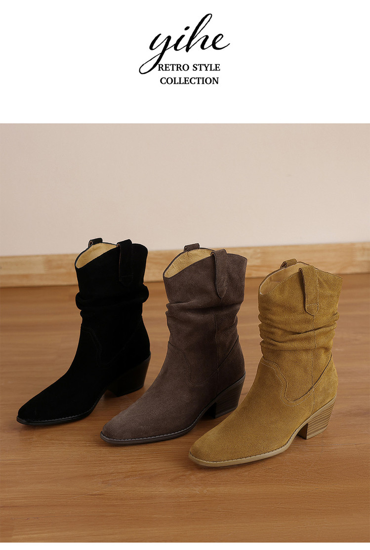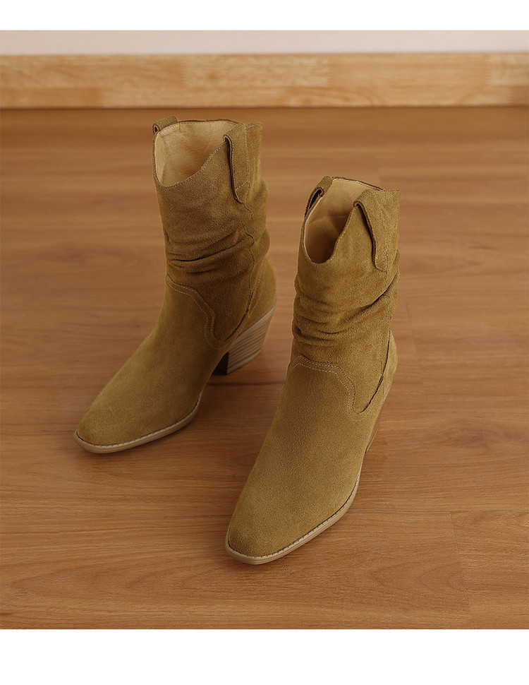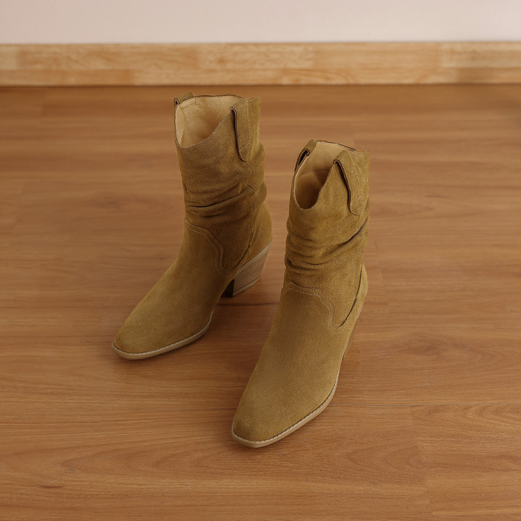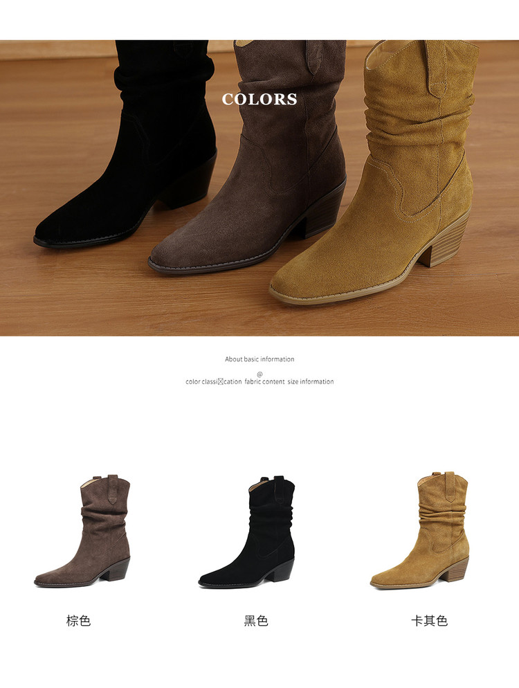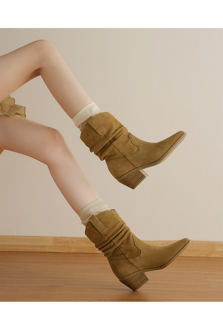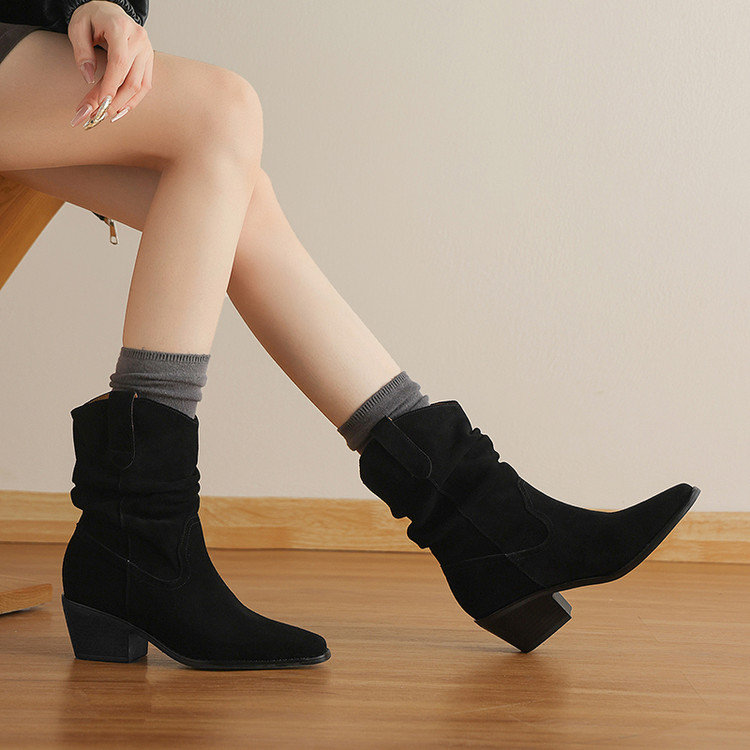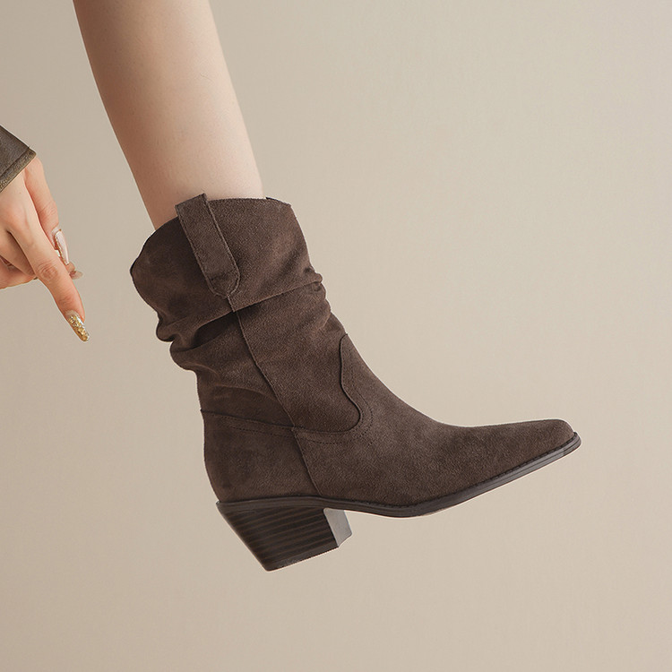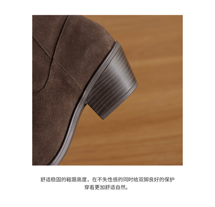 【预售5天】高跟马丁靴女秋冬季绒面复古V口高跟小个子尖头堆堆小短靴HB&1505
