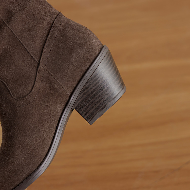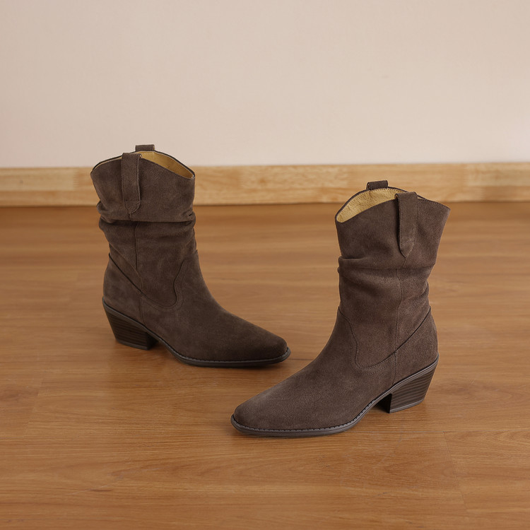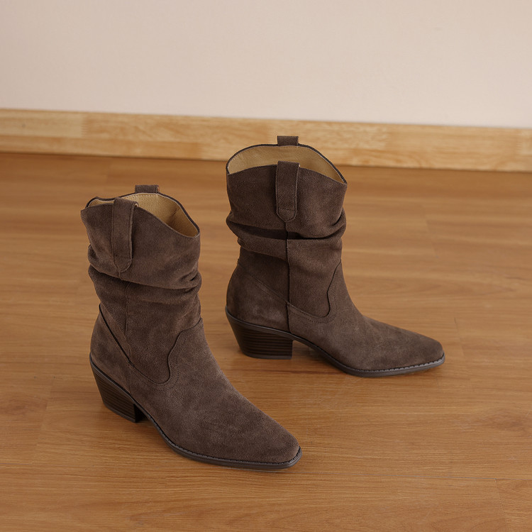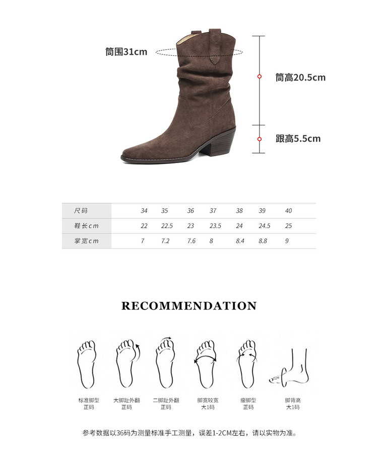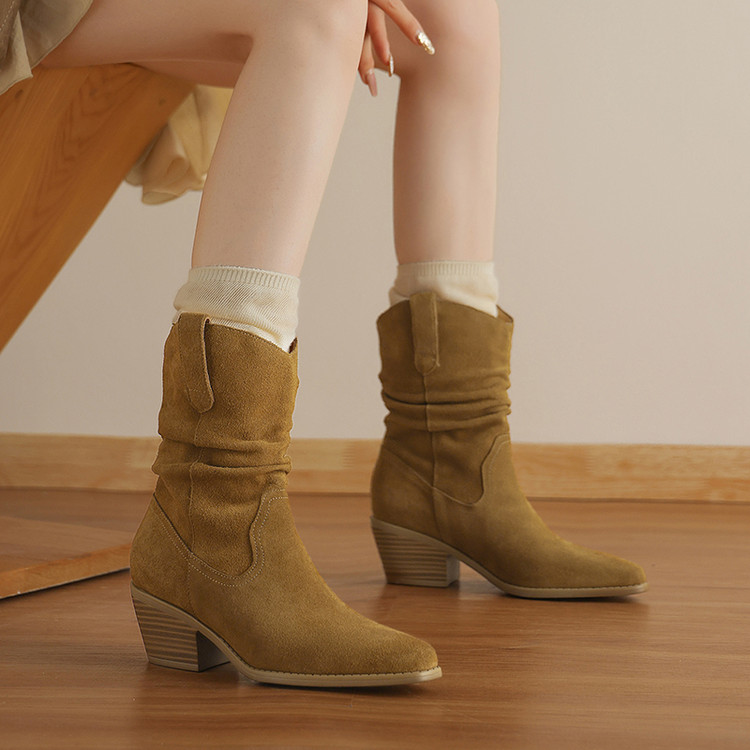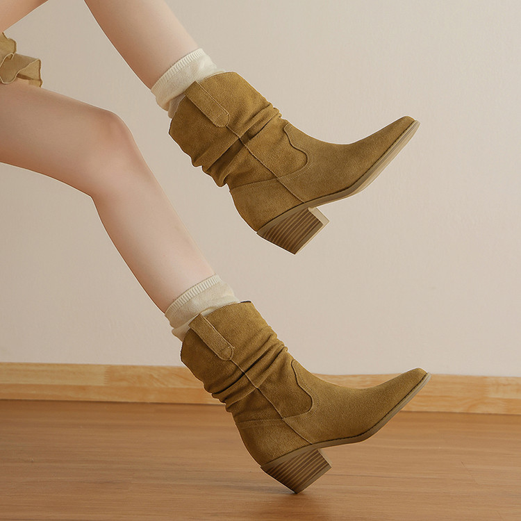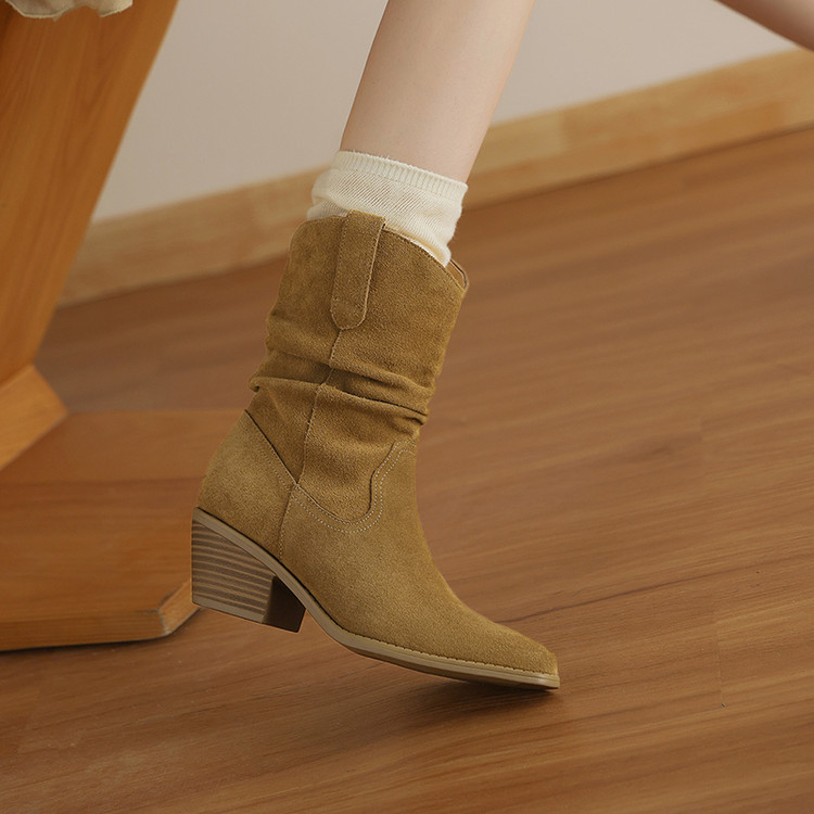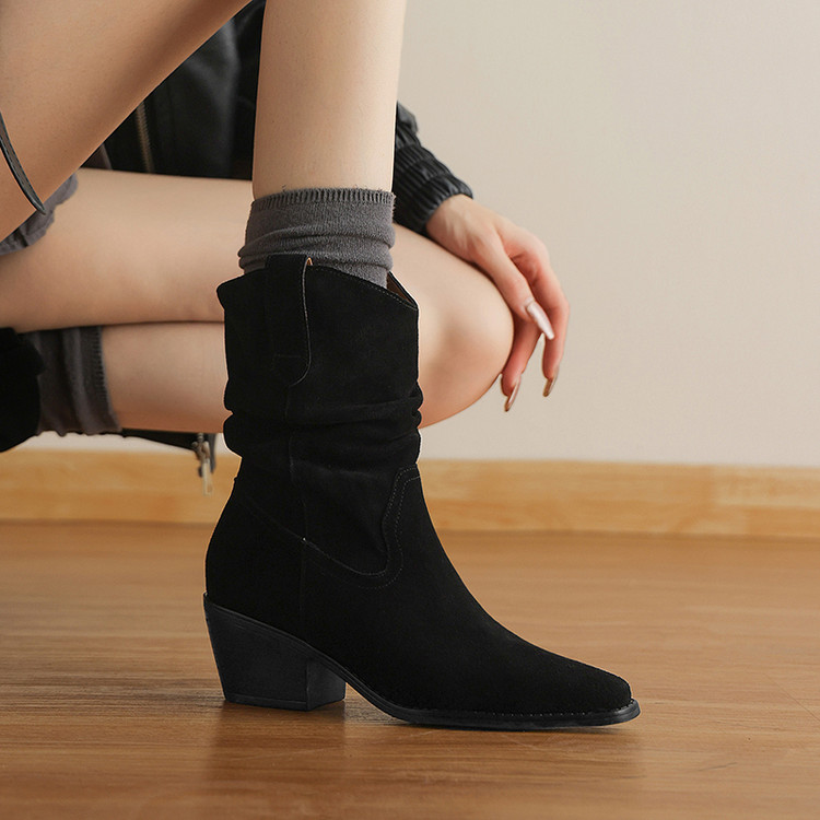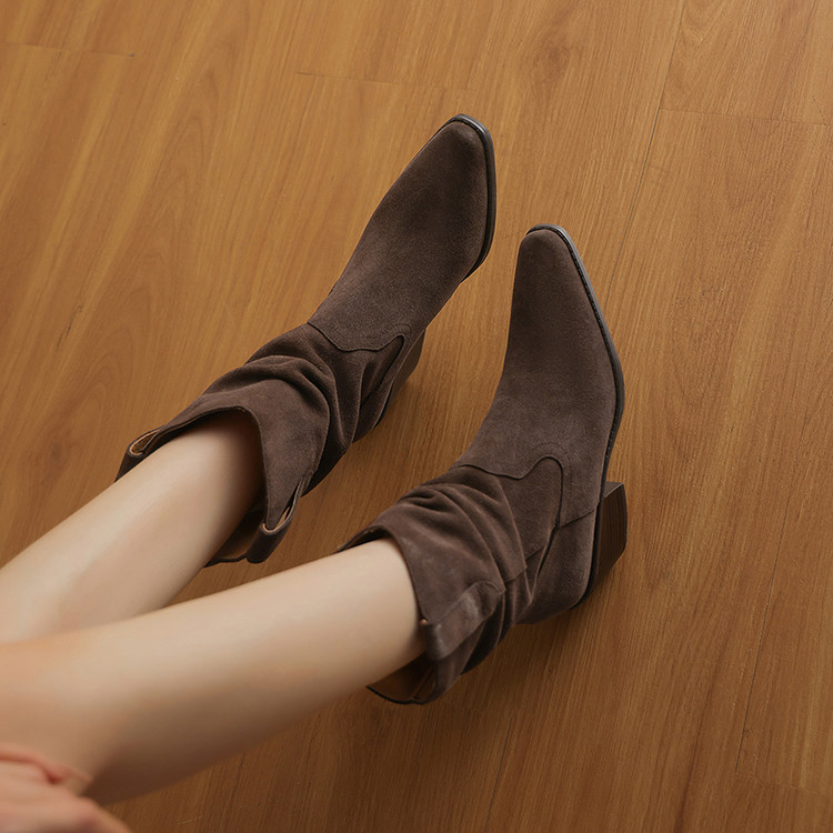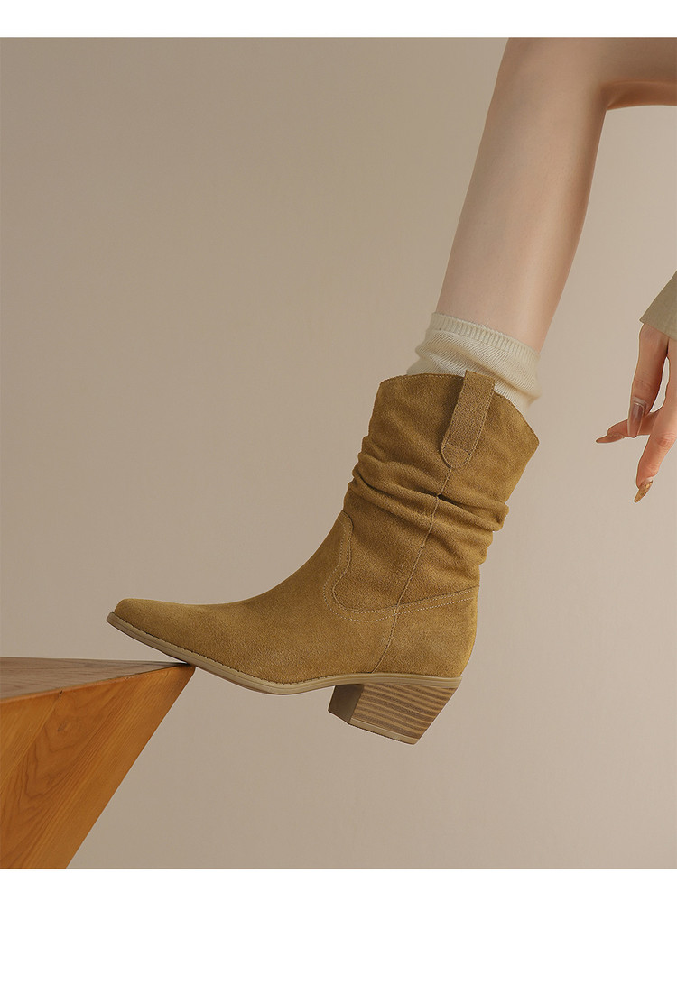 【预售5天】高跟马丁靴女秋冬季绒面复古V口高跟小个子尖头堆堆小短靴HB&1505