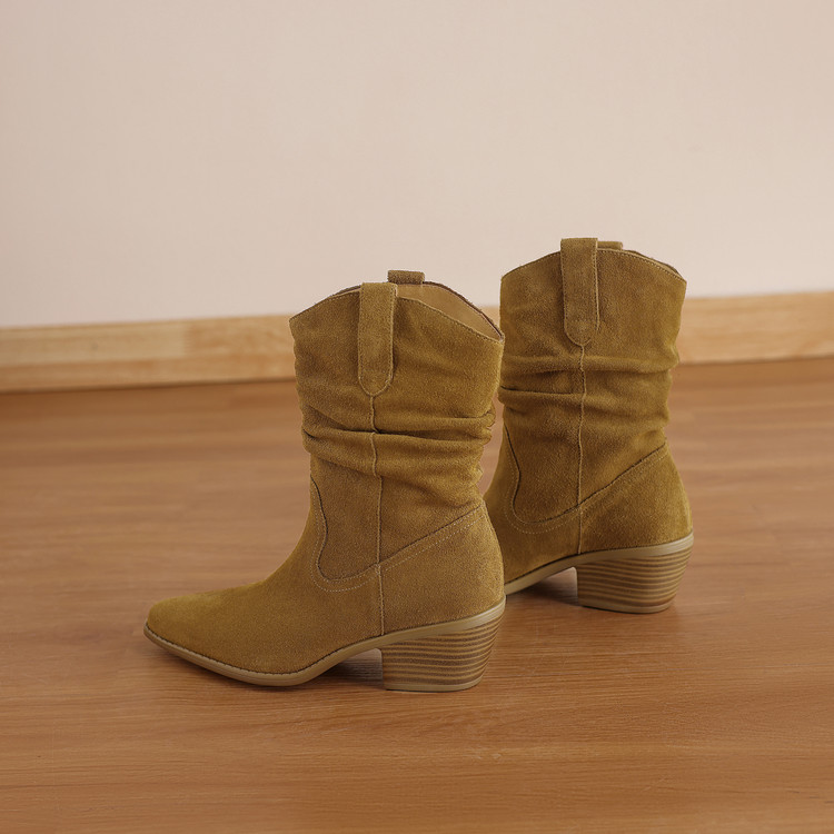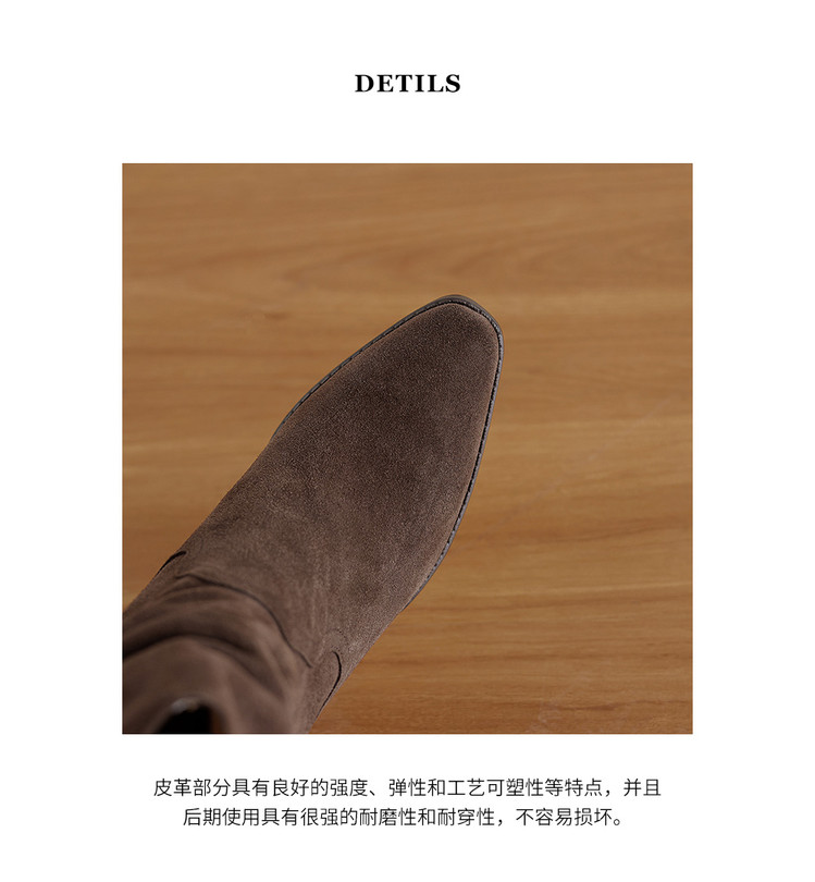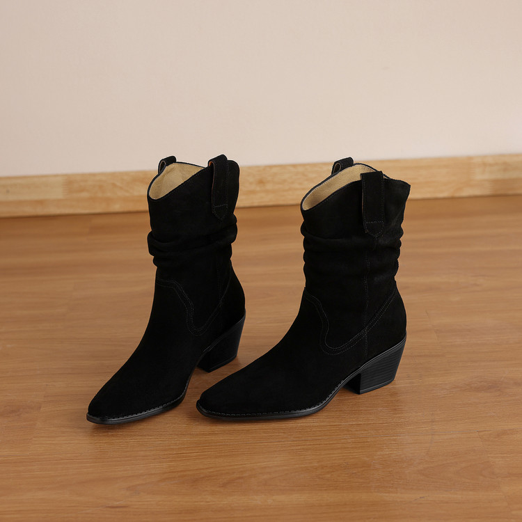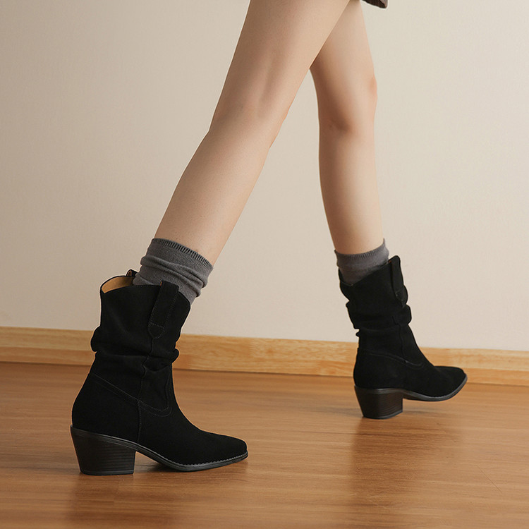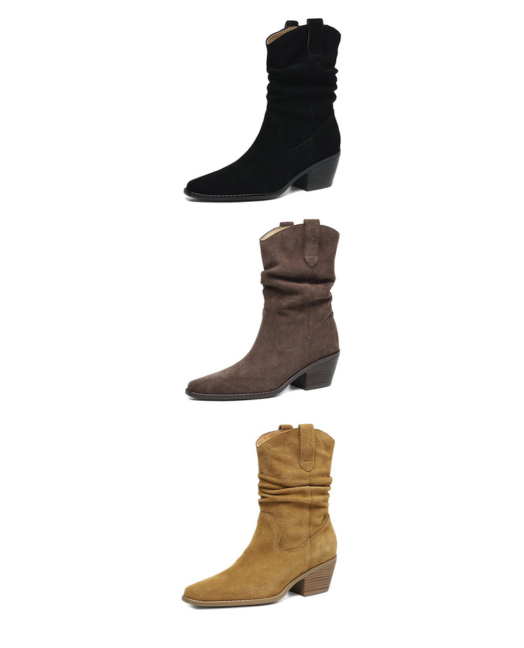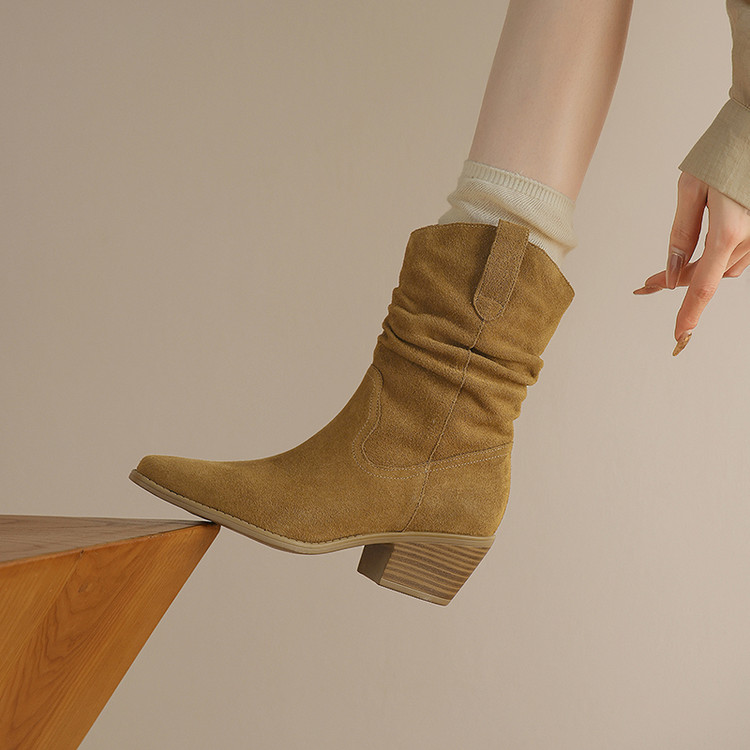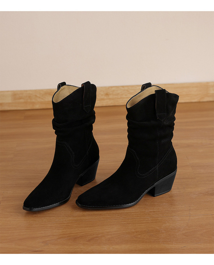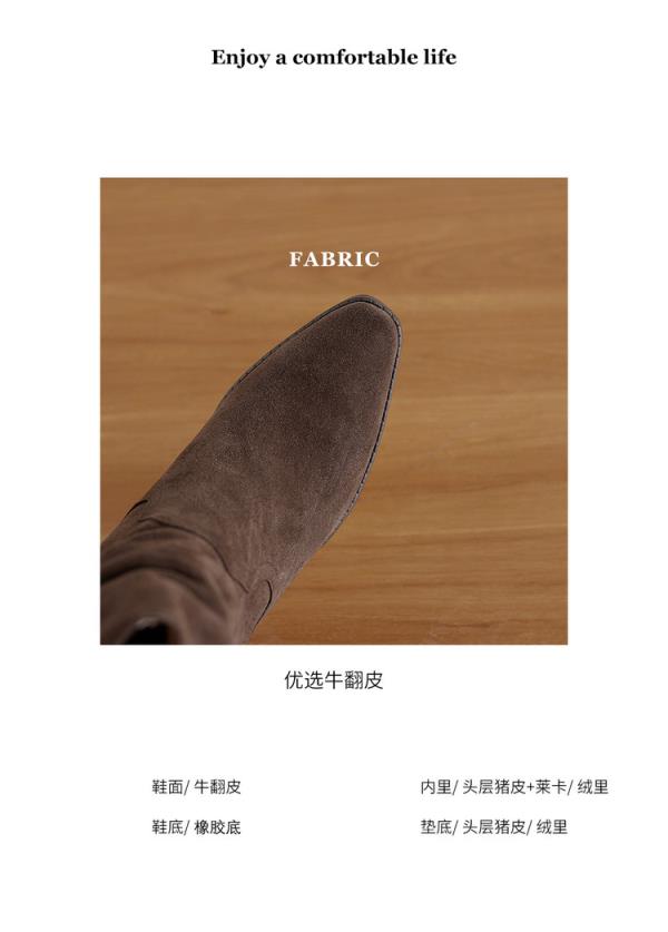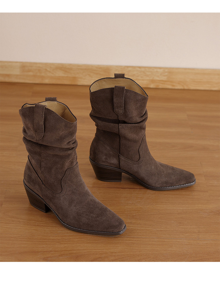 【预售5天】高跟马丁靴女秋冬季绒面复古V口高跟小个子尖头堆堆小短靴HB&1505