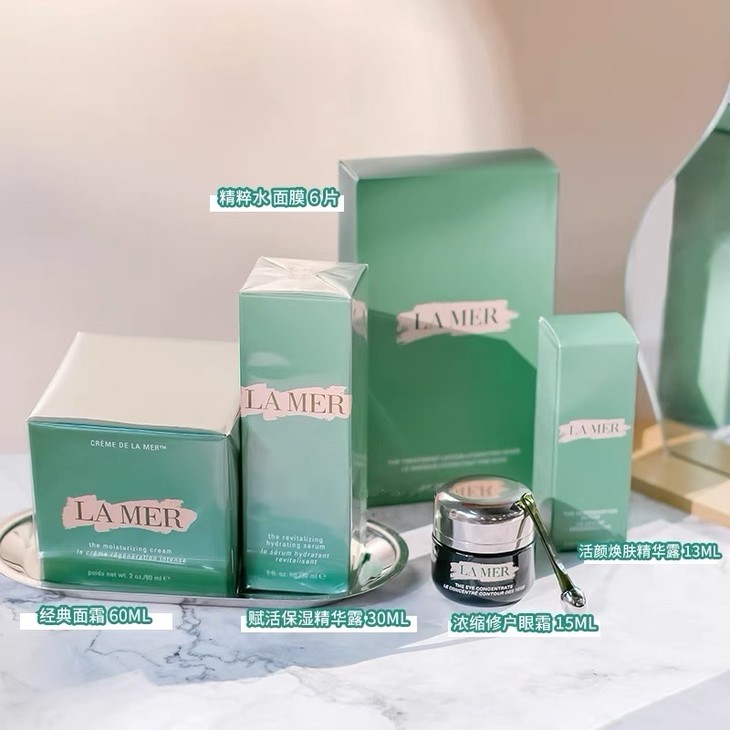 LA MER五件套👍全新新春五件套,样样都是精品‼️炸了炸了💥💥‼️纵横江湖多年的经典面霜😎,经典中的经典,维稳超给力,保湿滋润、修护屏障、抗老,对痘印效果真的可以用惊人来形容了😱!保湿精华露含品牌灵魂成分,密集修护滋养干燥肌💦。活颜焕肤精华露集舒缓➕修复➕紧致三大功效于一身。全效眼霜👀含三种不同形式的活性精华,无敌!盲入也不会出错! 【套装包括】经典面霜60ml、赋活保湿精华露30ml、活颜焕肤精华露13ml、浓缩修护眼霜15ml、精粹水面膜6片(127499)