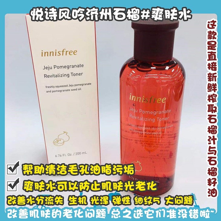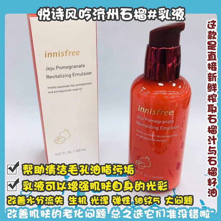 悦诗风吟济州石榴#爽肤水/#乳液👍这款是直接新鲜榨取的济州岛🇯🇵生石榴汁与清纯石榴籽油的哦,帮助改善轻老化引起的水分流失💧,生机,光泽,弹性,细纹5️⃣大问题。对于去除肌肤老废角质,细小粉尘有良好的清洁效果♻,帮助清洁毛孔油脂污垢💆。爽肤水可以防止肌肤光老化☀,比如晒伤、黑斑呀之类的,促进胶原蛋白生长,提升弹性🔝。乳液可以增强肌肤自身的光彩✨,改善肌肤的老化问题。👉总之选它们准没错啦~