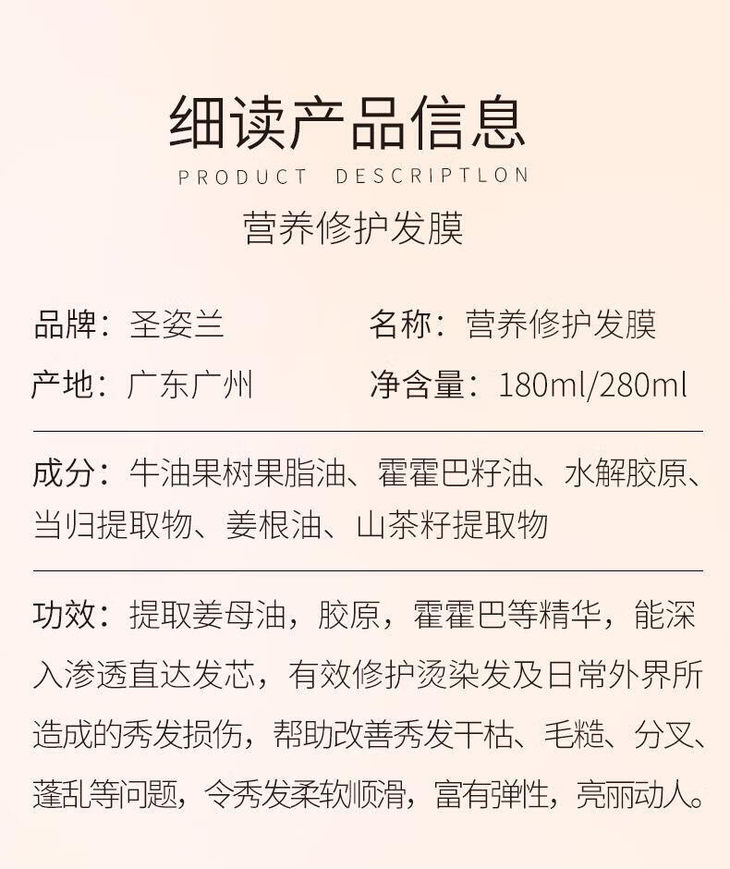 圣姿兰营养修护发膜护发素修护干枯女柔顺顺滑改善毛躁护理染烫 180g标准