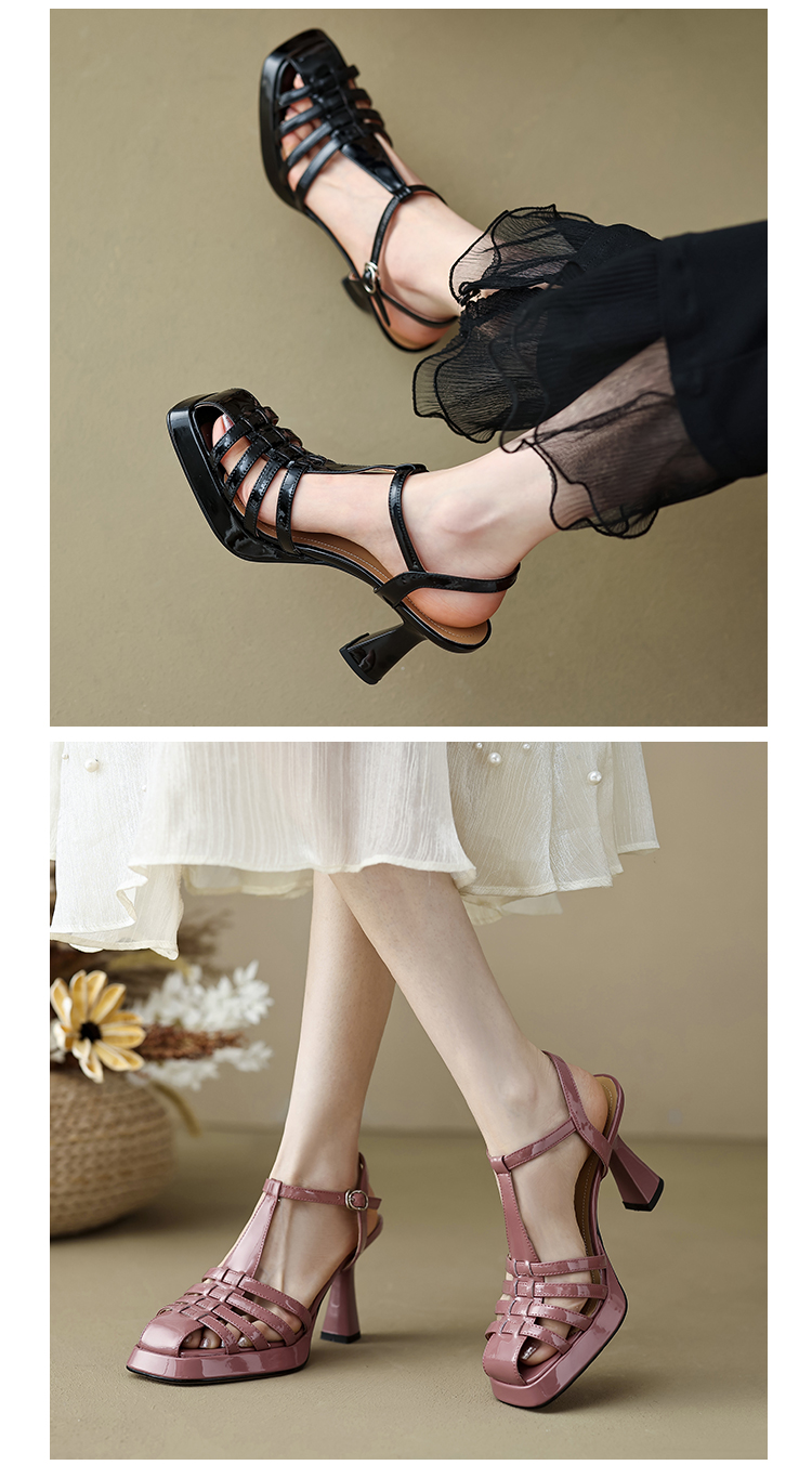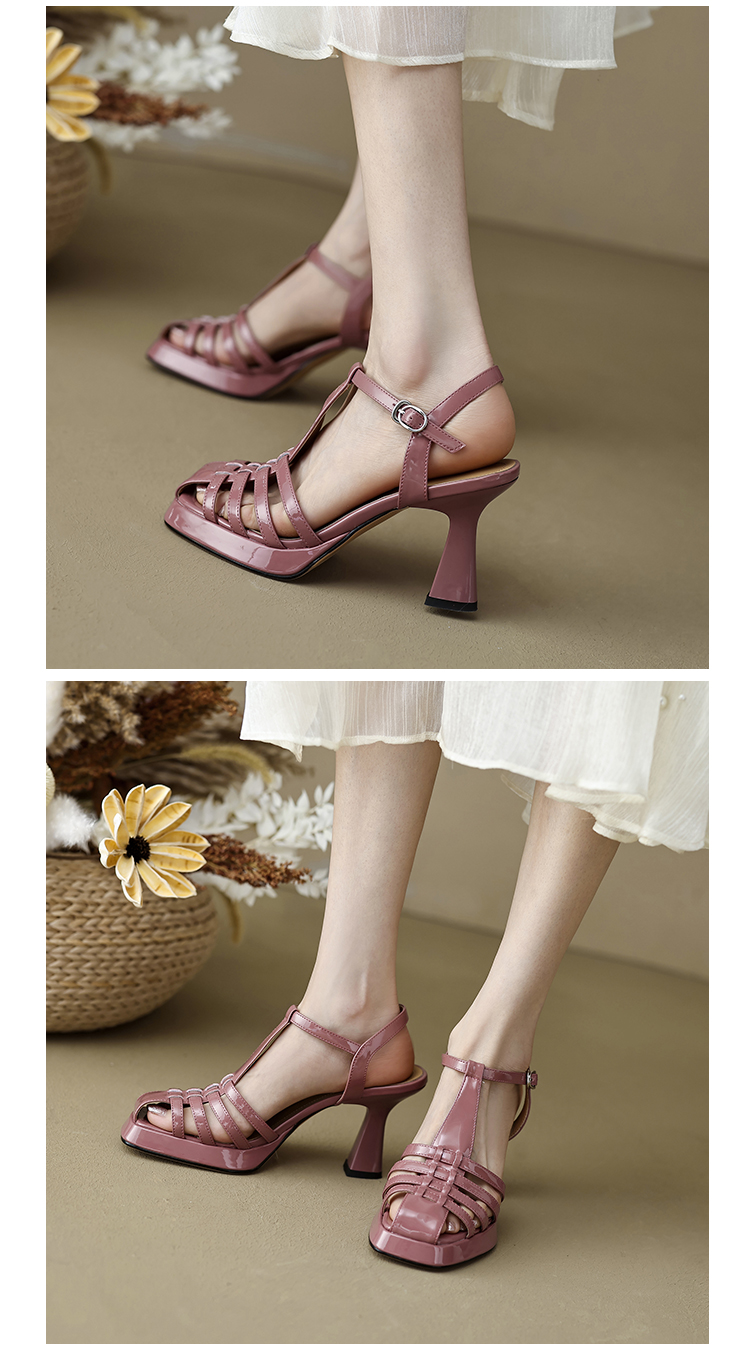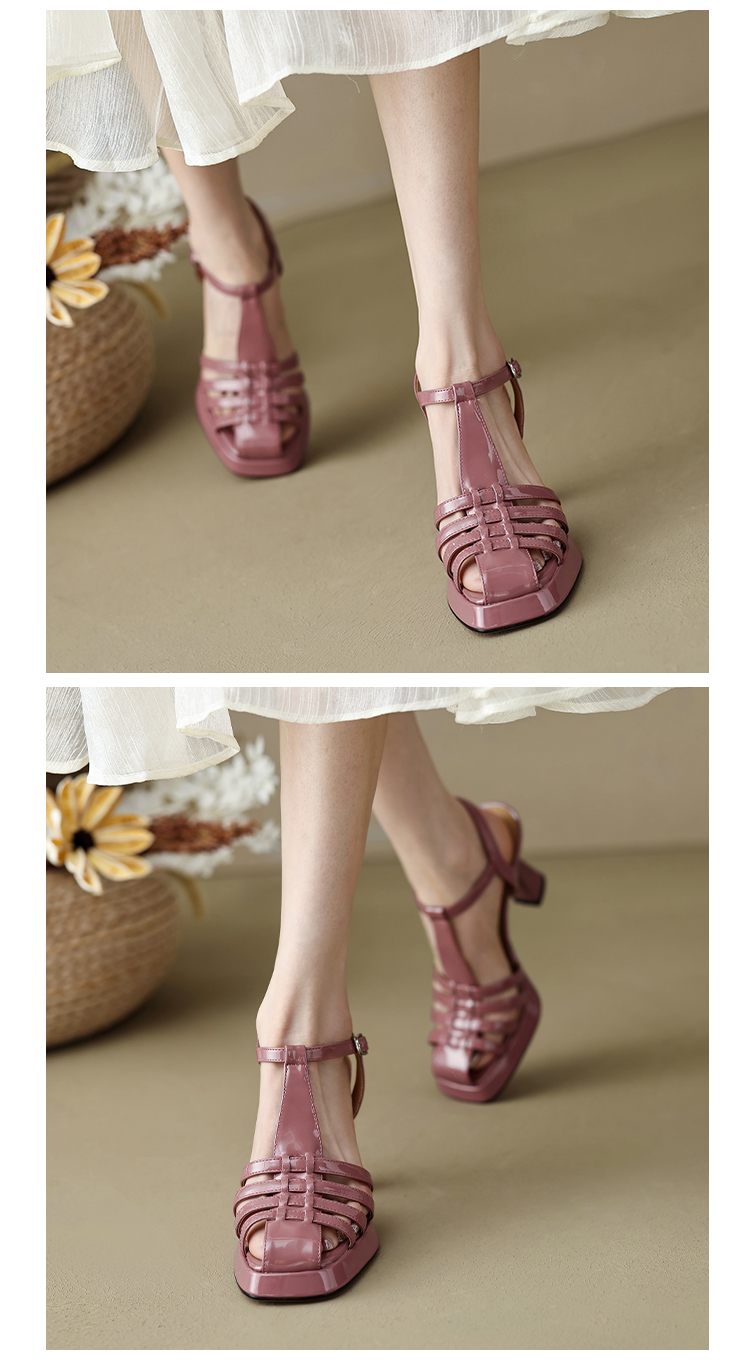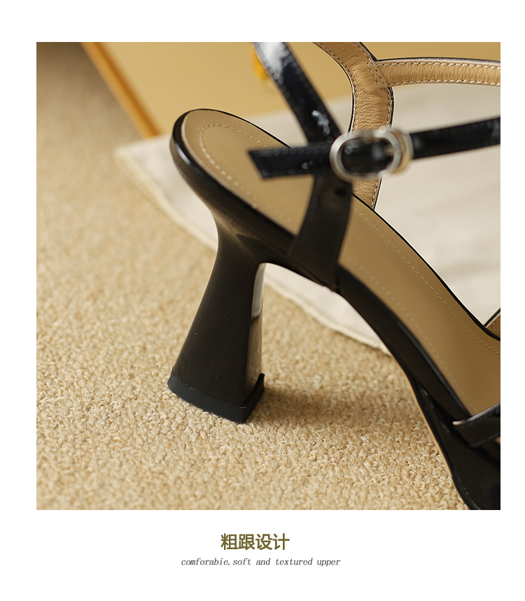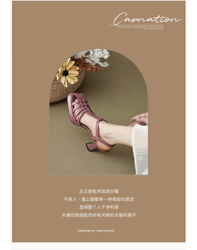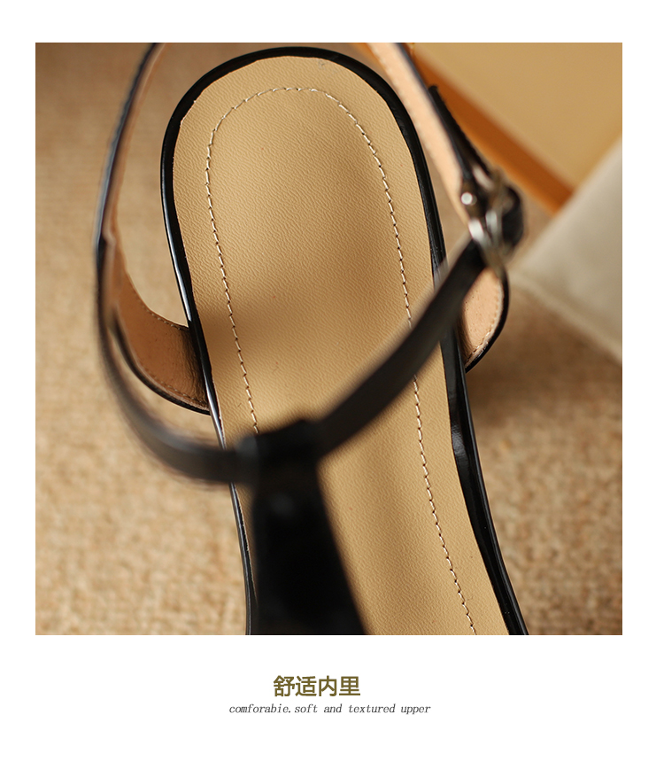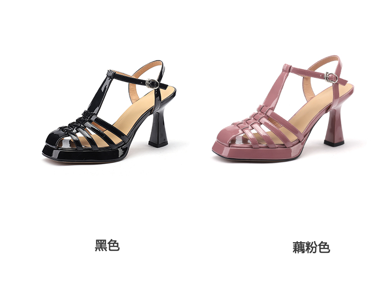 时尚休闲,真皮T型扣带粗跟高跟凉鞋DZM-2349