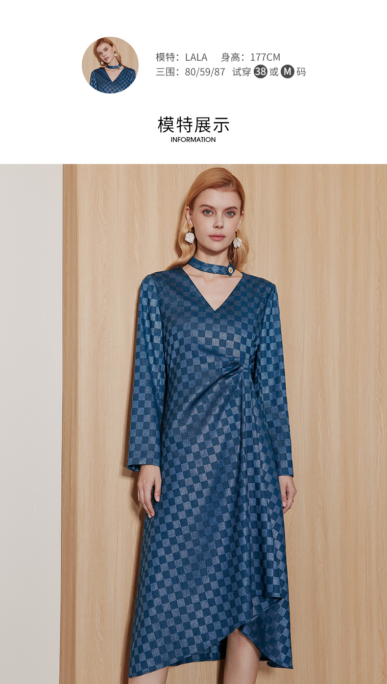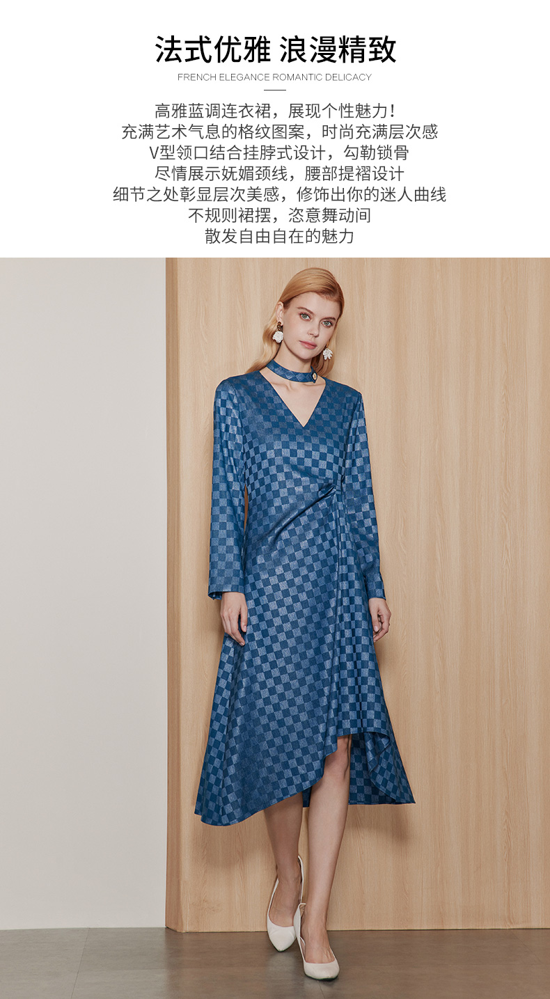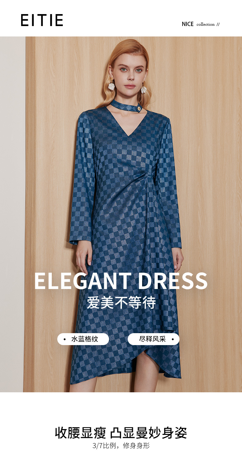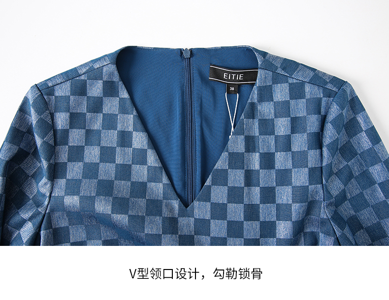 EITIE爱特爱时尚V领不规则设计收腰显瘦格纹蓝色连衣裙秋季新款C07218
