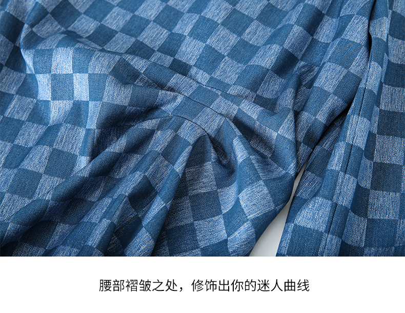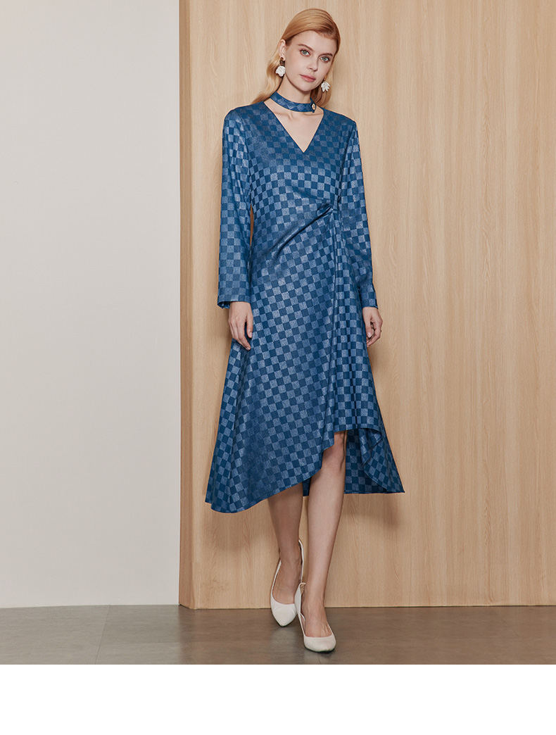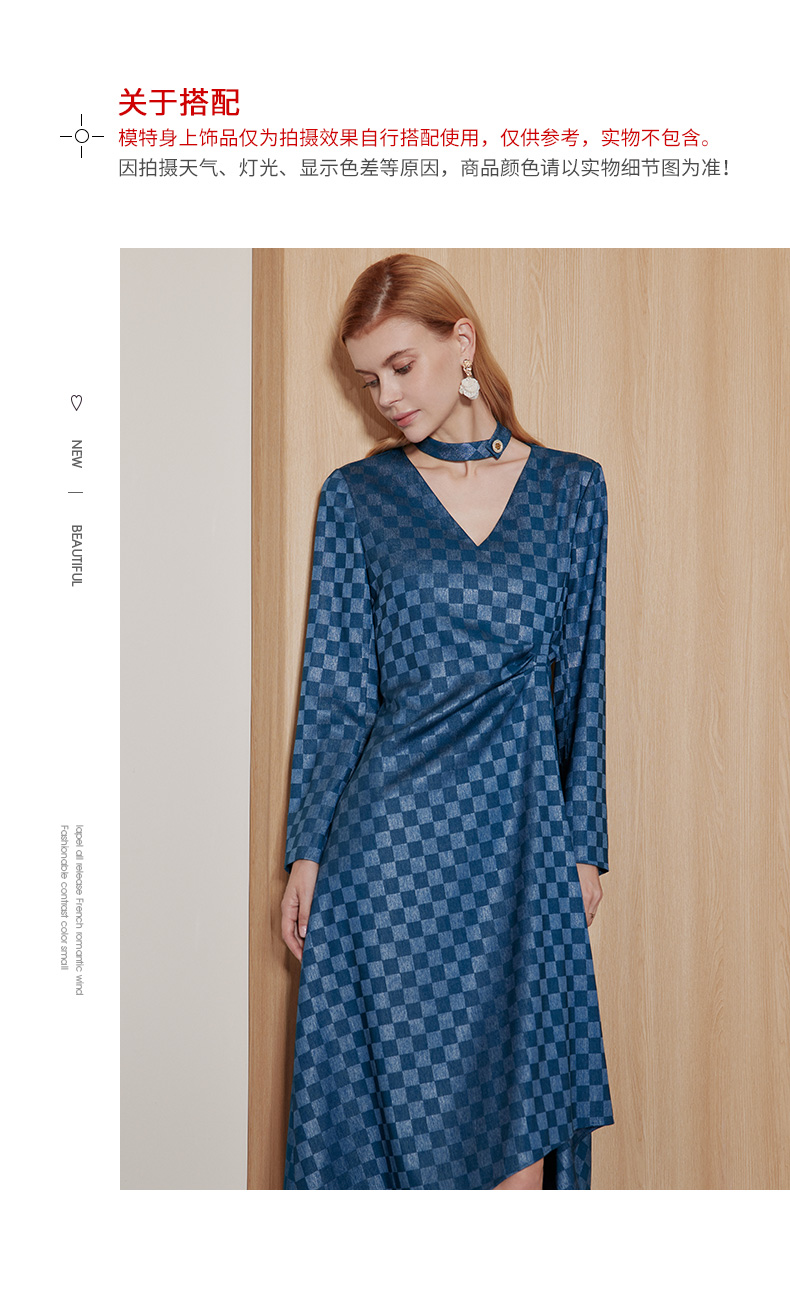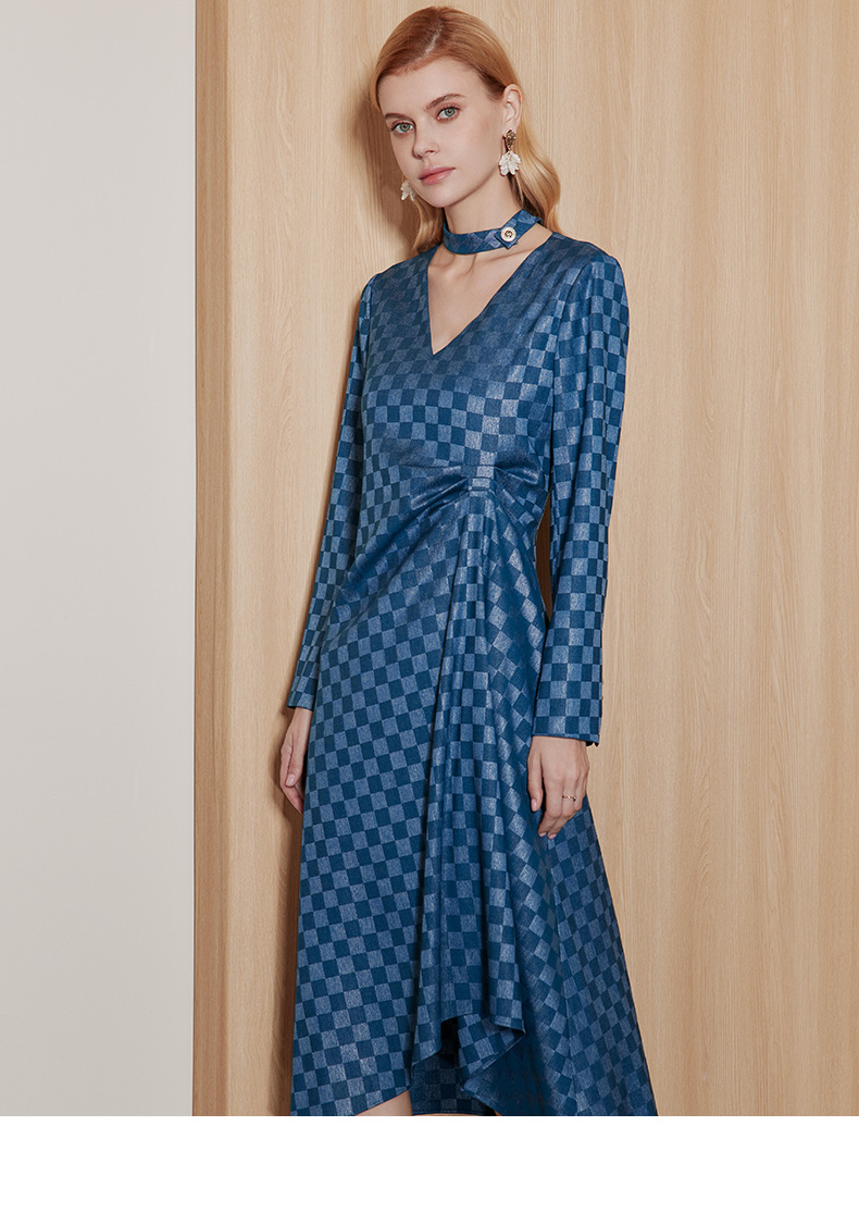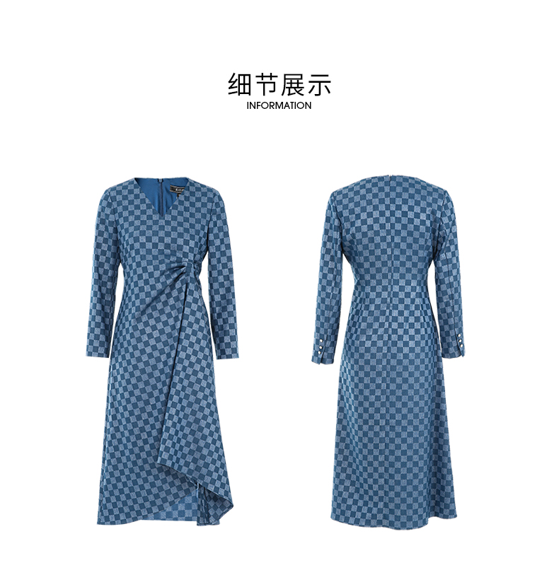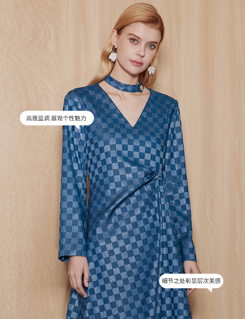 EITIE爱特爱时尚V领不规则设计收腰显瘦格纹蓝色连衣裙秋季新款C07218