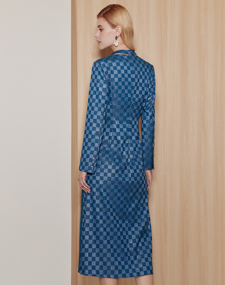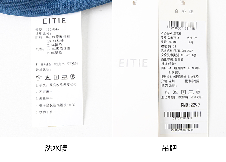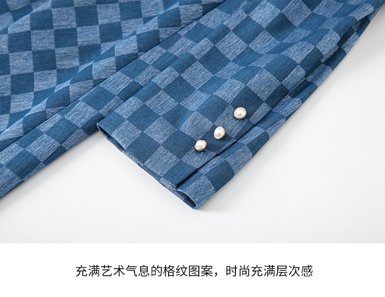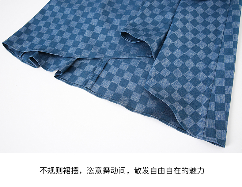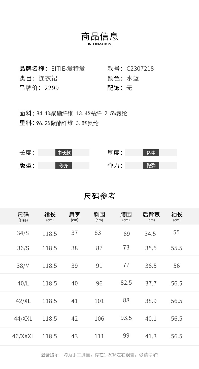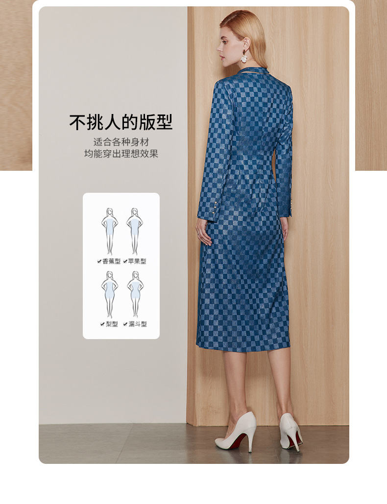 EITIE爱特爱时尚V领不规则设计收腰显瘦格纹蓝色连衣裙秋季新款C07218