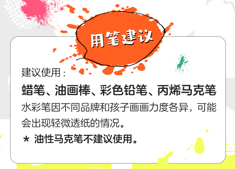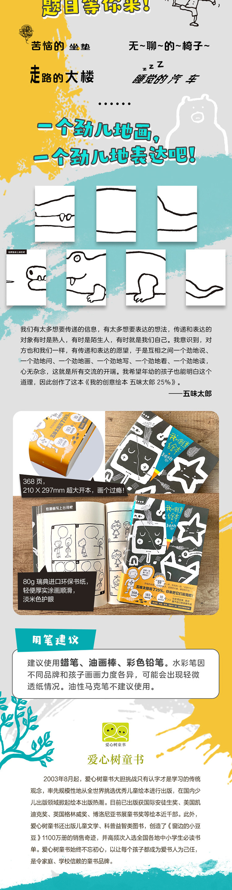 本书包含近200多个绘画命题,厚368页,书打开后是A3大开本。极大满足孩子的表达和创作欲望。