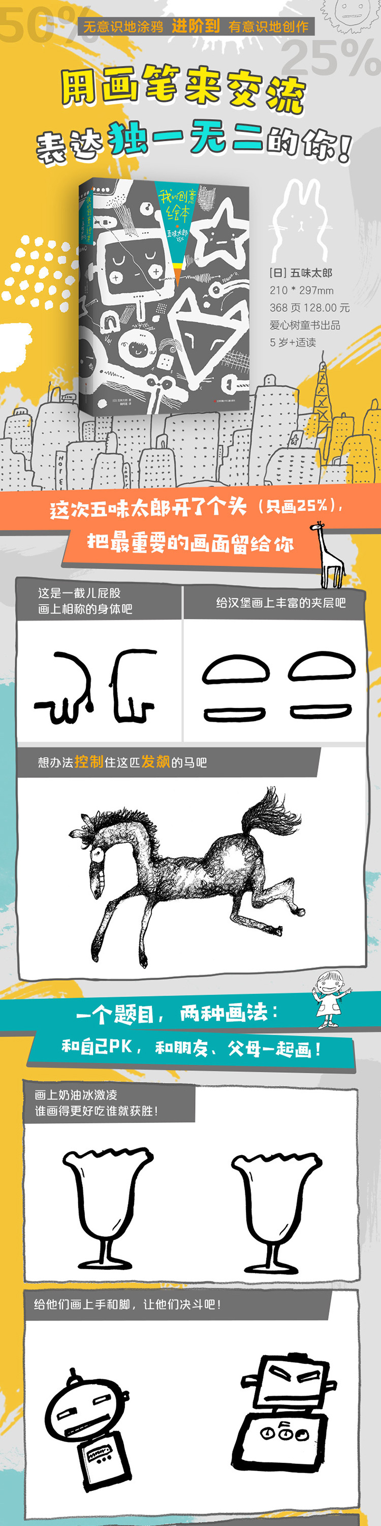 这本书中,五味太郎先画了25%。与《五味太郎50%》相比,他为孩子留出了更大的发挥空间,命题的启发性更强,挑战起来也更有趣。
