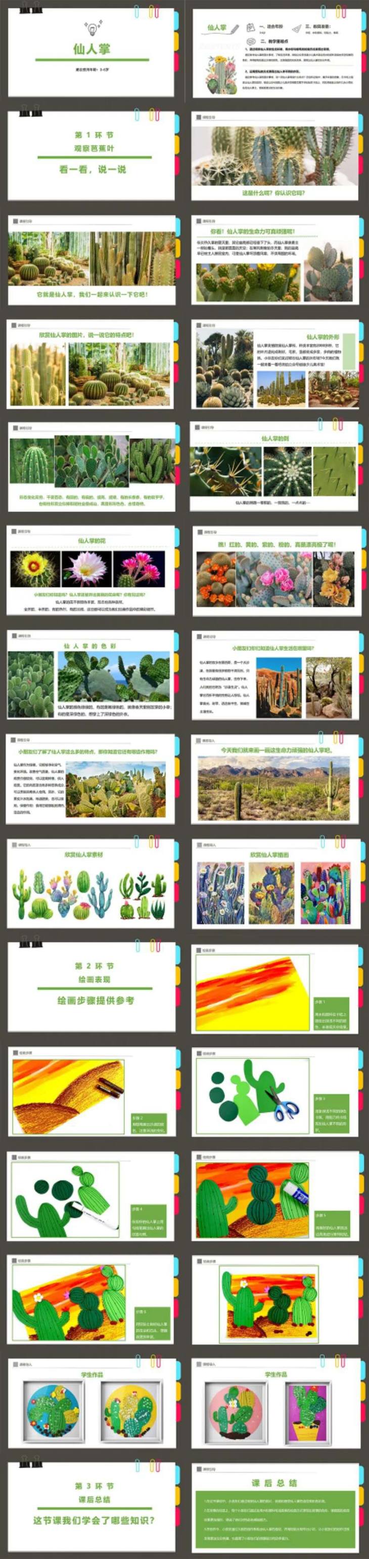 通过参考仙人掌的图片素材,说一说仙人掌有些什么特点?在创作过程中,展开丰富的想象,在卡纸上描绘出仙人掌的造型,微信公众号创意少儿美术馆用剪刀剪下来粘贴在卡纸上,然后用轻黏土制作几朵小花粘贴在仙人掌上,使画面更加的生动形象。